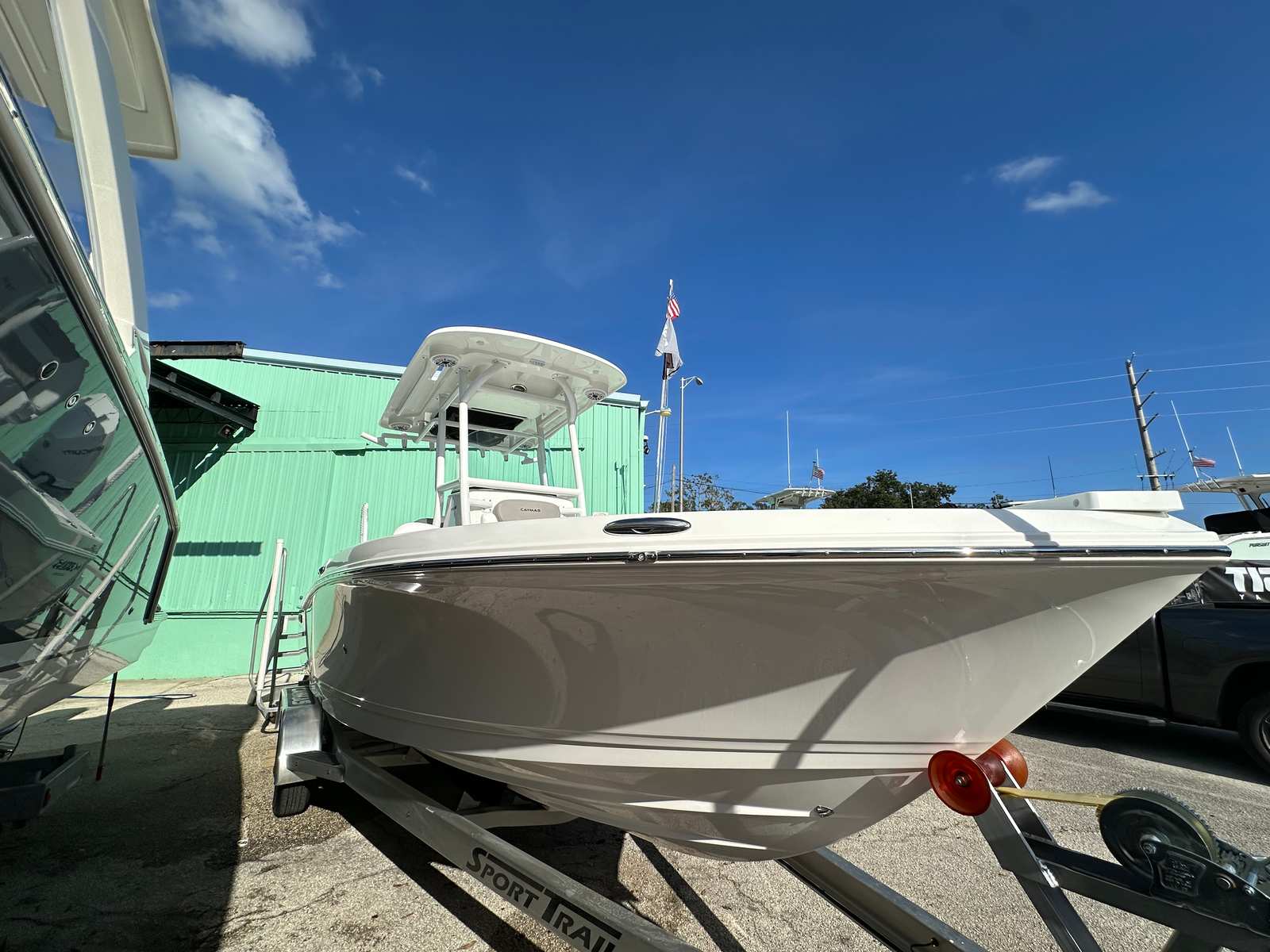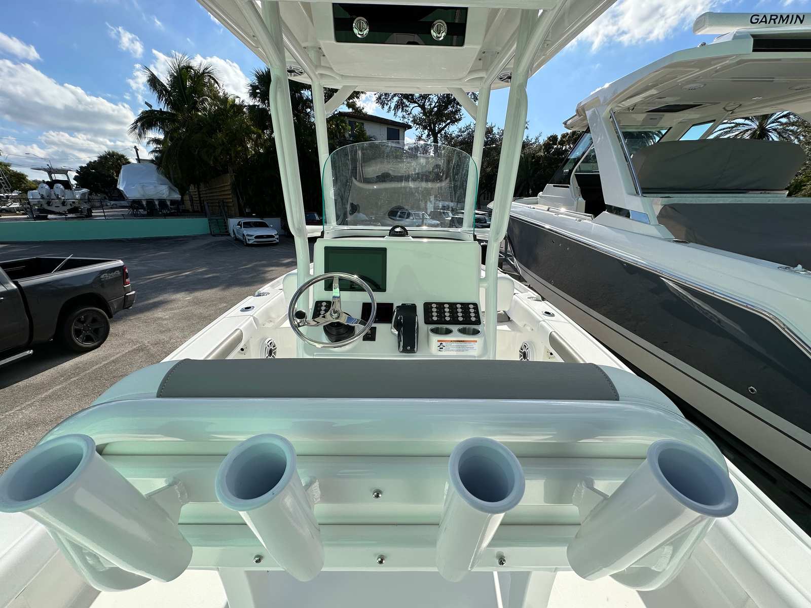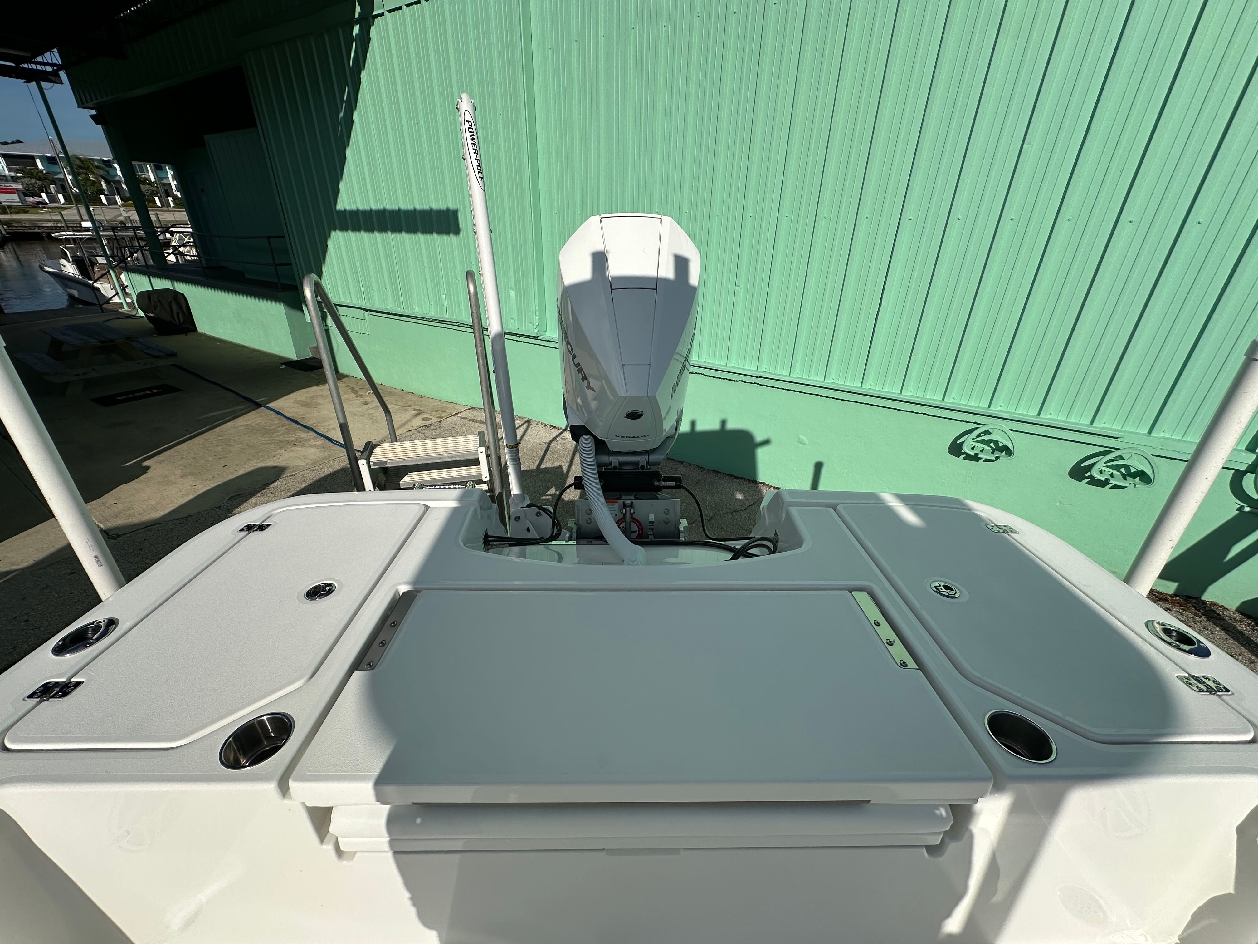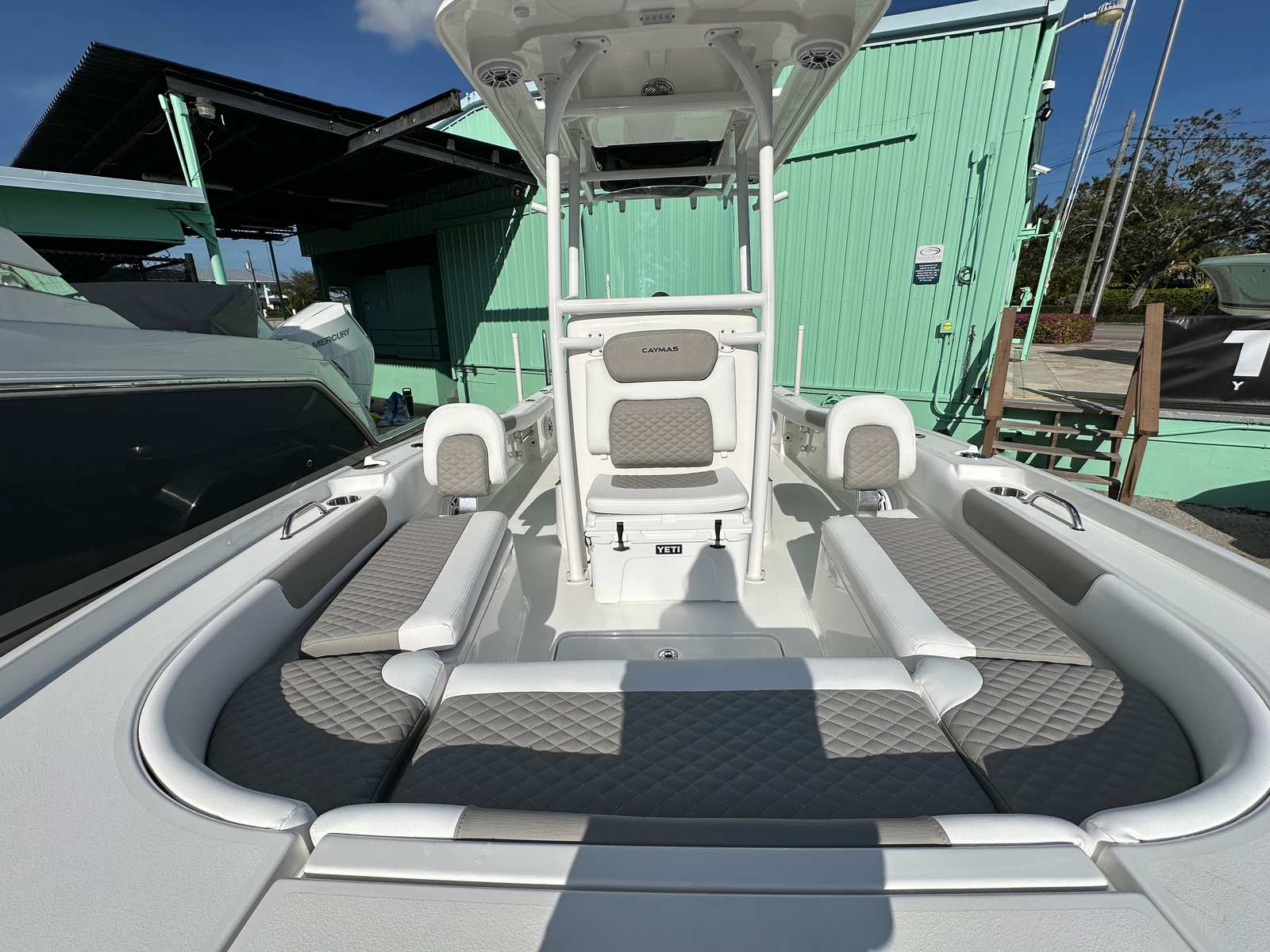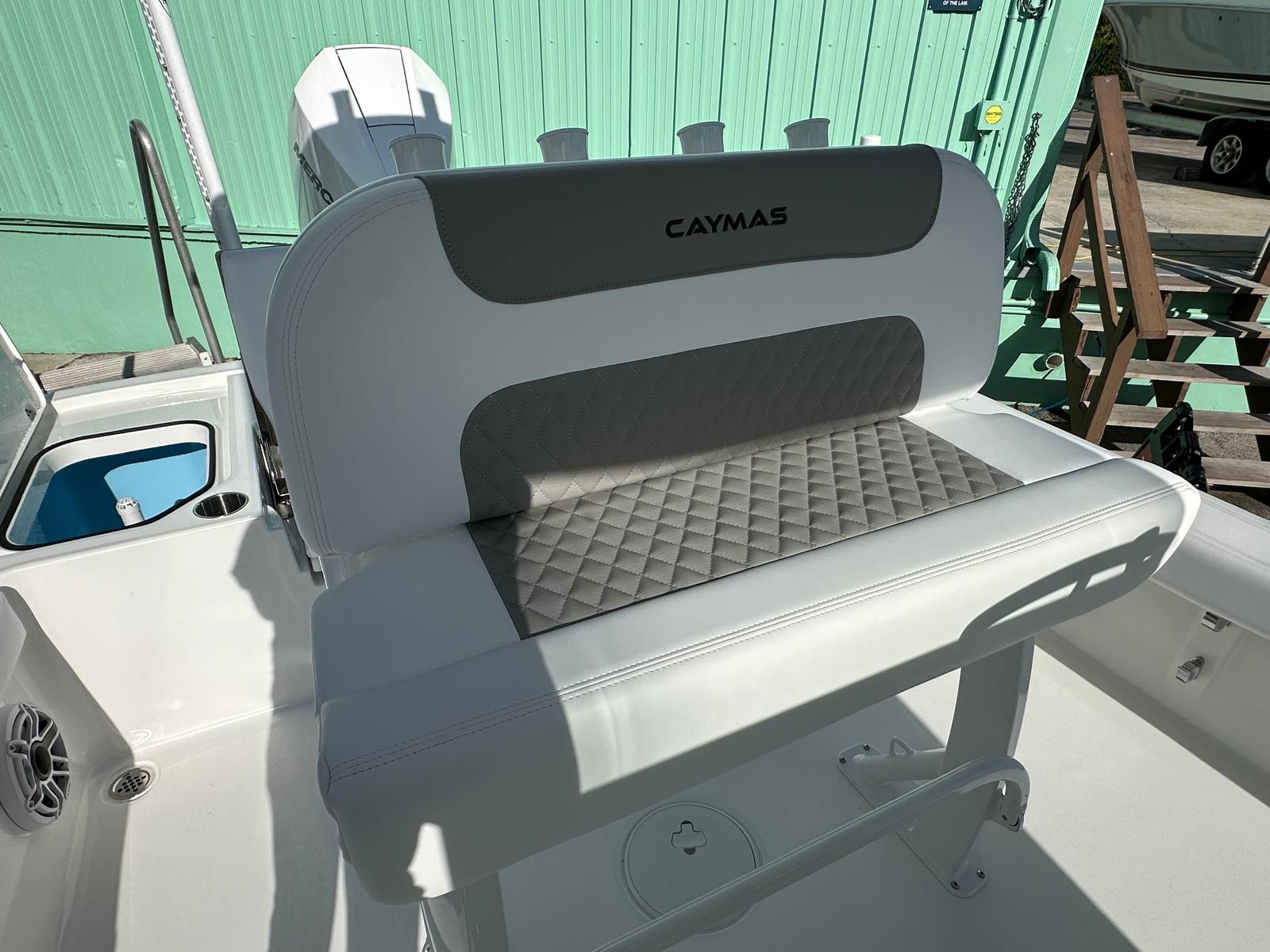 This Caymas boat for sale is loaded with premium features that enhance both functionality and enjoyment. The trolling motor pre-rig allows for easy installation of your preferred trolling motor, perfect for anglers who demand precision and control. An added house battery for the standard panel provides reliable power for all your onboard electronics, ensuring you stay connected and in command.Topside screw mount stainless steel rod holders offer secure and convenient storage for your fishing gear, while the fiberglass hardtop with a powder-coated frame provides shade and protection from the elements. The Fusion MS-RA670 head unit replaces the JL MM105, delivering superior audio quality and seamless connectivity for your favorite playlists. For those who appreciate premium sound, the JL Audio upgrade package #1 takes your onboard entertainment to the next level.The Power Pole Blade Series 10’ in white, mounted on the starboard side, offers unmatched anchoring capability, allowing you to hold your position with ease in shallow waters. The freshwater system ensures you have access to clean water for rinsing off after a swim or cleaning your catch. The plumb port-side livewell keeps your bait and catch fresh throughout the day, making this center console boat a true angler’s dream.