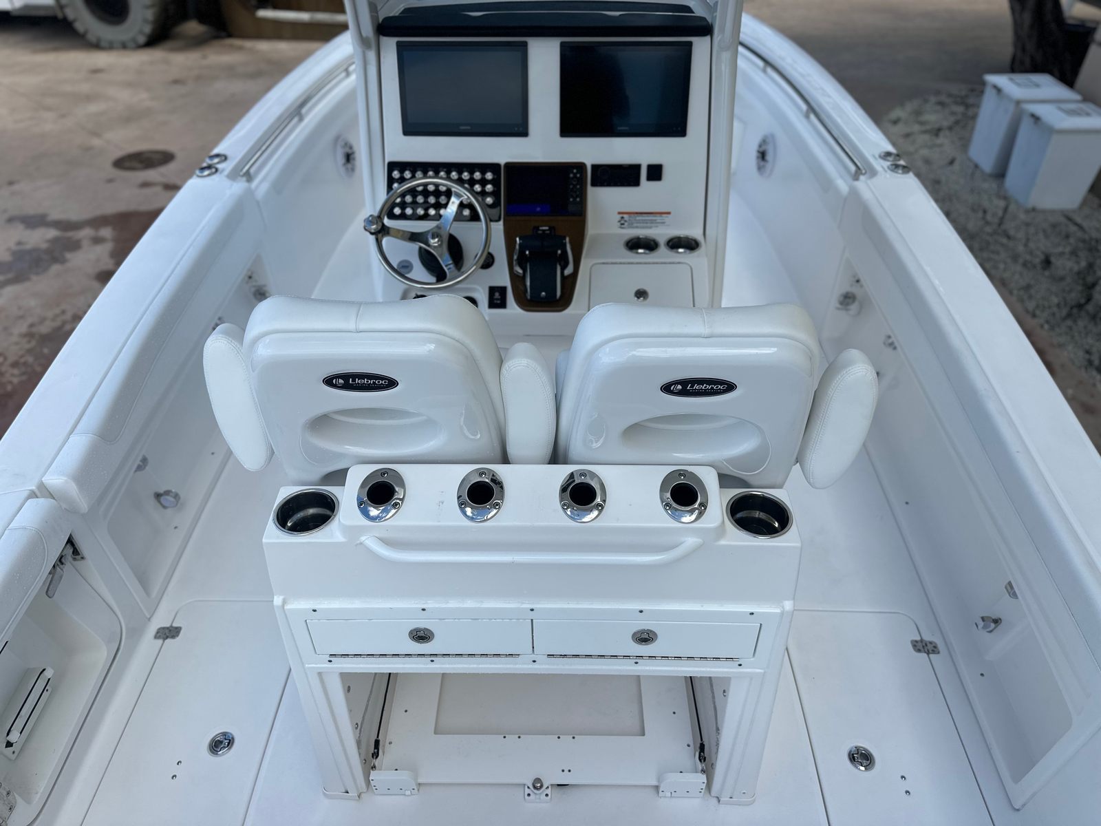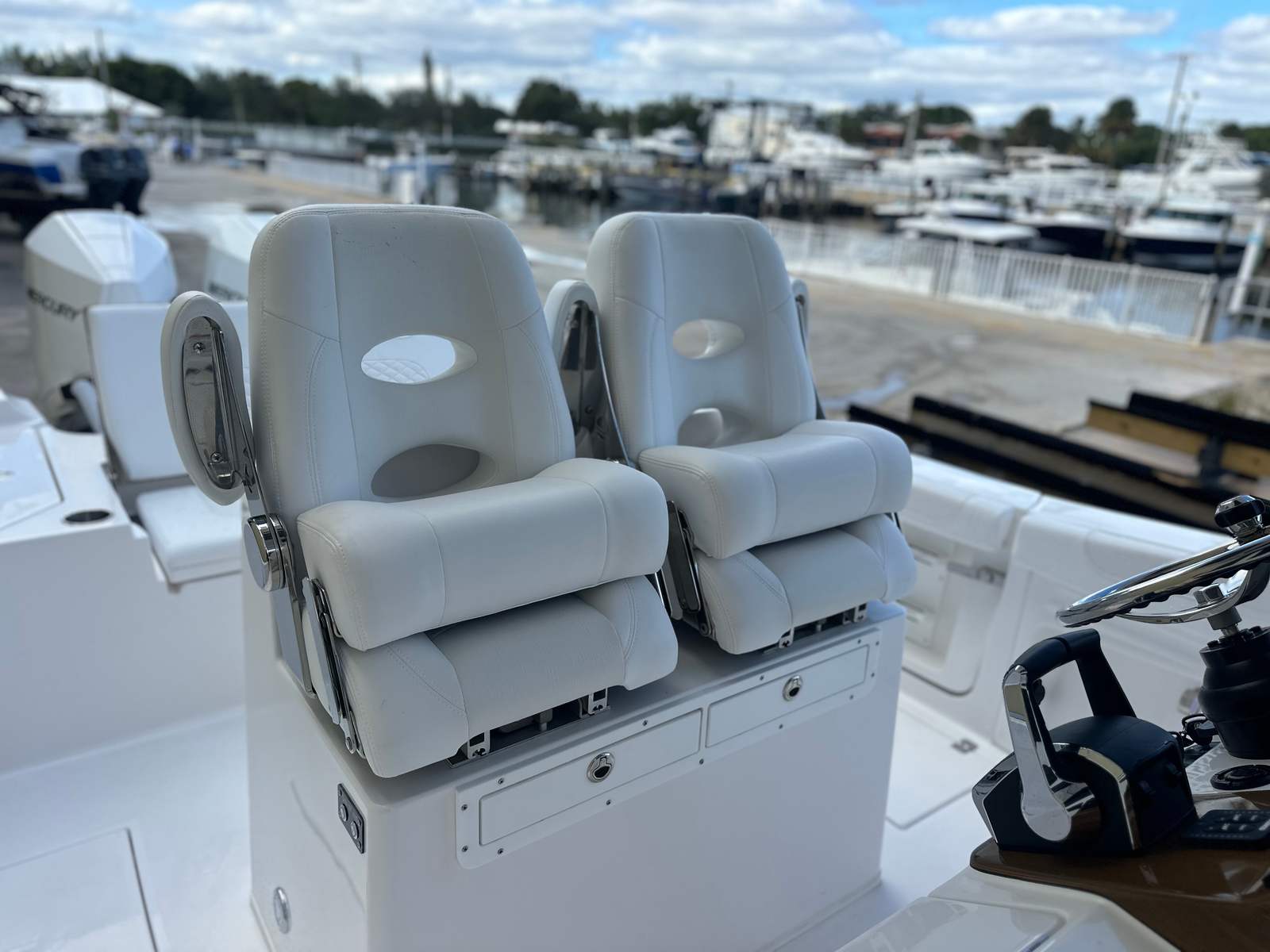 The Caymas 291 HB Center Console is loaded with premium features that elevate your boating experience. The motorized battery switches provide effortless power management, ensuring your boat’s systems are always ready when you are. Topside screw mount stainless steel rod holders offer secure and convenient storage for your fishing gear, making this center console boat for sale a top pick for serious anglers.For comfort and convenience, the marine porcelain head with blackwater tank offers a practical solution for longer trips, while the Fusion MS-RA670 head unit delivers high-quality audio entertainment, enhancing every outing with your favorite tunes. Underwater lights add a touch of elegance and visibility during evening cruises, creating a captivating atmosphere both above and below the waterline.The starboard swim platform with a folding boarding ladder makes water access easy and safe, whether you are swimming, snorkeling, or reboarding after a day of water sports. The windlass system simplifies anchoring, allowing you to secure your position effortlessly in any location. The all-white upholstery exudes sophistication and is easy to maintain, while the Captain Chair Fiberglass Leaning Post with Llebroc helm chairs provides unmatched comfort and support for long days at the helm.