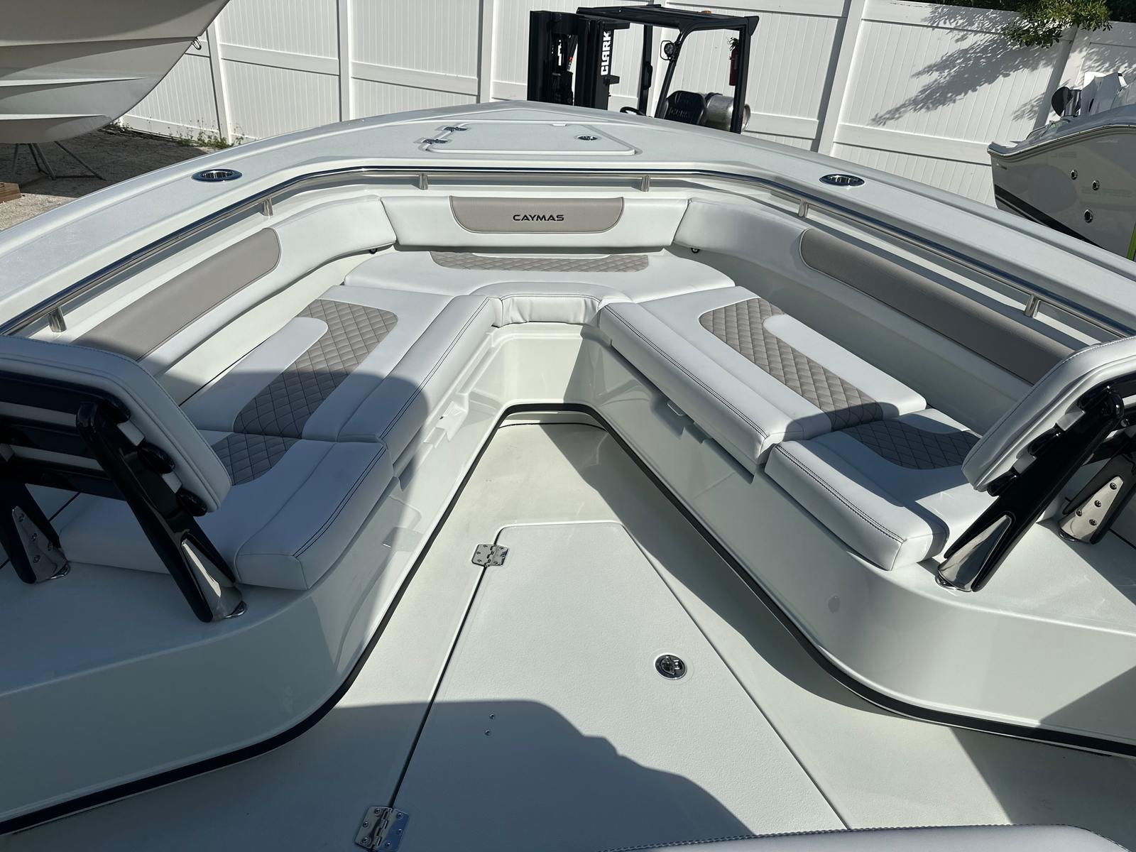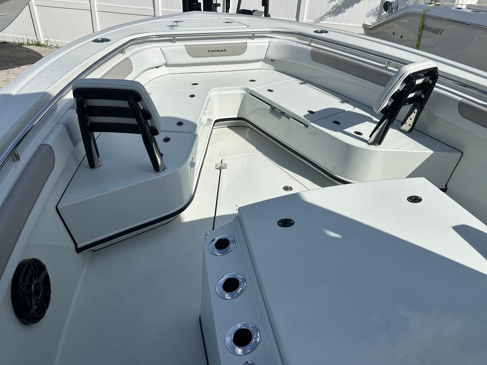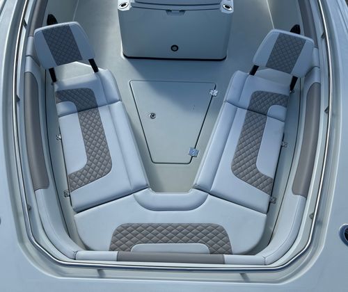 This center console boat for sale is loaded with premium features designed to enhance your time on the water. The captain chair fiberglass lean post with Release Marine seating in white and grey offers superior comfort and support, ensuring long days on the water are enjoyable for both captain and crew. The Surf / Turf Package in gray adds a touch of style and functionality, while the gloss black powder coating provides a sleek, modern finish that is as durable as it is eye-catching.The Mot dual battery switch panel ensures reliable power management, giving you peace of mind during extended outings. The port and starboard platforms, each equipped with a ladder, make boarding and swimming effortless for everyone on board. The freshwater system with a shower head adds a touch of luxury, allowing you to rinse off after a swim or a day of fishing.For the serious angler, the Caymas 291 HB features Gemlux upgraded rod/cup holders and steel rod holders, providing secure and convenient storage for your gear. These enhancements are designed to keep your equipment organized and within easy reach, so you can focus on the thrill of the catch.