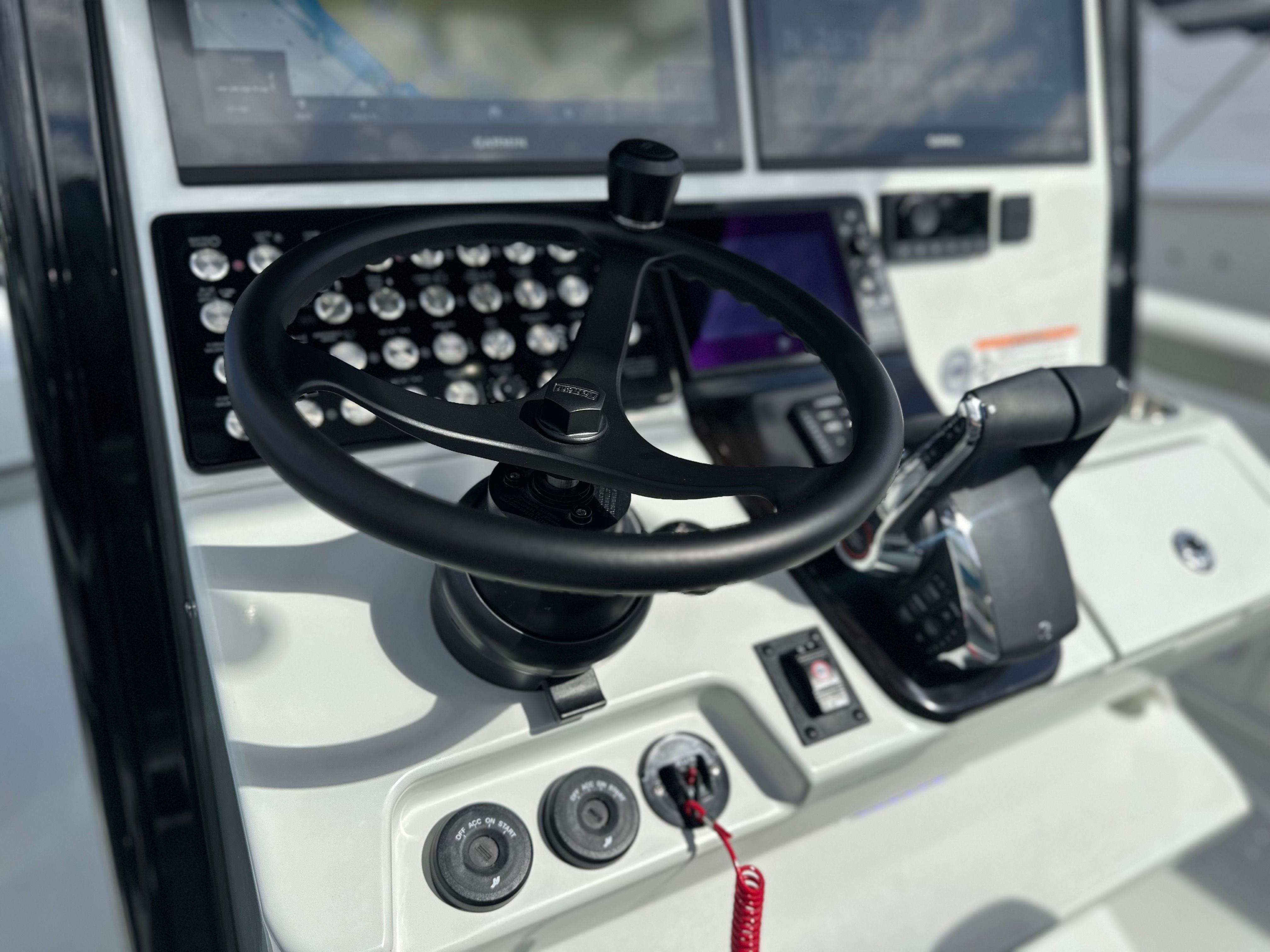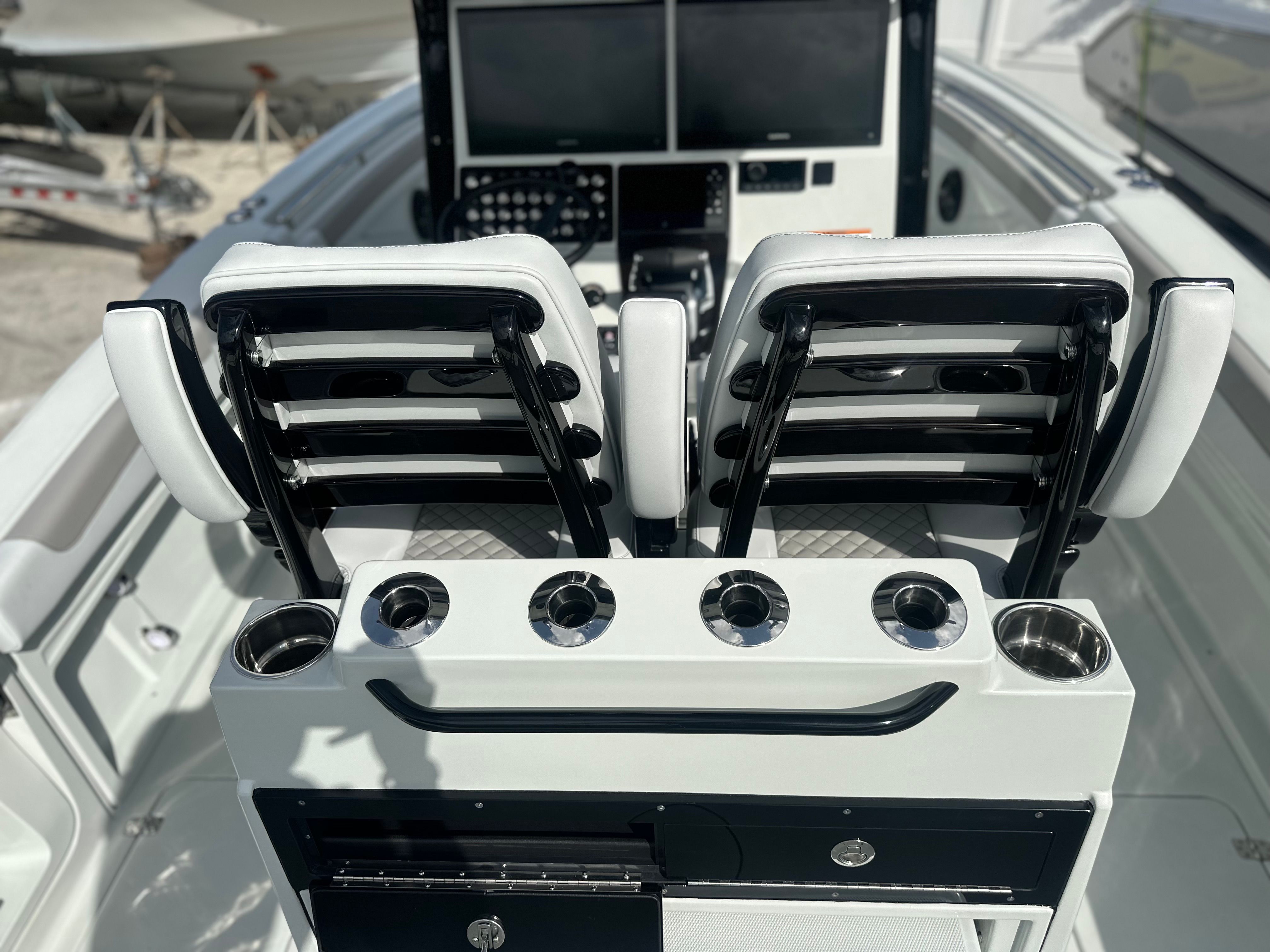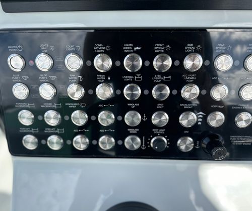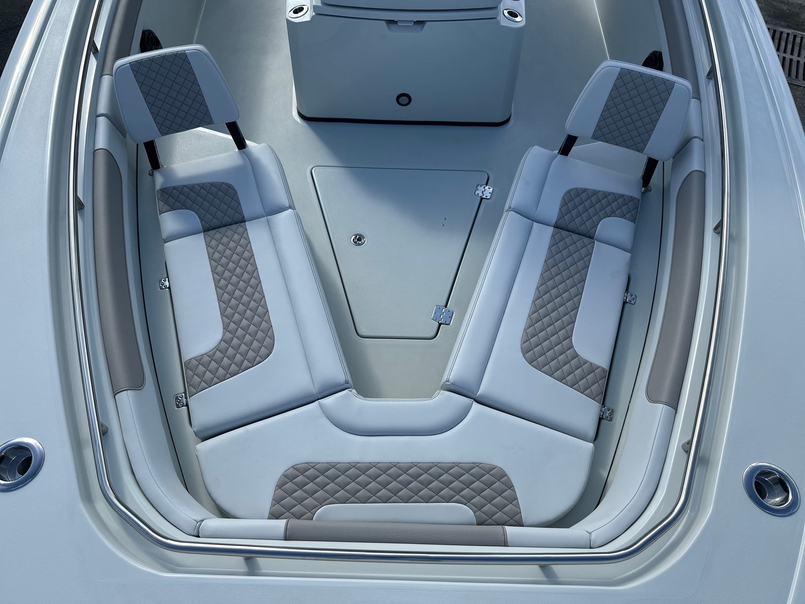 This center console boat for sale is loaded with premium features designed to enhance your time on the water. The captain chair fiberglass lean post with Release Marine seating in white and grey offers superior comfort and support, ensuring long days on the water are enjoyable for both captain and crew. The Surf / Turf Package in gray adds a touch of style and functionality, while the gloss black powder coating provides a sleek, modern finish that is as durable as it is eye-catching.The Mot dual battery switch panel ensures reliable power management, giving you peace of mind during extended outings. The port and starboard platforms, each equipped with a ladder, make boarding and swimming effortless for everyone on board. The freshwater system with a shower head adds a touch of luxury, allowing you to rinse off after a swim or a day of fishing.For the serious angler, the Caymas 291 HB features Gemlux upgraded rod/cup holders and steel rod holders, providing secure and convenient storage for your gear. These enhancements are designed to keep your equipment organized and within easy reach, so you can focus on the thrill of the catch.