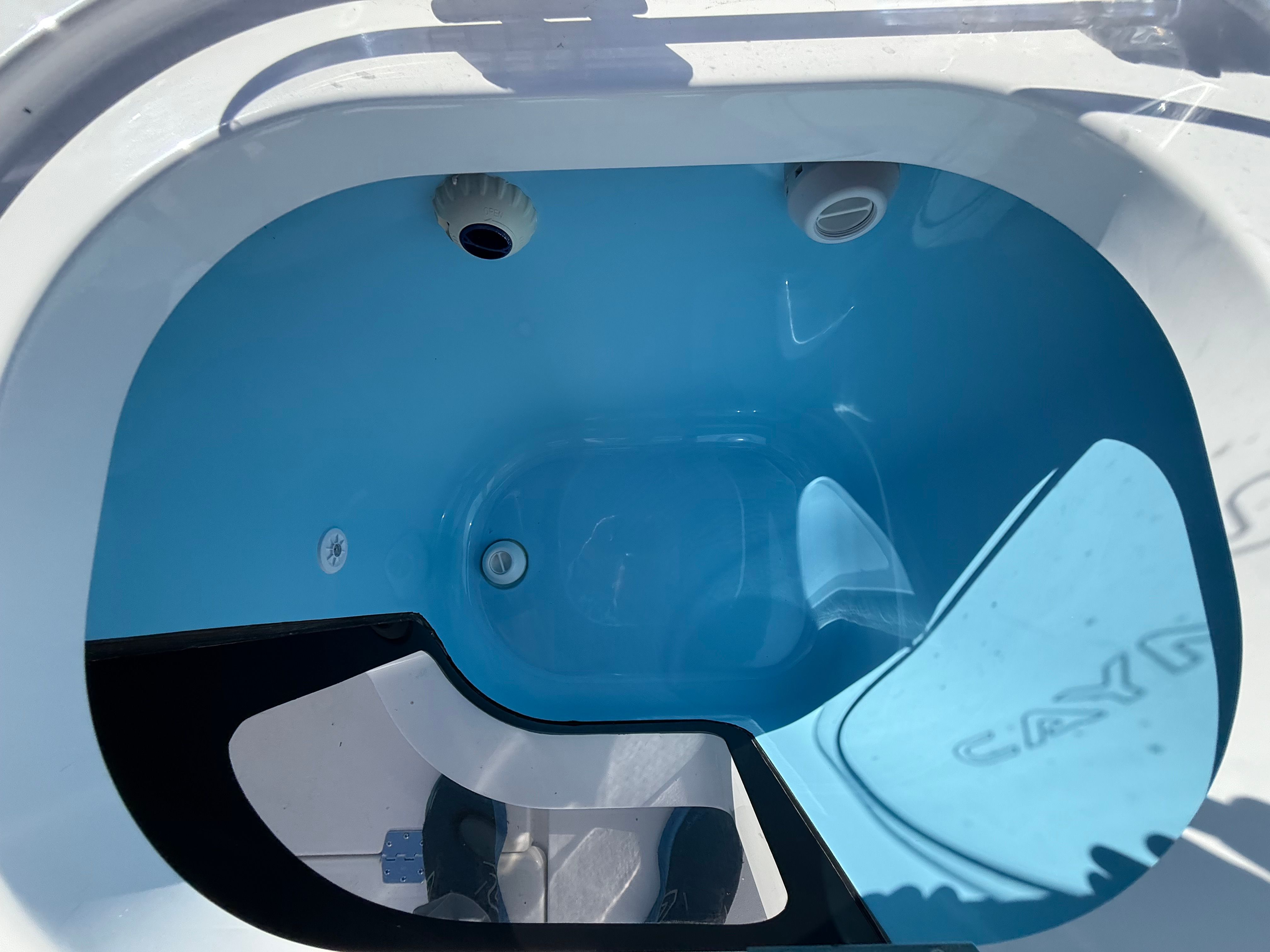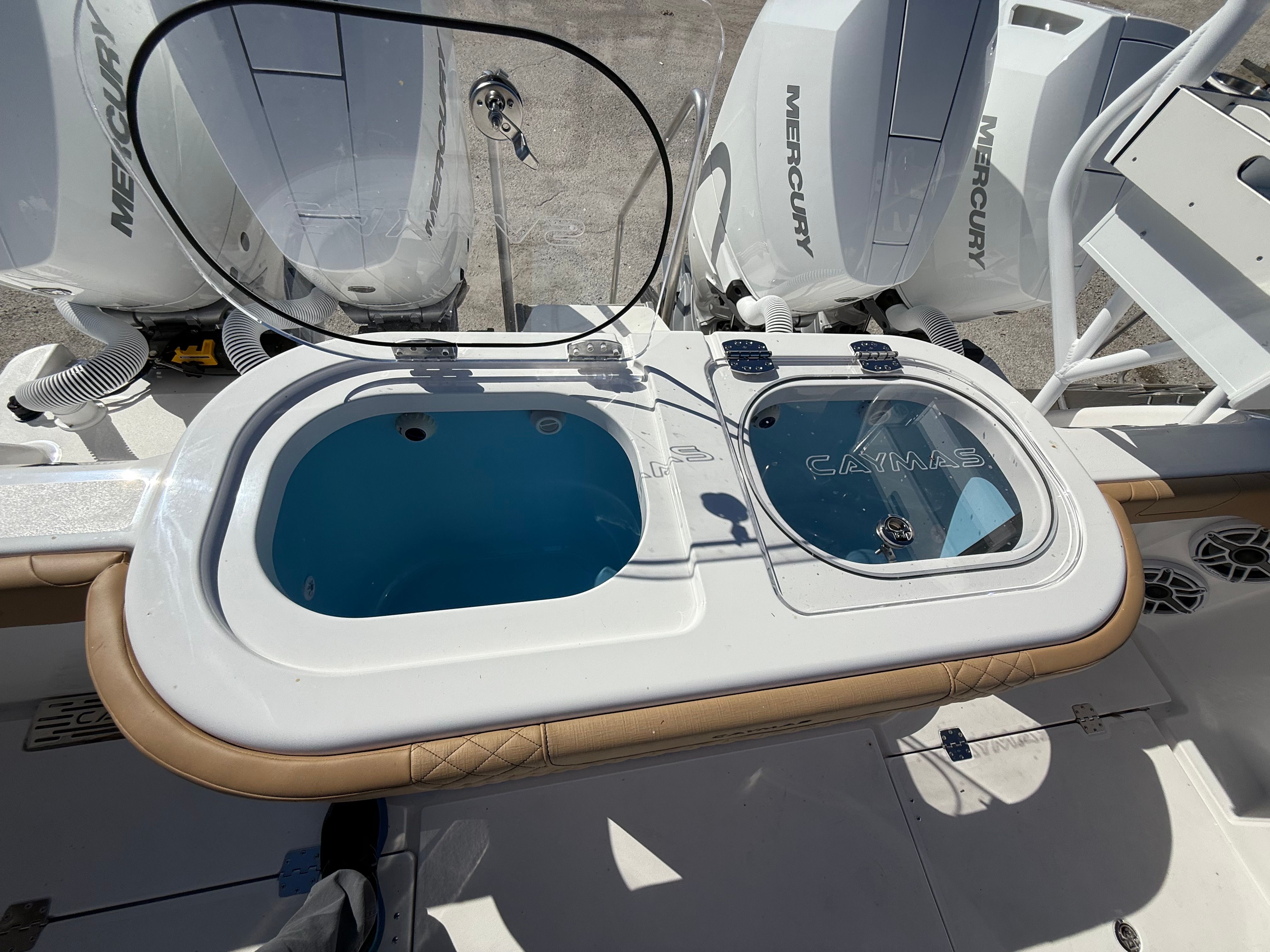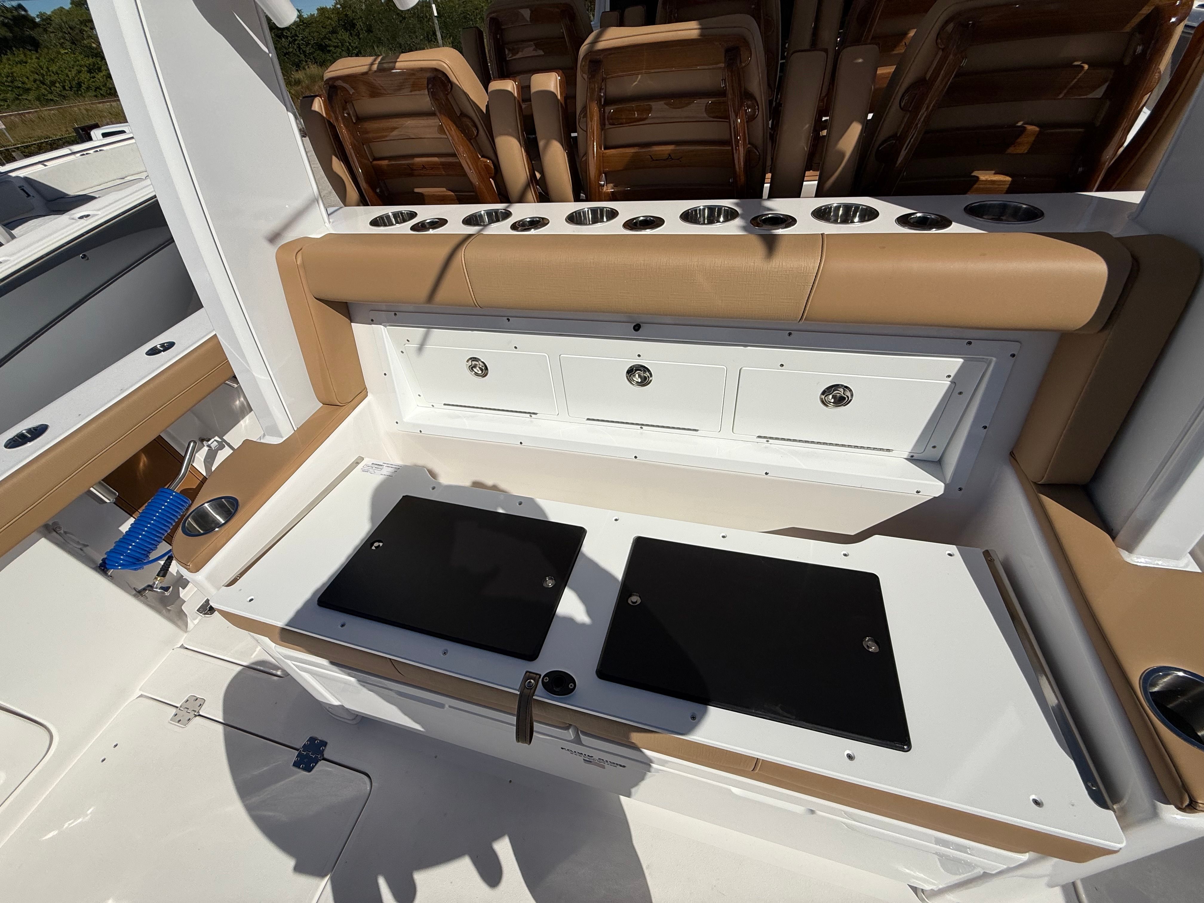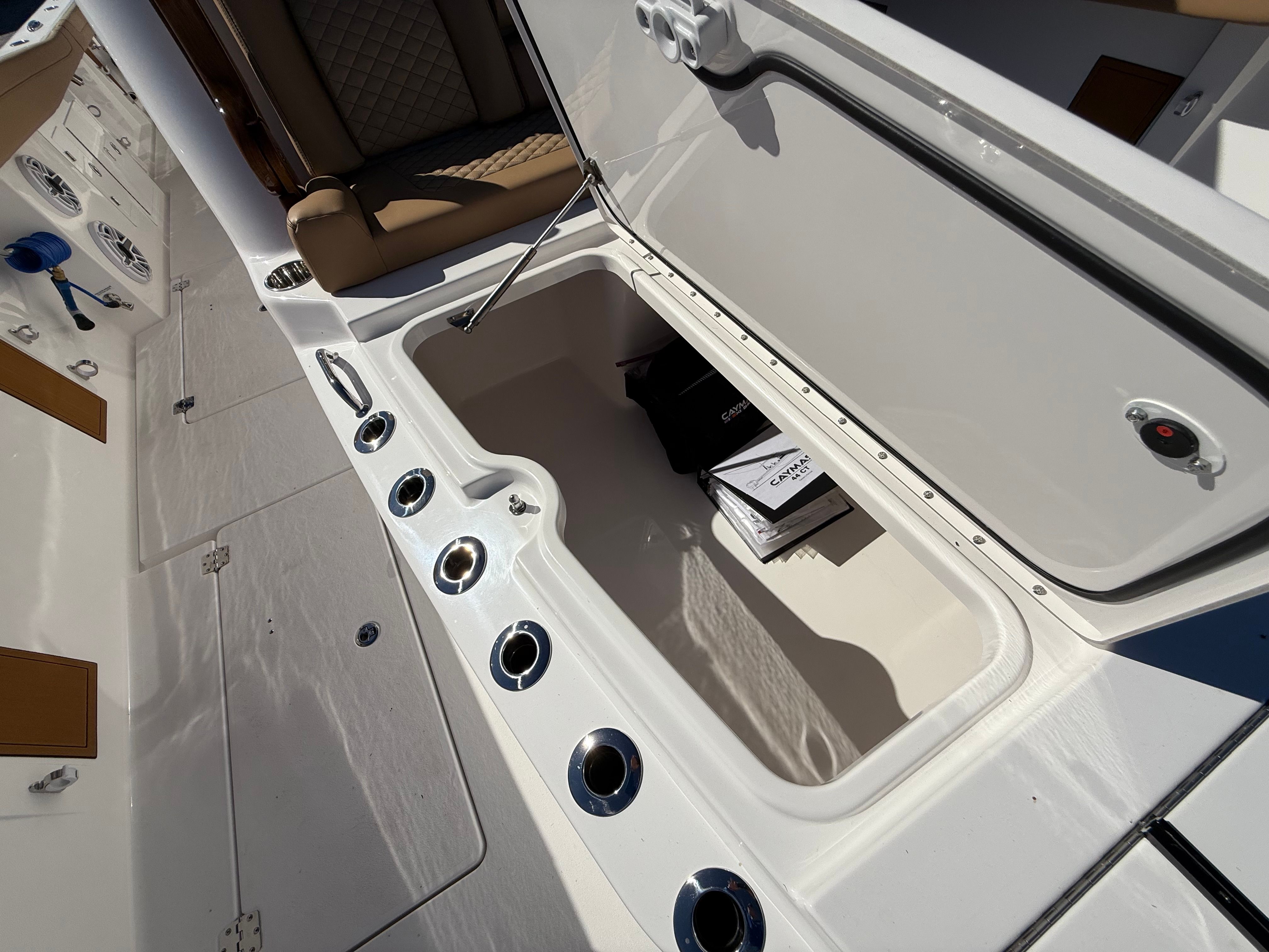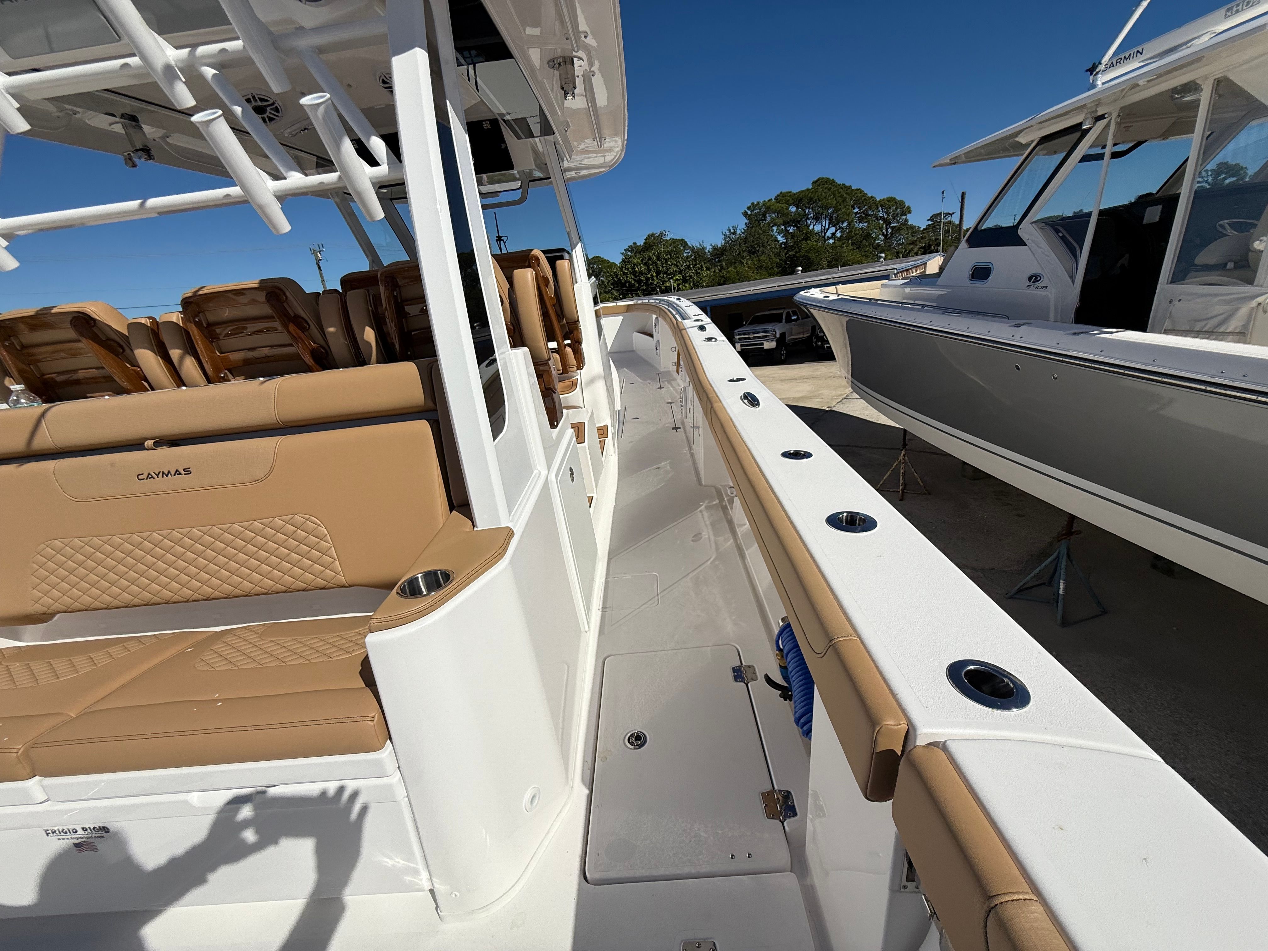 The Caymas 44 CT is loaded with premium features designed to enhance every aspect of your time on the water. For serious anglers, the GEMLUX outrigger bases provide a professional-grade setup for offshore trolling, while the Release Marine Teak Rocket Launcher with six rod holders and a convenient drawer keeps your gear organized and accessible. The custom cutting table at the transom rod holders makes preparing bait and cleaning your catch a breeze.Entertainment and comfort are at the forefront with LED light bars, including two forward-facing lights on the hardtop, creating a vibrant atmosphere for evening outings. Additional underwater LED RGB lights mounted on the hull step not only add a dramatic visual effect but also attract marine life for night fishing or swimming. The DC compressor for the mezzanine Frigid Rigid cooler ensures your refreshments stay chilled, while the Frigibar Ice Chipper with Diverter Valve efficiently fills the stern port and starboard fish boxes, keeping your catch fresh all day.Convenience is further elevated with a shore power connection for reliable dockside power and Roku streaming video capabilities, allowing you to enjoy your favorite shows and movies while relaxing onboard. Thoughtful touches like large cupholders, including additional ones at the transom, ensure that every guest has a secure spot for their drink, enhancing the social experience.
