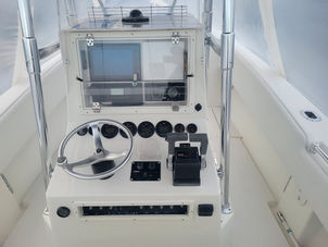 Practicality is a hallmark of the Contender 27 Cuddy. The boat’s manageable size makes it easy to dock, trailer, and store, while the efficient twin-engine setup helps optimize fuel consumption without sacrificing performance. Cockpit storage compartments keep your gear organized and out of the way, reducing clutter and enhancing safety. The fish box is ideal for storing your catch or keeping refreshments chilled, adding to the boat’s versatility. The blue canvas not only adds a touch of style but also offers protection from sun and rain, extending your comfort during long days on the water. The four-year-old batteries ensure that all electrical systems, from navigation to entertainment, operate reliably, so you can focus on enjoying your time aboard. The helm stereo controls make it easy to adjust music and set the mood, whether you are cruising at sunset or anchored in your favorite cove.