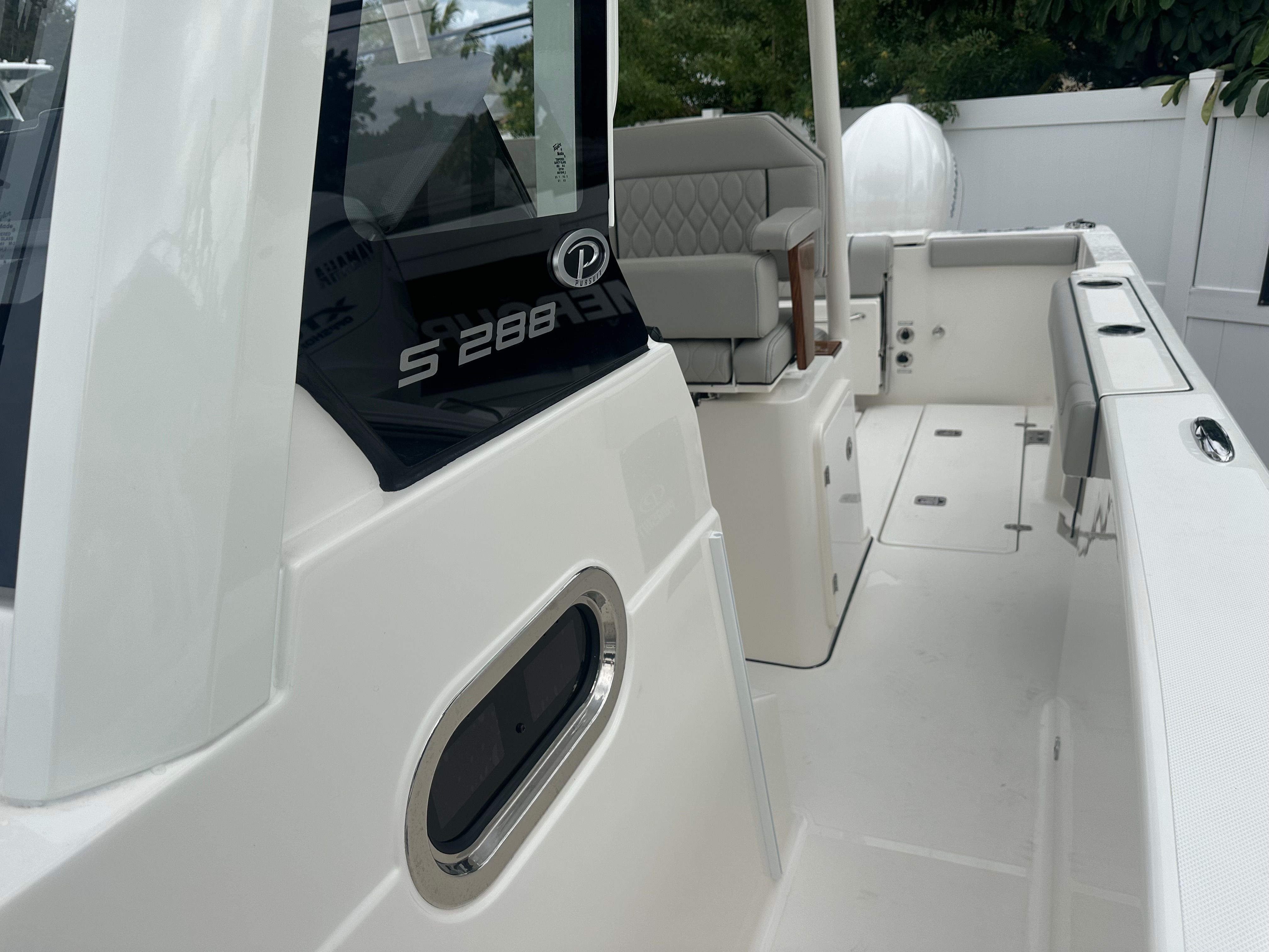 Practicality meets elegance in the Pursuit S 288. The hullside boarding door ladder makes it easy to board from the dock or water, enhancing safety and convenience for all ages. Dockside power with a battery charger keeps your systems running smoothly, reducing downtime and ensuring you’re always ready for your next adventure. The boat’s efficient design and powerful engines contribute to fuel savings, while the bow thruster simplifies docking and maneuvering in crowded areas. Storage solutions are integrated throughout the vessel, allowing you to stow gear, refreshments, and personal items securely and access them with ease.