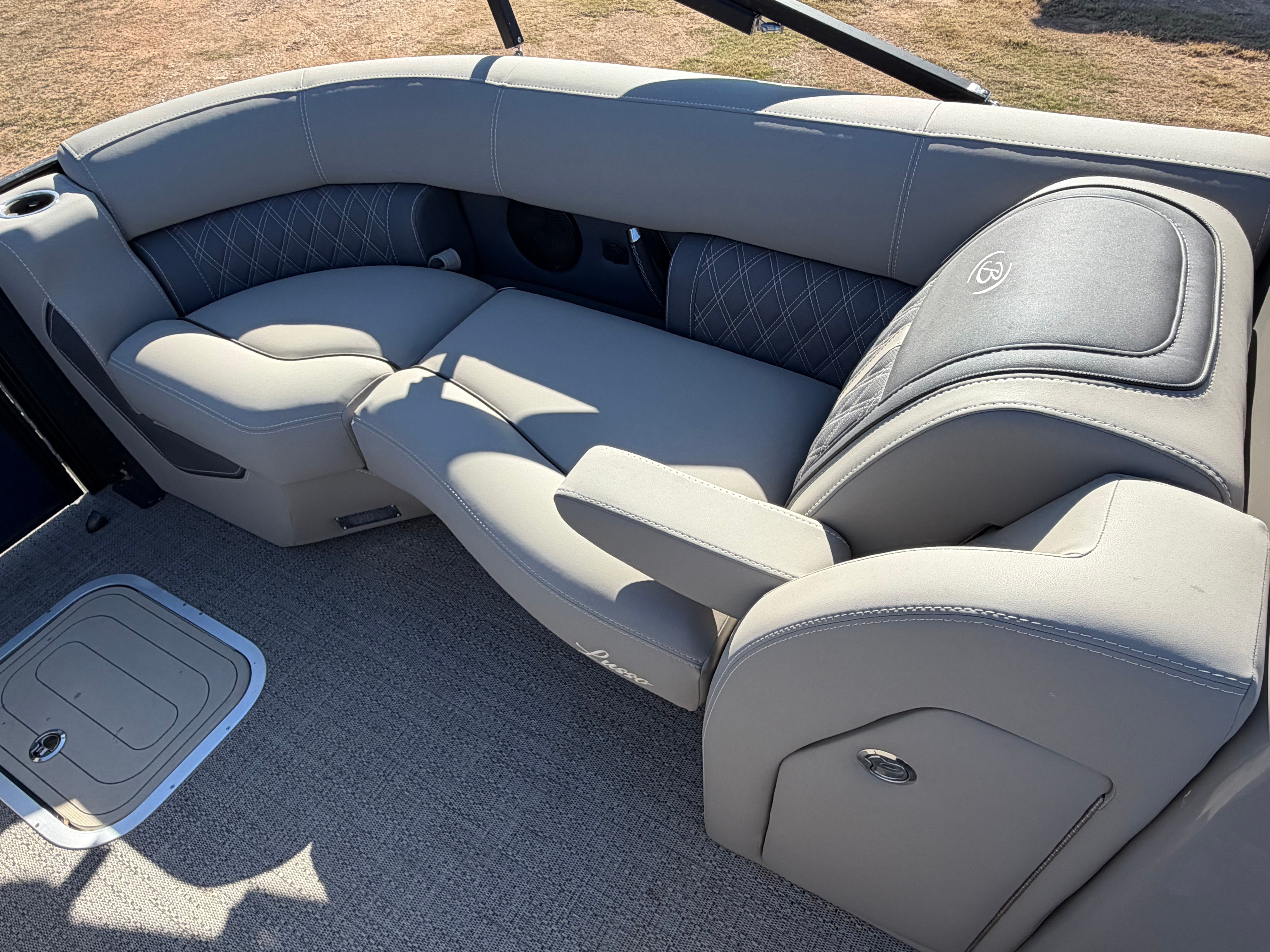 The 2024 Barletta Lusso L23UC is designed with both comfort and convenience in mind. Its spacious 25.42-foot deck provides ample room for guests to relax, socialize, and enjoy the scenery. The open layout is perfect for entertaining, with plush seating and thoughtfully placed amenities that enhance every outing. Special features of the Lusso L23UC include high-quality upholstery, a stylish helm, and a user-friendly control panel that puts everything you need at your fingertips. The pontoon’s sturdy construction and premium materials ensure durability and a smooth ride, while the elegant design details set it apart from other pontoon boats for sale.
