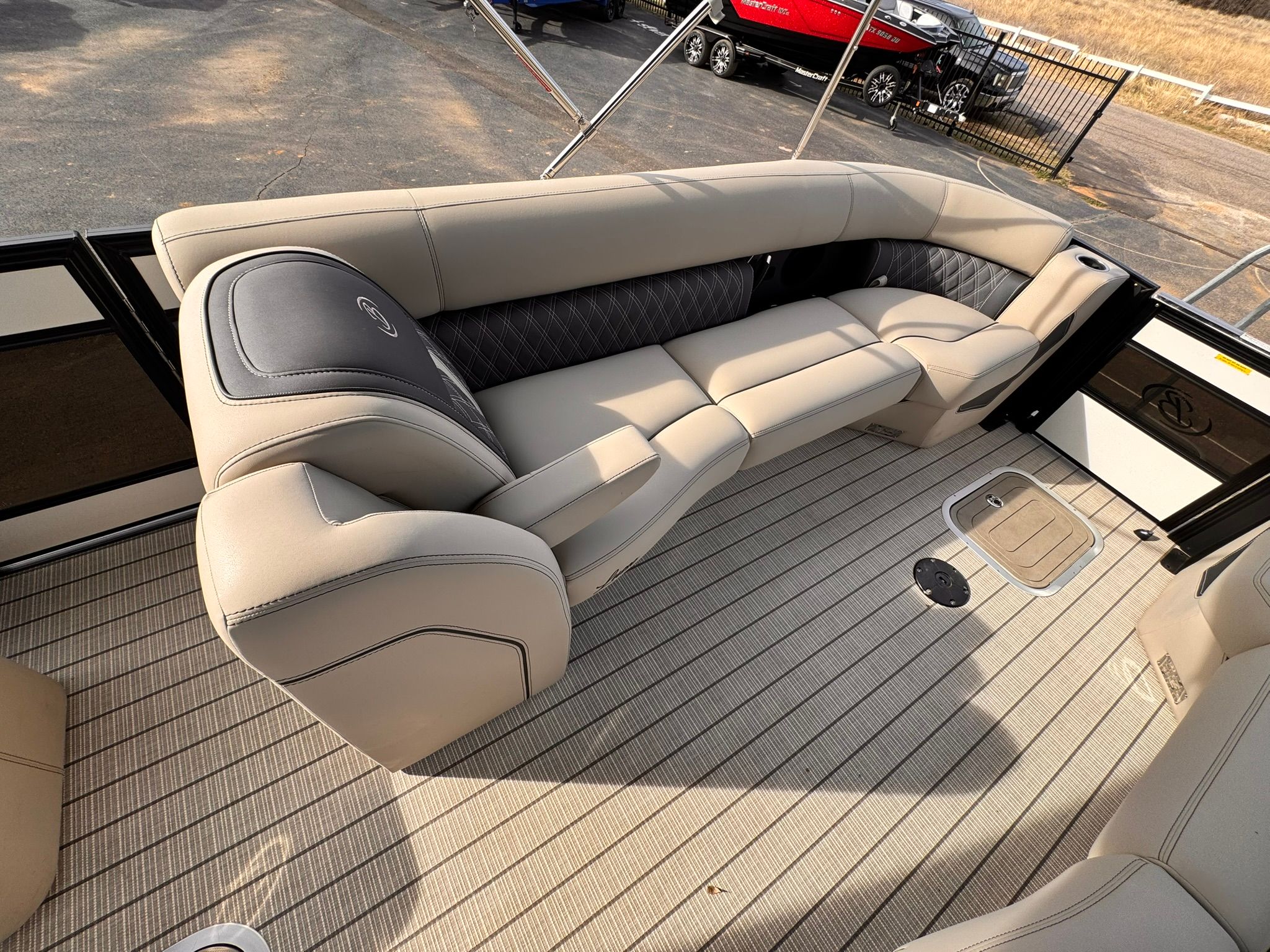 The 2023 Barletta Lusso L25UCA is packed with features designed to enhance your time on the water. Its spacious 25-foot length provides ample room for guests, making it ideal for social gatherings and family adventures. The pontoon’s layout is thoughtfully designed to maximize comfort and convenience, with plush seating, generous deck space, and premium finishes throughout. Every detail, from the high-quality upholstery to the stylish accents, reflects Barletta’s commitment to luxury and durability.