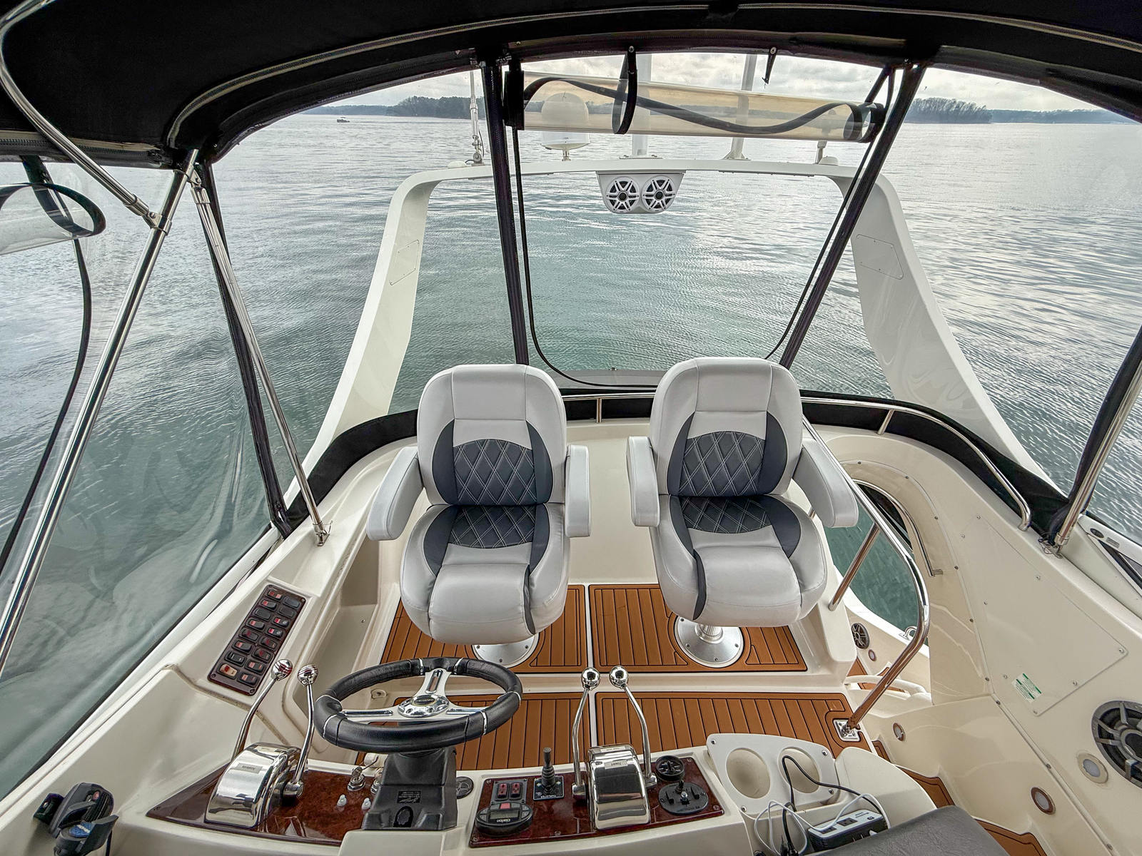 This particular boat has received several upgrades that improve both appearance and functionality. The cockpit features SeaDeck flooring throughout, providing a clean look while adding comfort and traction underfoot. A newer canvas and Isinglass enclosure helps extend the boating season and keeps the cockpit protected from the elements. The helm seating and forward helm bench have been reupholstered, giving the helm area a refreshed, modern feel.