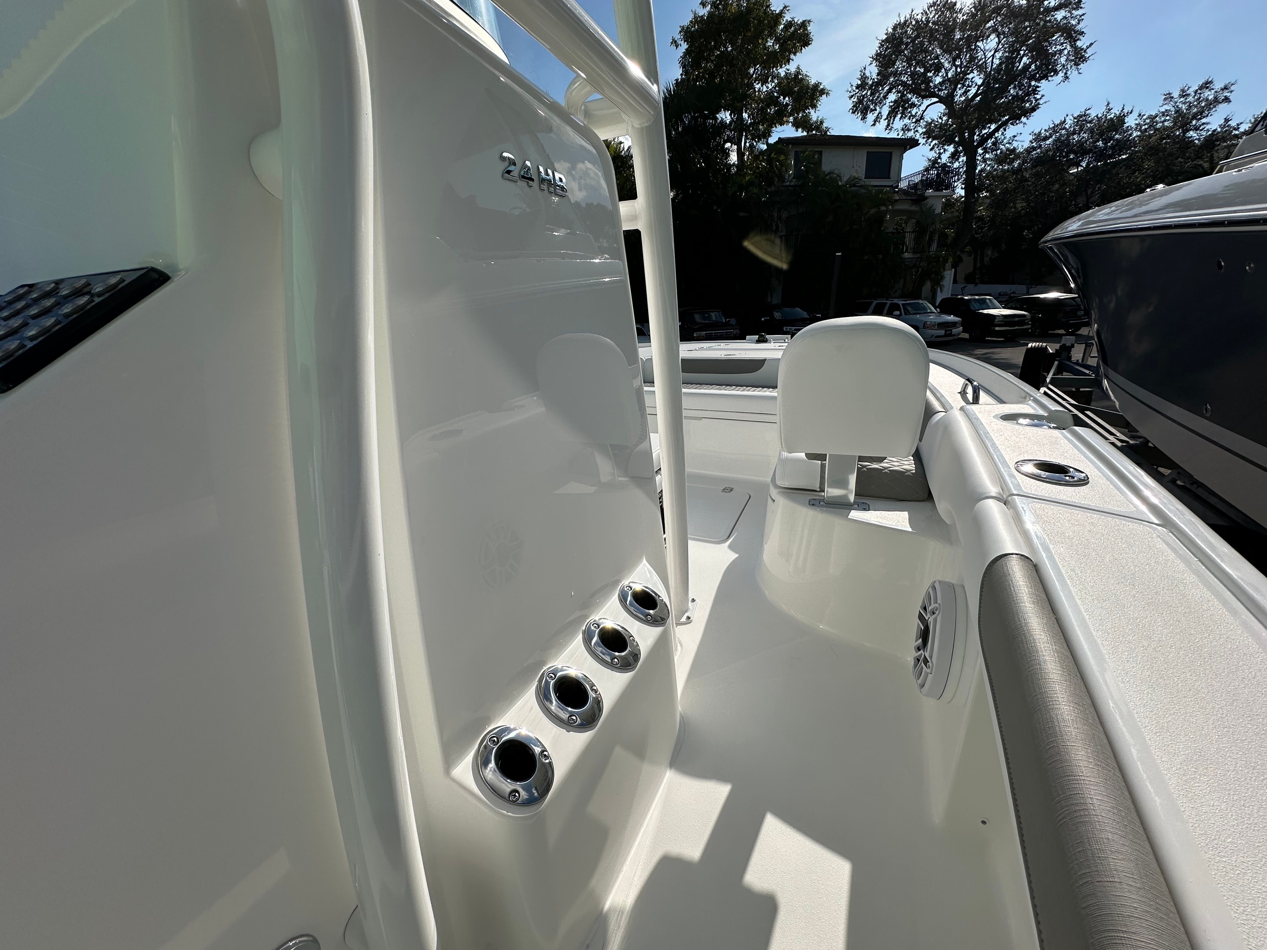 This Caymas boat for sale is loaded with premium features that enhance both functionality and enjoyment. The trolling motor pre-rig allows for easy installation of your preferred trolling motor, perfect for anglers who demand precision and control. An added house battery for the standard panel provides reliable power for all your onboard electronics, ensuring you stay connected and in command.Topside screw mount stainless steel rod holders offer secure and convenient storage for your fishing gear, while the fiberglass hardtop with a powder-coated frame provides shade and protection from the elements. The Fusion MS-RA670 head unit replaces the JL MM105, delivering superior audio quality and seamless connectivity for your favorite playlists. For those who appreciate premium sound, the JL Audio upgrade package #1 takes your onboard entertainment to the next level.The Power Pole Blade Series 10’ in white, mounted on the starboard side, offers unmatched anchoring capability, allowing you to hold your position with ease in shallow waters. The freshwater system ensures you have access to clean water for rinsing off after a swim or cleaning your catch. The plumb port-side livewell keeps your bait and catch fresh throughout the day, making this center console boat a true angler’s dream.