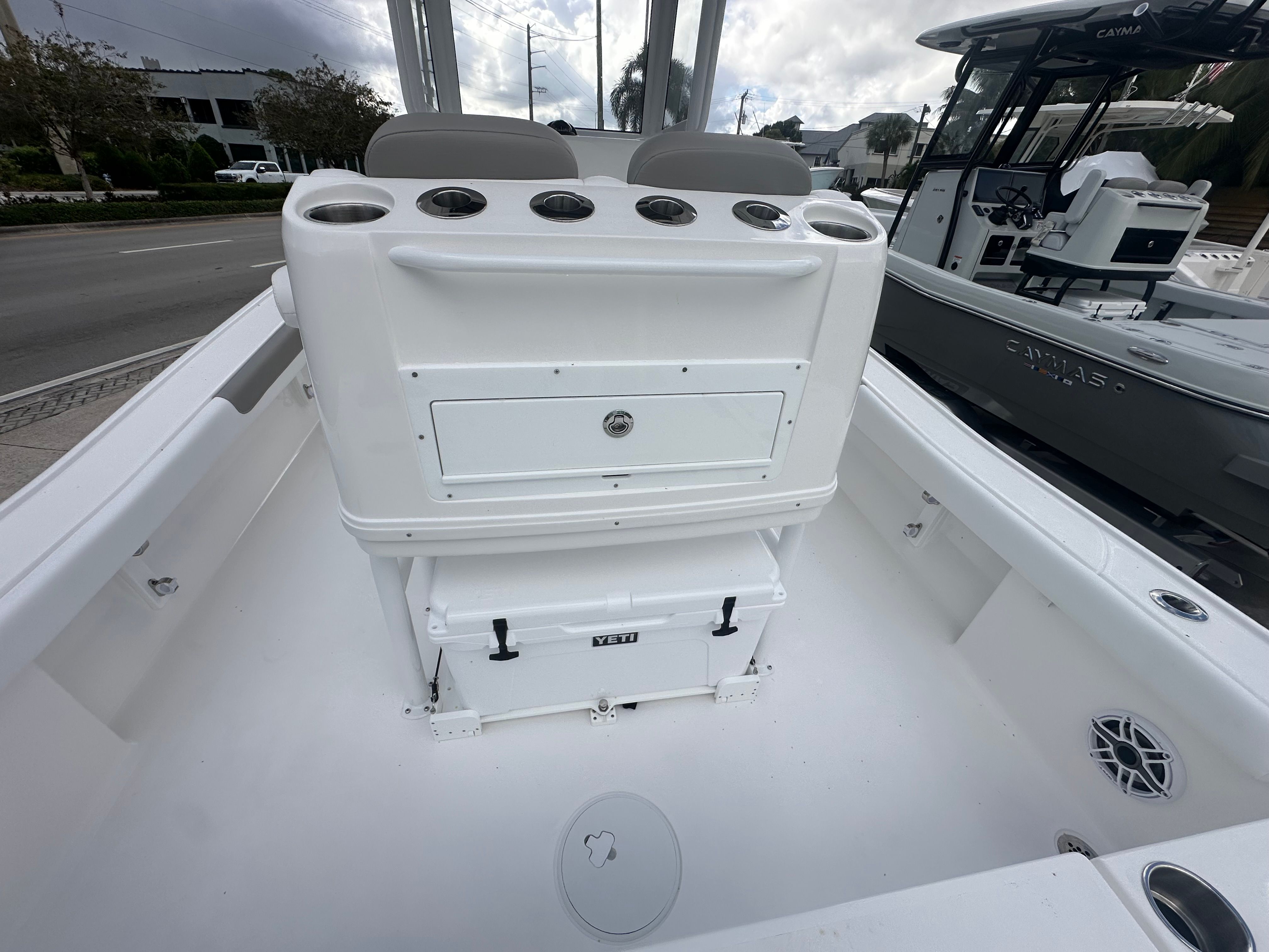 The Caymas 26 HB is loaded with premium features designed to elevate your boating experience. The Minn Kota RT Instinct Quest trolling motor offers precise maneuverability, making it easier than ever to position your boat exactly where you want it, whether you’re fishing in shallow flats or navigating tight spots. The Minn Kota charger, 15x3 for trolling motor batteries, ensures your trolling motor is always ready for action, while the dedicated trolling motor batteries provide reliable power throughout your adventures.For anglers, the flush mount stainless steel rod holders offer secure and convenient storage for your fishing gear, keeping your deck organized and clutter-free. The Power Pole Blade Series 10’ anchors, installed on both the starboard and port sides in a sleek white finish, provide superior anchoring capability, allowing you to hold your position effortlessly in various conditions. The motorized battery switches and battery parallel system simplify power management, ensuring your boat’s electrical systems operate smoothly and efficiently.Additional features such as the leaning post cover and console cover protect your investment from the elements, maintaining the pristine condition of your Caymas boat. These thoughtful touches highlight the attention to detail that sets the Caymas 26 HB apart from other center console boats for sale.