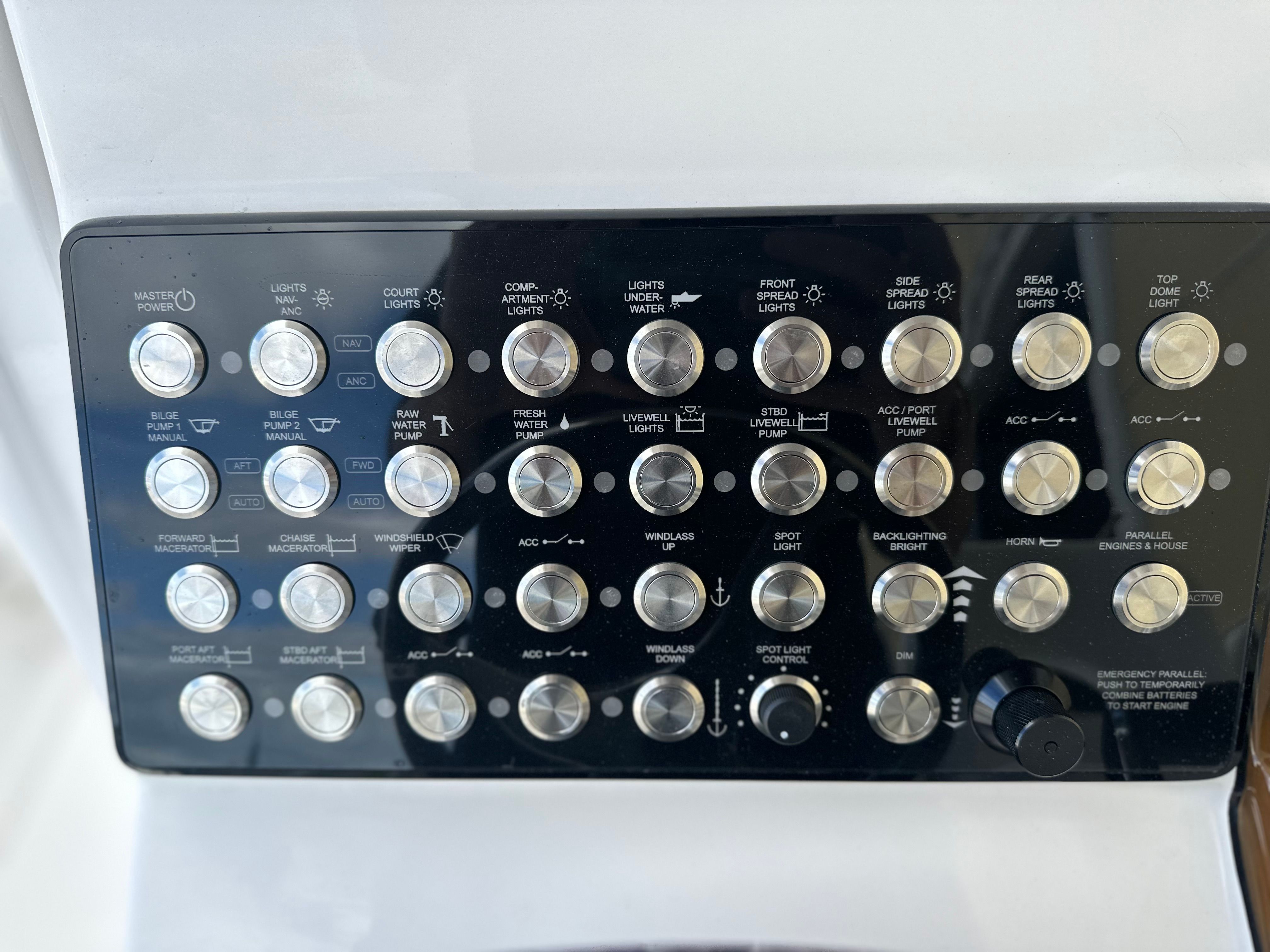 The Caymas 291 HB Center Console is loaded with premium features that elevate your boating experience. The motorized battery switches provide effortless power management, ensuring your boat’s systems are always ready when you are. Topside screw mount stainless steel rod holders offer secure and convenient storage for your fishing gear, making this center console boat for sale a top pick for serious anglers.For comfort and convenience, the marine porcelain head with blackwater tank offers a practical solution for longer trips, while the Fusion MS-RA670 head unit delivers high-quality audio entertainment, enhancing every outing with your favorite tunes. Underwater lights add a touch of elegance and visibility during evening cruises, creating a captivating atmosphere both above and below the waterline.The starboard swim platform with a folding boarding ladder makes water access easy and safe, whether you are swimming, snorkeling, or reboarding after a day of water sports. The windlass system simplifies anchoring, allowing you to secure your position effortlessly in any location. The all-white upholstery exudes sophistication and is easy to maintain, while the Captain Chair Fiberglass Leaning Post with Llebroc helm chairs provides unmatched comfort and support for long days at the helm.