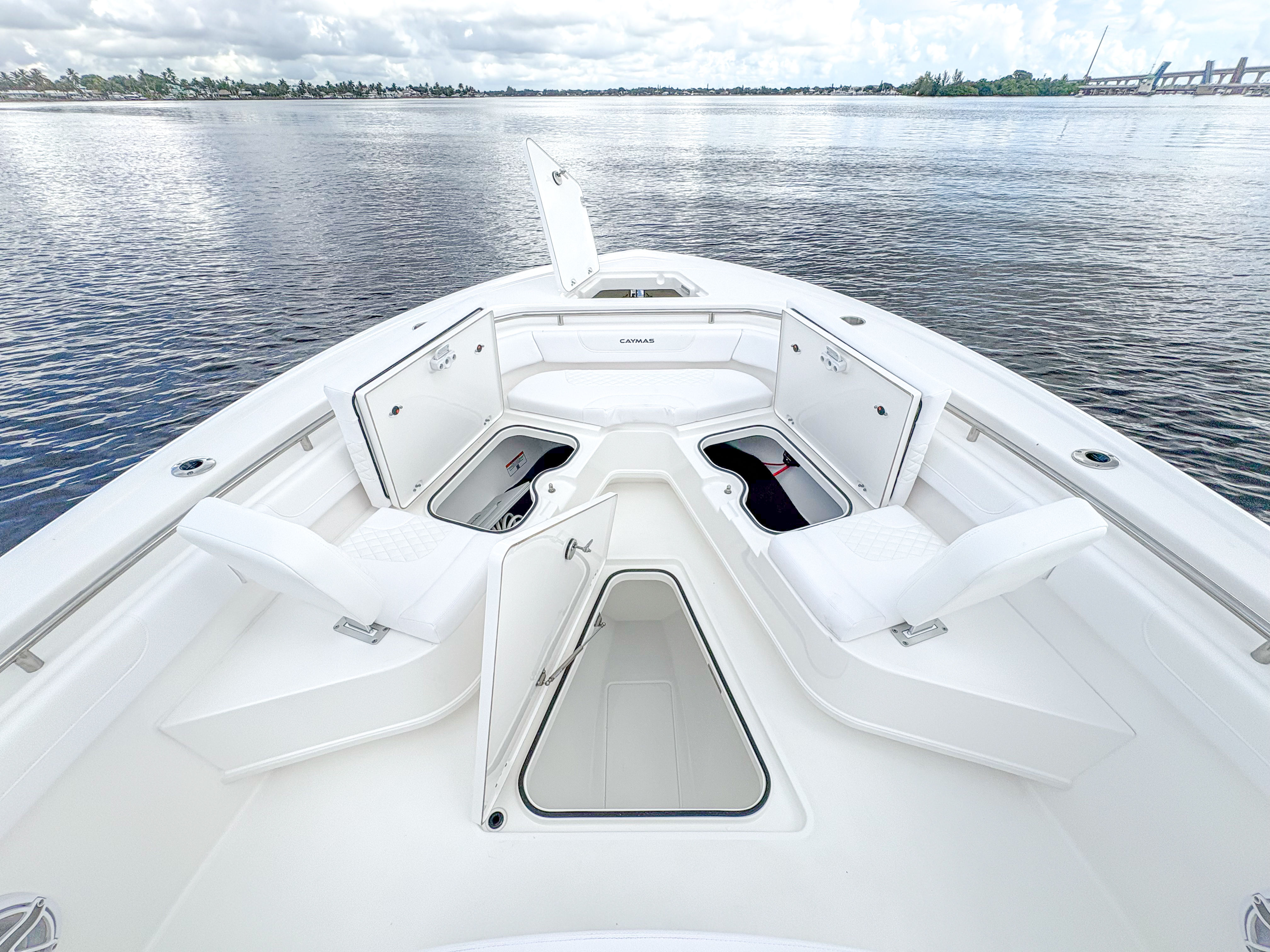 The Caymas 291 HB is packed with premium features that set it apart from other center console boats. The Upgrade #2 Fusion audio system delivers crystal-clear sound, perfect for setting the mood while you’re anchored or underway. Navigation is a breeze with the Garmin GPSMAP 8616xsv Console, offering intuitive controls and real-time data to keep you on course. The Garmin Clearview/Side View Transducer provides unparalleled underwater visibility, making it easier to locate fish and navigate unfamiliar waters.For added convenience and safety, the boat is equipped with LED light bars, including two forward-facing lights mounted on the hardtop. These lights illuminate your path during early morning departures or late-night returns, enhancing visibility and peace of mind. The Surf / Turf Package in gray adds a touch of sophistication to the boat’s interior, while the Forward Seating Module in White/White offers comfortable seating for guests.Accessing the water is effortless thanks to the Port Platform and Starboard Platform with ladder, making swimming, diving, and boarding a breeze. The boat’s layout is designed for versatility, with ample storage for gear, tackle, and personal items, ensuring everything you need is within reach.