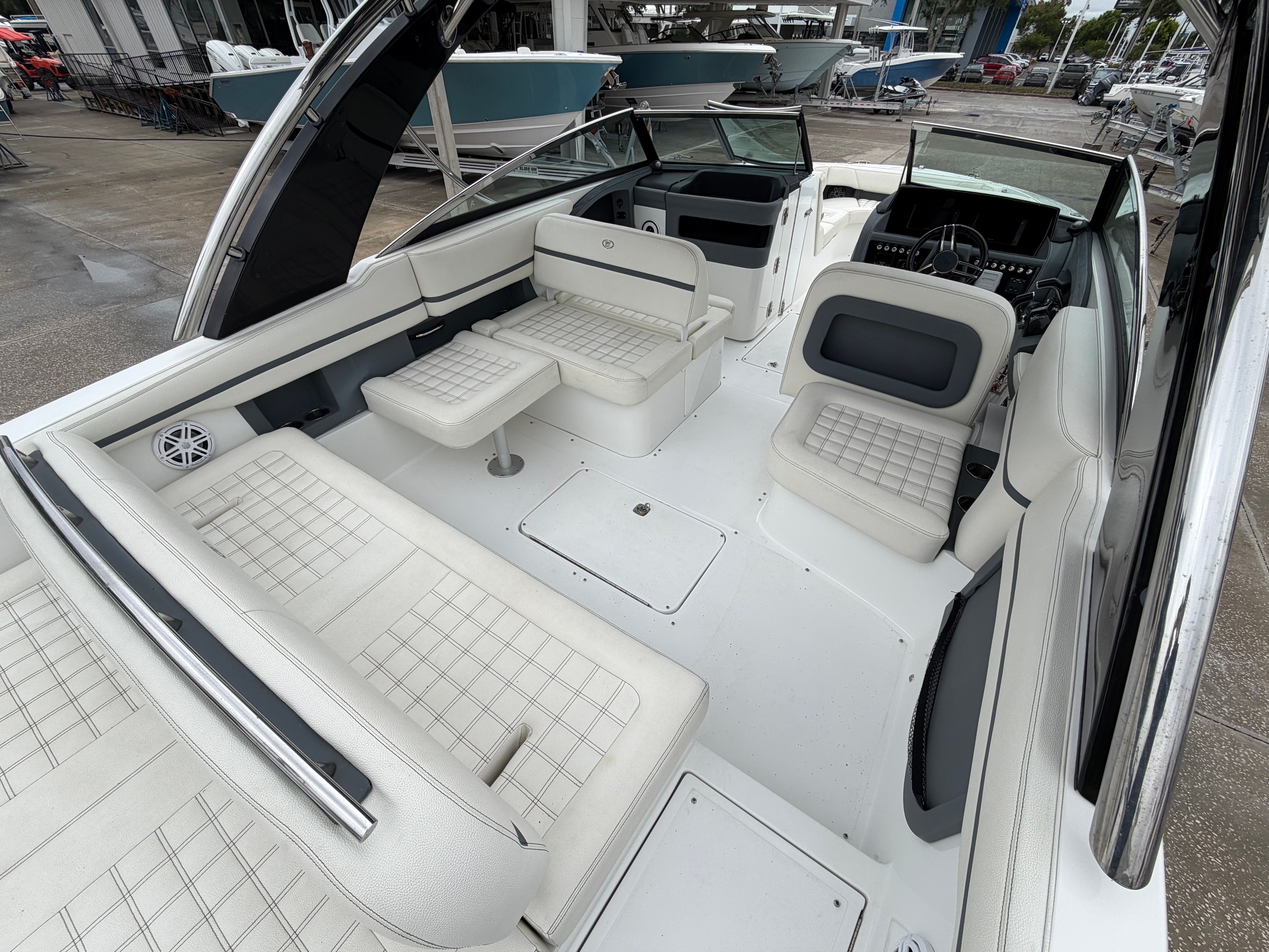 The Cobalt 30 SC is as practical as it is fun. The center console design provides excellent visibility for the captain and makes docking and maneuvering in tight spaces a breeze. The spacious deck offers plenty of room for storage, ensuring that all your gear, from fishing rods to water toys, is easily accessible. The efficient twin-engine setup not only delivers impressive power but also contributes to better fuel economy, allowing you to spend more time on the water and less time at the pump. Whether you are planning a day of fishing, a weekend getaway, or a casual cruise, this center console boat for sale adapts to your needs with ease.