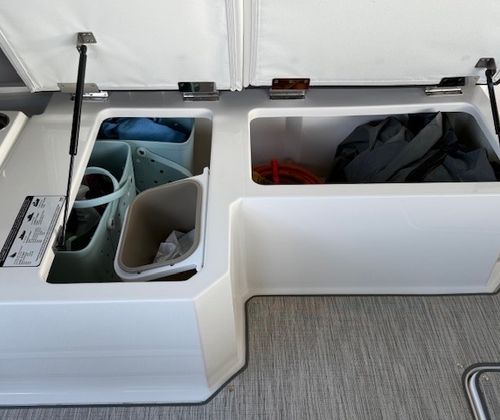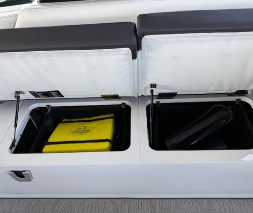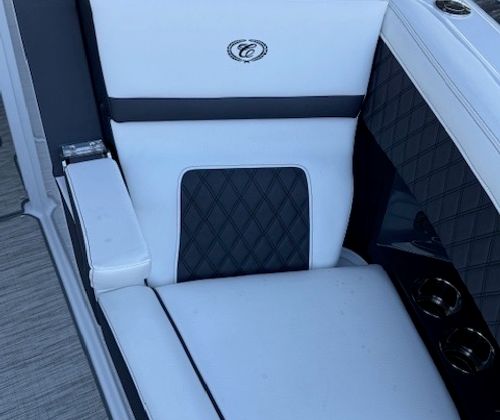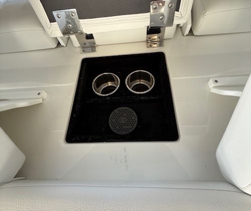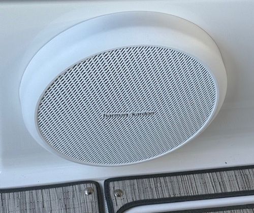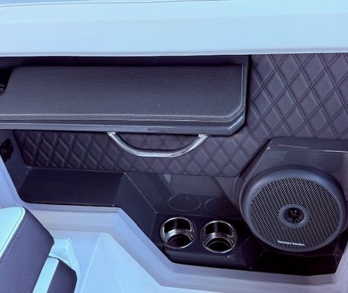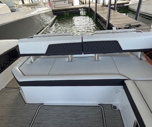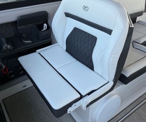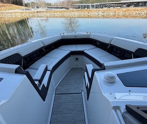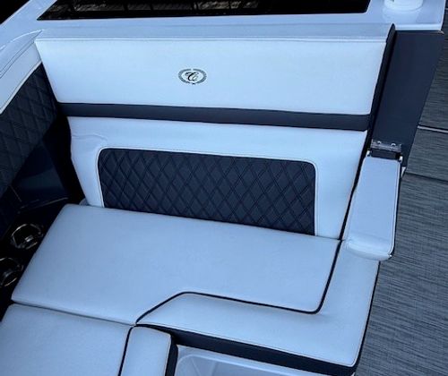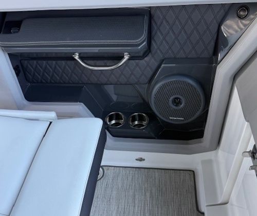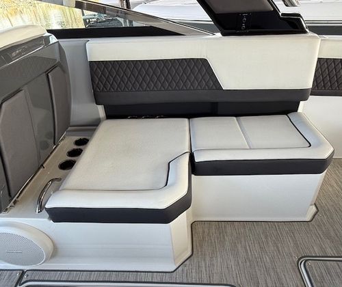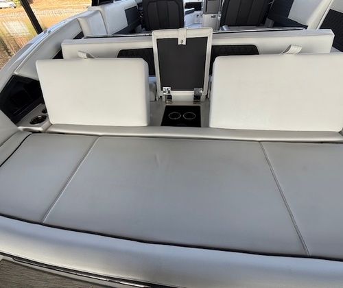 Comfort and amenities are front and center. The hydraulic swim platform with flip-down step creates effortless water access, while underwater RGB lighting and transom lighting set the tone at anchor. A Platinum Harman Kardon sound system with hardtop and transom speakers delivers impressive audio throughout the boat, and the wide, open seating layout makes it easy to host family and friends all day long.