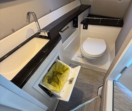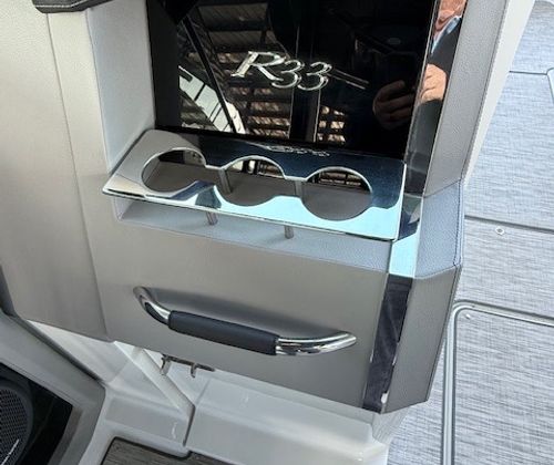 Below deck, the cabin adds versatility with sleeping accommodations, seating, a built-in smart TV, air conditioning, a VacuFlush head, and seagrass flooring. Finished in Summit interior with black leather, stainless accents, Cavern Grey cabin décor, and a striking Bayside Blue hull with Rich Ebony bottom, this R33 is both stylish and functional.