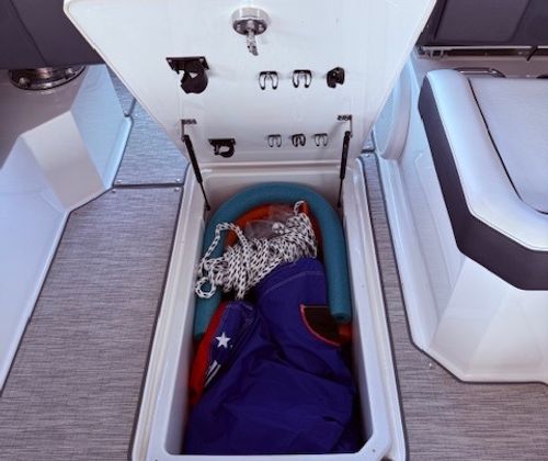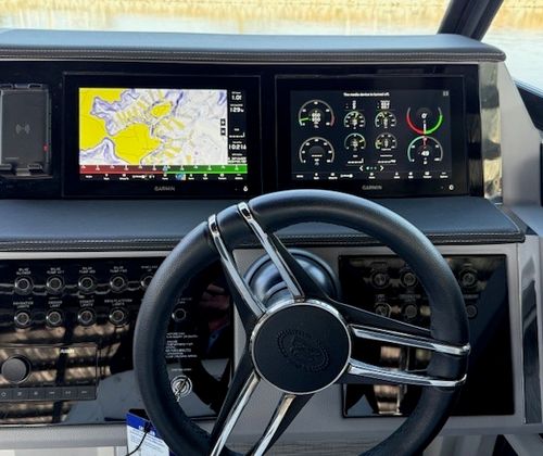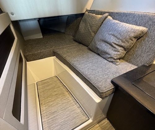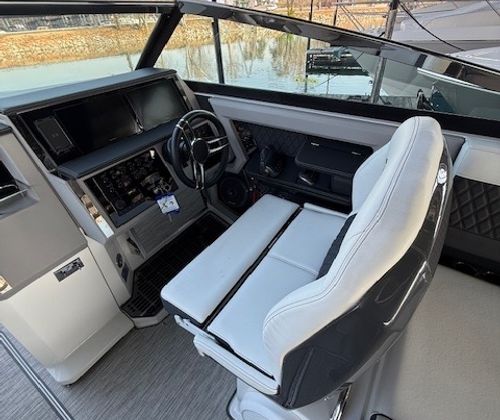 Power comes from twin 380 HP big-block sterndrives with just 50 hours, providing strong acceleration, smooth cruising, and confident control. The helm is equipped with a multi-screen Garmin glass cockpit, joystick docking, and trim tabs with Autoglide, making this boat easy to operate whether you’re running at speed or easing into the dock.