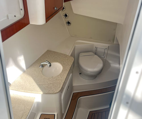 Practicality is a hallmark of the Edgewater 280 CX. The Dual Console design offers excellent protection from wind and spray, making it suitable for year-round boating. The boat’s efficient layout provides generous storage for all your gear, keeping the deck clutter-free and organized. Docking is simplified thanks to the twin engines, which offer precise control and maneuverability in tight spaces. Fuel efficiency is another advantage of the 280 CX, allowing you to spend more time on the water and less time at the fuel dock. The boat’s thoughtful design also makes maintenance straightforward, so you can focus on enjoying your time on the water rather than worrying about upkeep. Whether you’re heading out for a quick afternoon cruise or planning an extended adventure, the Edgewater 280 CX is equipped to handle your needs with ease.