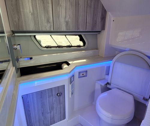 Instant motor response: Upgraded Mercury 450R's instantly respond to your control with Mercury® Joystick Piloting, throttle and electronic shift and a stainless tilt steering wheel.