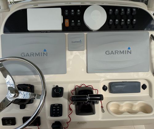At the helm, the boat is fully equipped with twin Garmin 16-inch navigation displays with sonar readout, offering expansive, easy-to-view charting and fish-finding capabilities. A Garmin autopilot is also installed, making long runs more comfortable and precise. For entertainment, the Fusion stereo system with bow-to-stern speakers delivers clear, powerful sound throughout the boat, perfect for both cruising and relaxing at anchor.