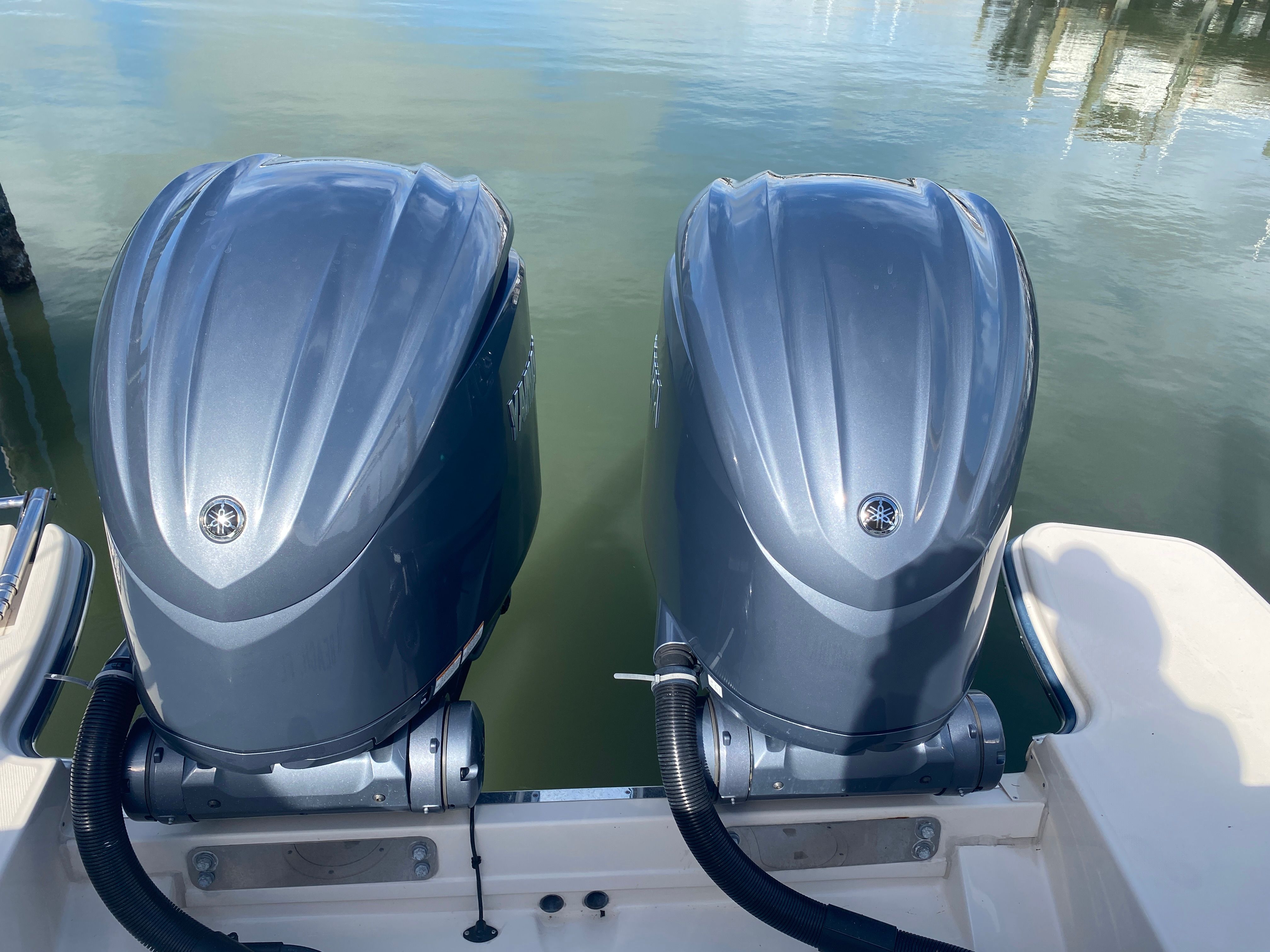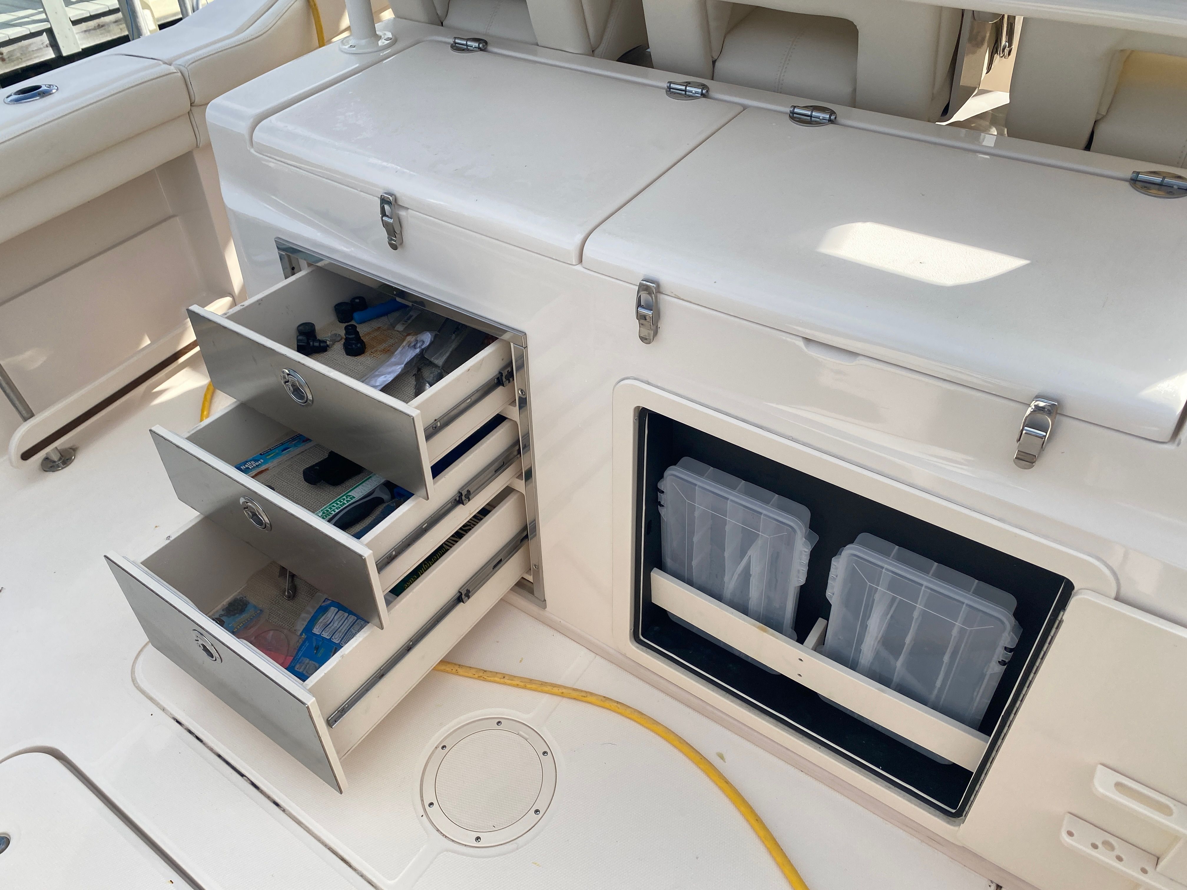 Under the hood, the Grady-White Canyon 326 is powered by twin engines, delivering a combined 600 horsepower. This impressive setup ensures smooth acceleration, responsive handling, and the ability to tackle a variety of water conditions with confidence. Whether you’re heading offshore for a fishing expedition or cruising along the coastline, the Canyon 326’s powerful engines provide the speed and agility you need for an exhilarating ride. With only 65 engine hours, these engines are barely broken in, offering years of dependable performance ahead.
