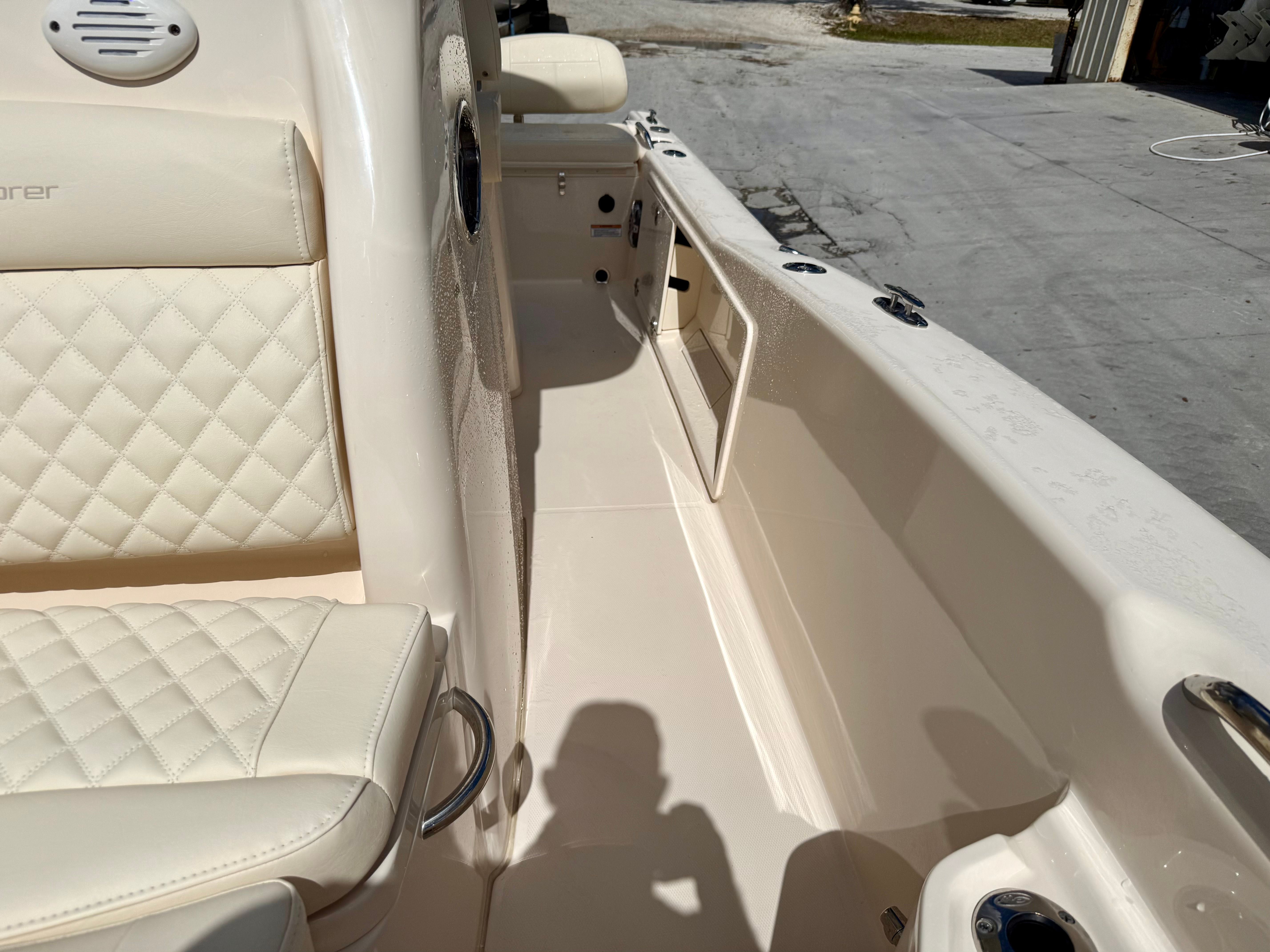 Entertainment is equally impressive with a Fusion marine audio system and speakers positioned from bow to stern, ensuring high-quality sound throughout the boat. Anglers will appreciate the thoughtfully placed rod holders, spacious livewell, and ample cockpit space, making this vessel equally suited for serious fishing or casual cruising. Freshwater and raw water washdown systems make cleanup quick and convenient after a day on the water.