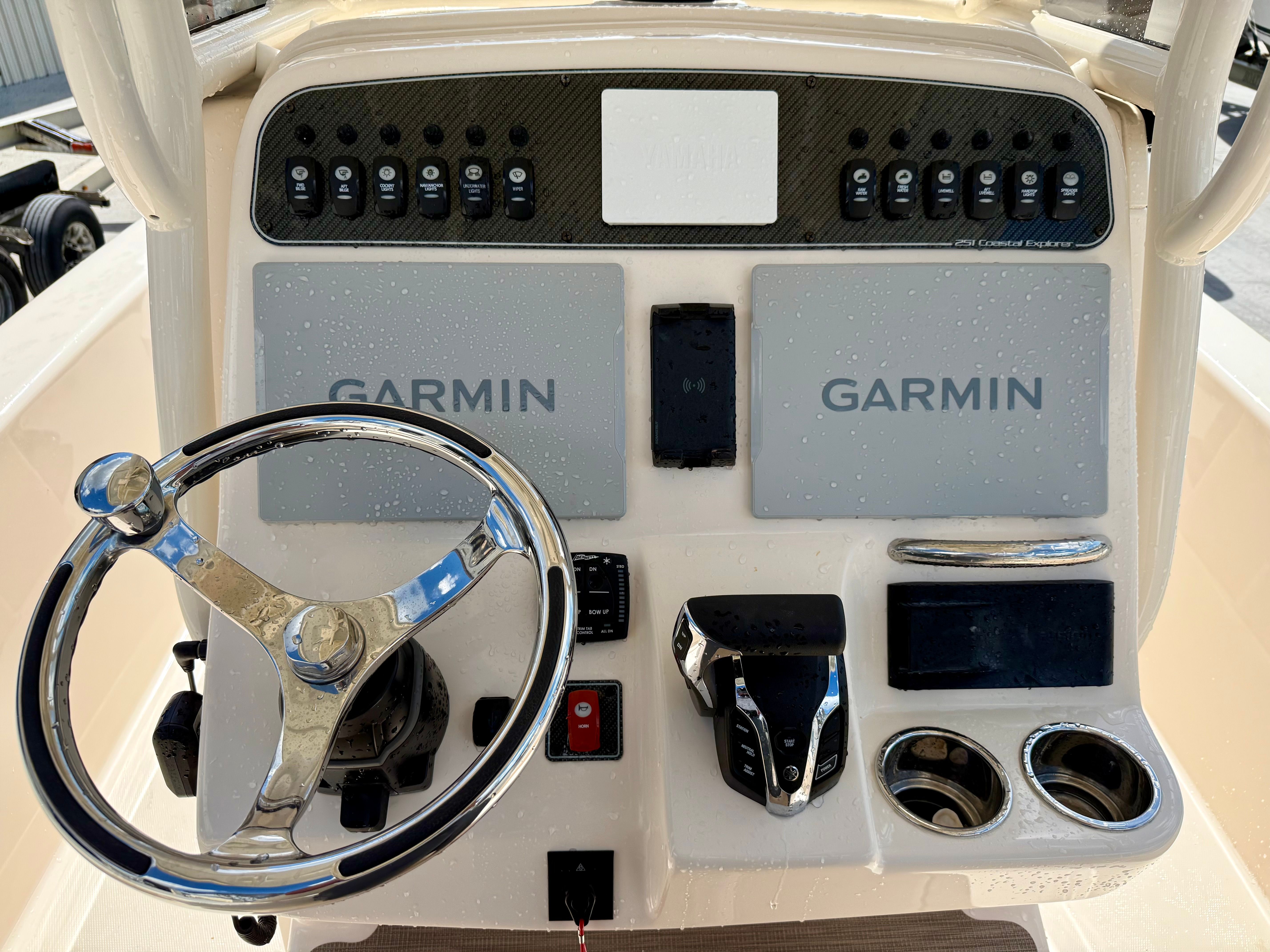 This 251CE comes well-equipped with premium, value-added features designed to enhance both navigation and onboard entertainment. At the helm, twin Garmin 12-inch navigation displays with integrated sonar provide outstanding visibility and advanced charting capabilities, while the Garmin radar system adds confidence during early morning runs or low-visibility conditions. Yamaha CL5 digital gauges offer clear engine data and seamless system monitoring for a modern, user-friendly helm experience.