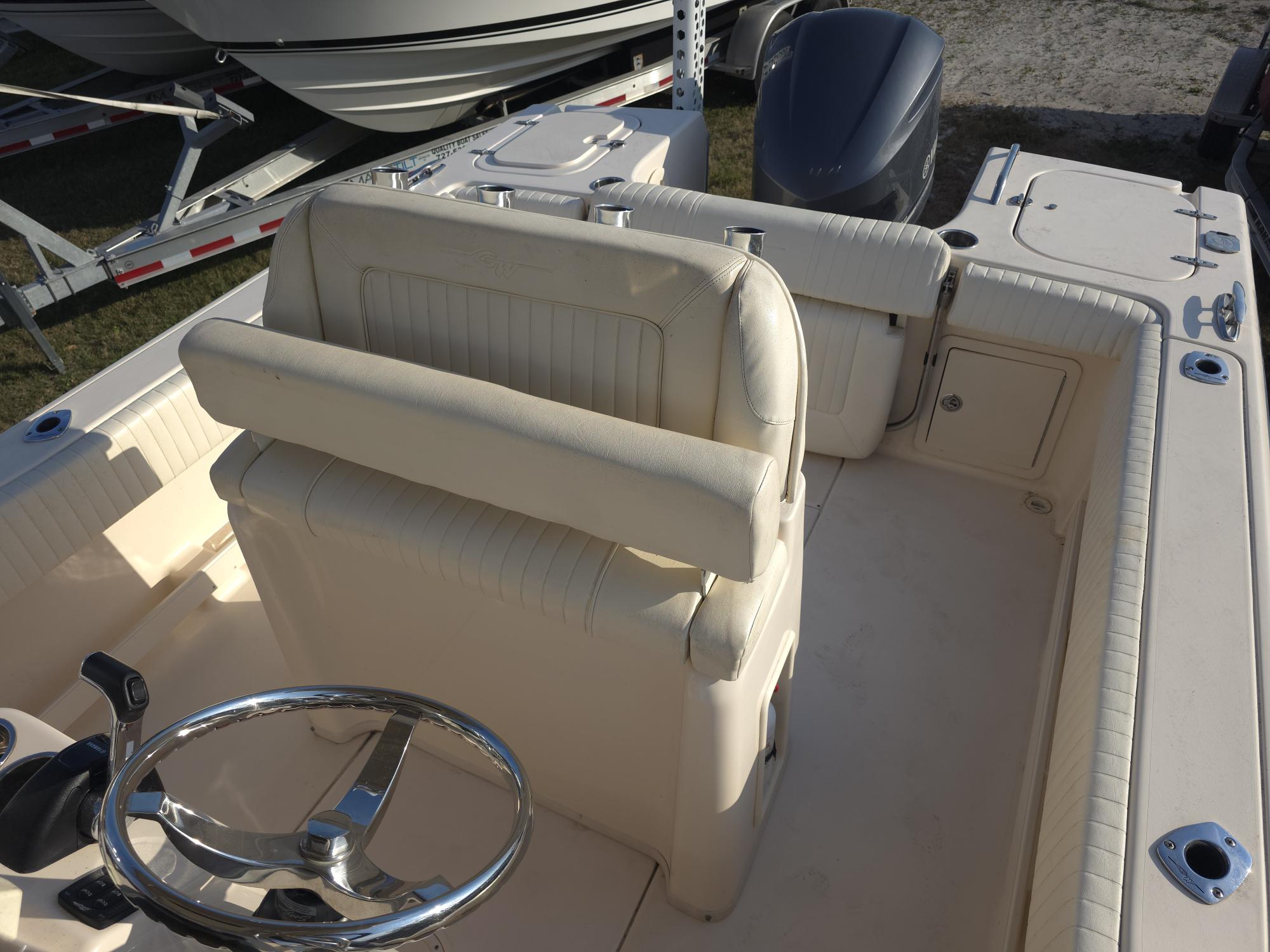 The cockpit is spacious and offers a classic straight transom and traditional single-engine motorwell with no need for a removable or flip-down motorwell dam. This configuration allows for the patented fold-down aft bench seat, as well as the 35-gallon livewell to starboard. The well is fully insulated and doubles as a cooler when not doing live-bait duty. The livewell is fed by a 1,100 gph pump and has full water-column distribution to keep bait strong and healthy throughout the day. A 20-quart drop-in storage box with tray to port is just another “Gradyism” that maximizes storage and makes sense for the family on the water, whether they are fishing or hanging out on the sandbar.