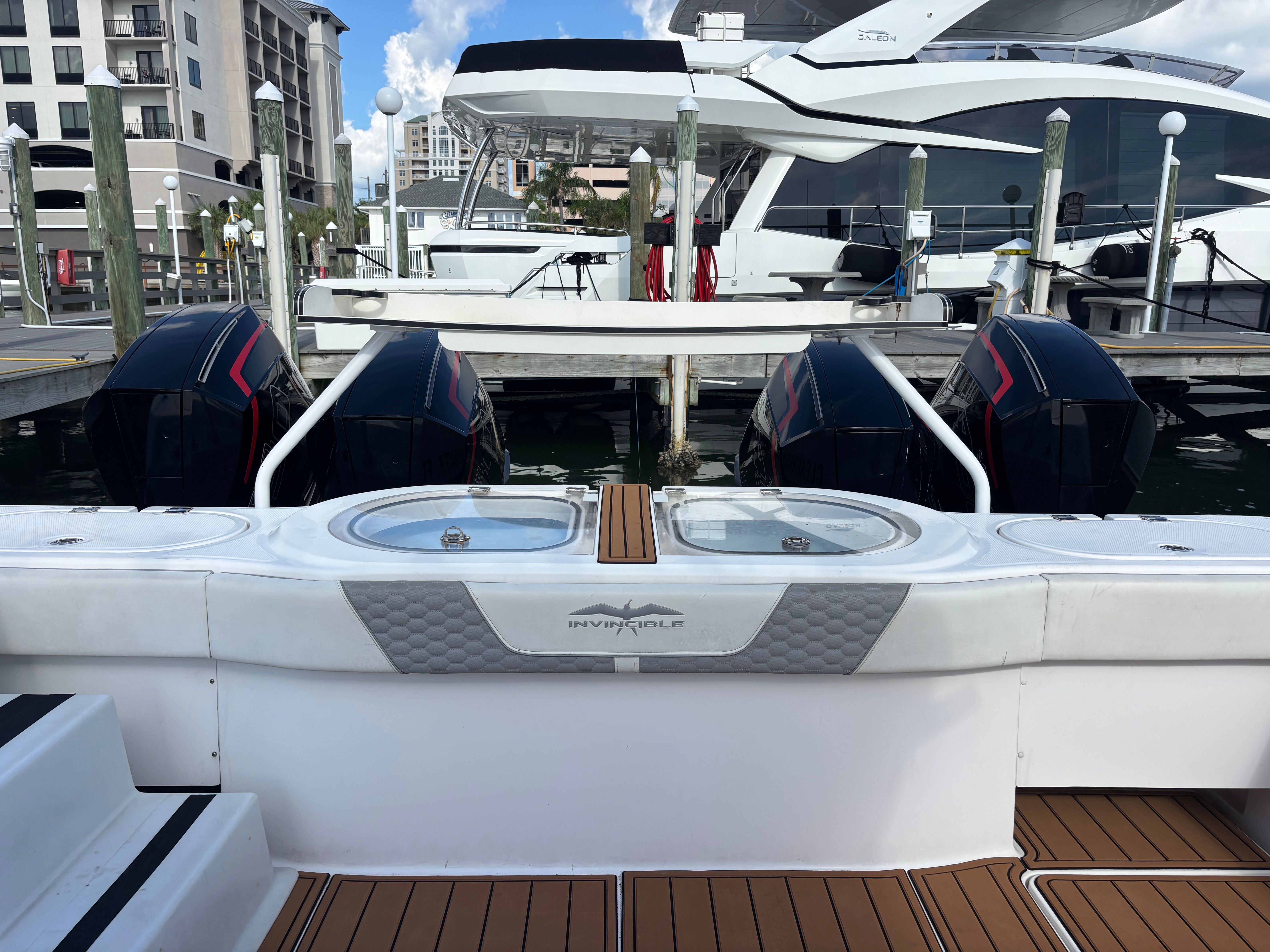 At the heart of the Invincible 46 Catamaran is a formidable power package: four engines delivering a combined 1800 horsepower. This impressive setup ensures exhilarating acceleration, rapid planing, and top-tier speed, making it one of the most capable Center Console boats for sale on the market. The quad-engine configuration not only enhances performance but also provides redundancy and reliability for long-range trips. Whether you’re heading offshore for big game fishing or cruising along the coast, the Invincible 46 Catamaran’s power and agility set it apart from the competition.