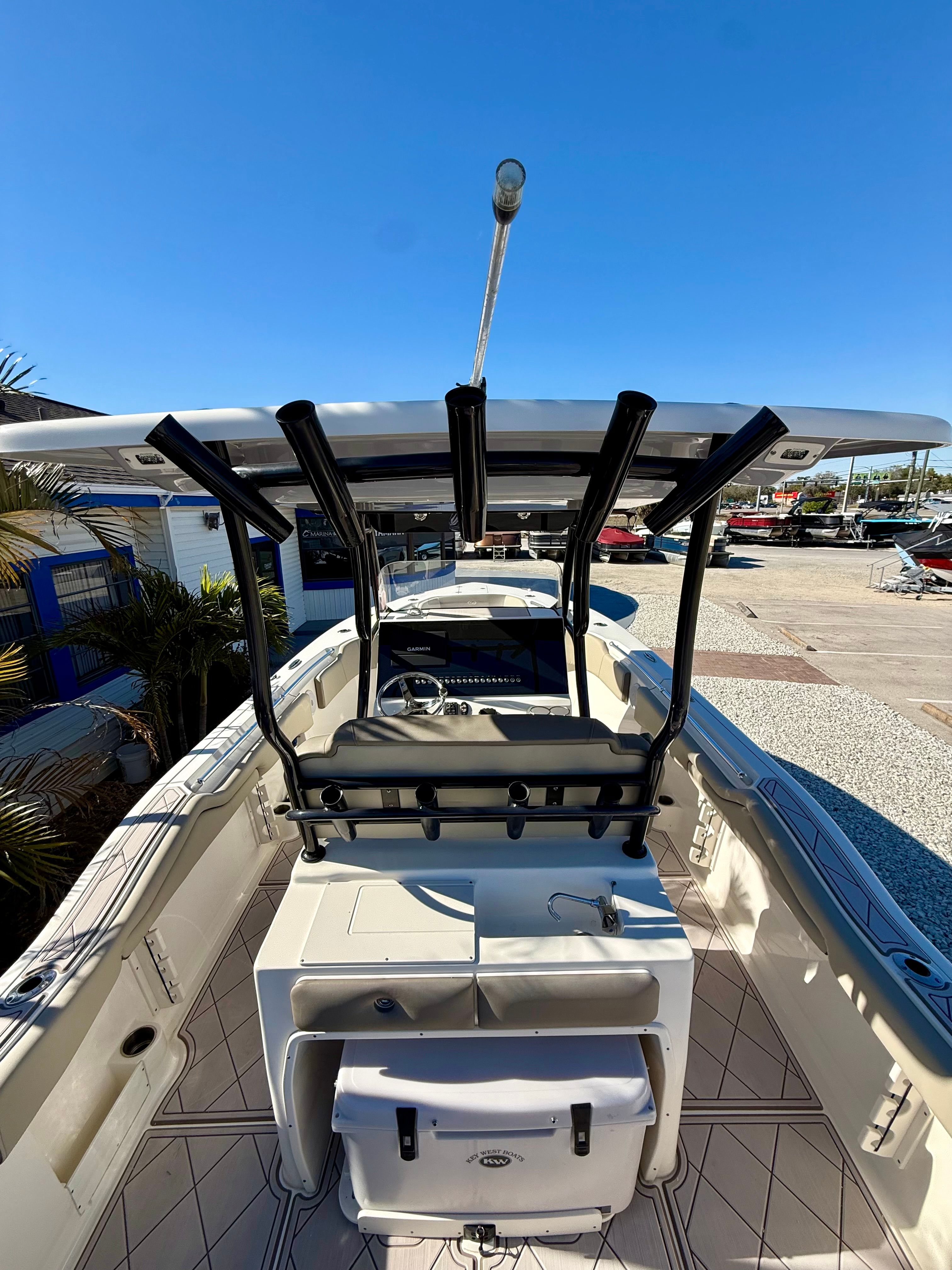Powering this Key West 263 FS are twin engines, delivering a combined 400 horsepower for exhilarating performance. The dual-engine setup ensures smooth acceleration, responsive handling, and the confidence to tackle a range of water conditions. Whether you are navigating coastal waters, heading offshore, or exploring hidden coves, the robust powertrain provides the speed and agility you need for both adventure and relaxation. The 263 FS is engineered for efficiency and reliability, making it a standout choice among center console boats for sale.