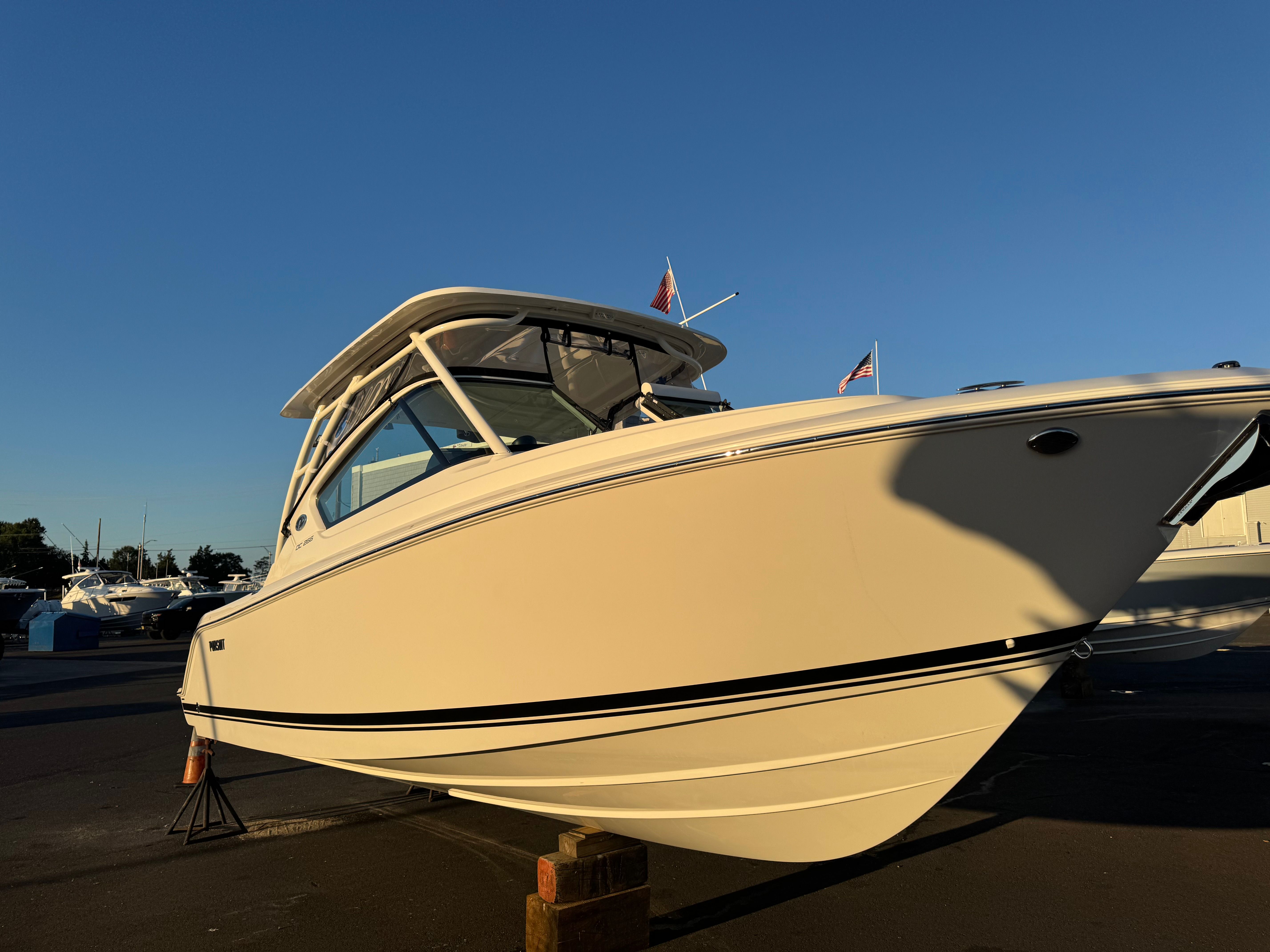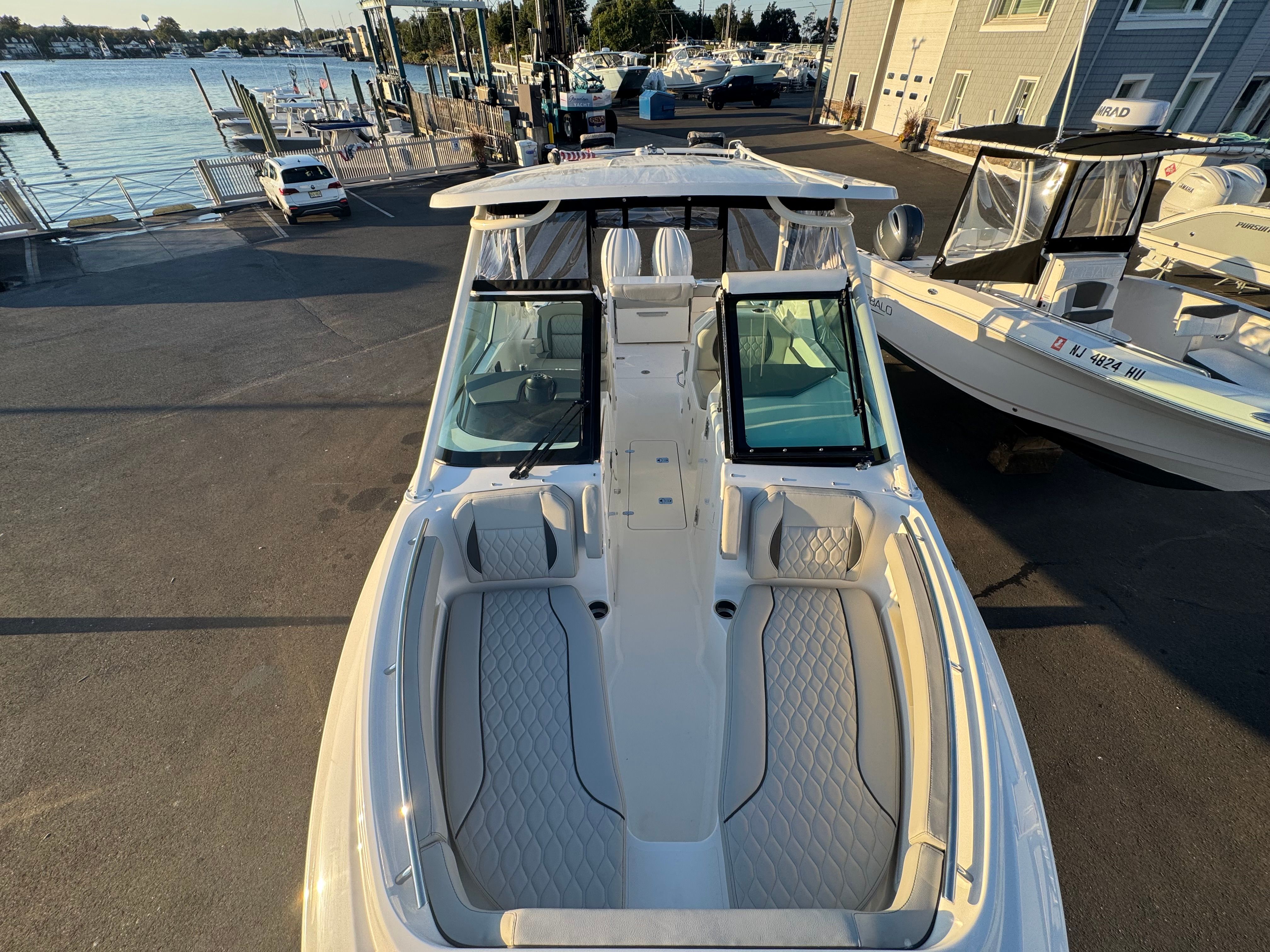 The Pursuit DC 266 is a 2026 model, measuring an impressive 27.33 feet in length. This dual console boat is engineered for versatility, offering ample space for socializing, fishing, and water sports. With its sleek white hull and striking black boot stripe, the DC 266 stands out in any marina or on open water. The carbon-colored helm and footrest add a touch of modern sophistication, ensuring that every detail reflects Pursuit’s commitment to quality and style. As a new boat, the DC 266 promises pristine condition and the latest advancements in marine technology.