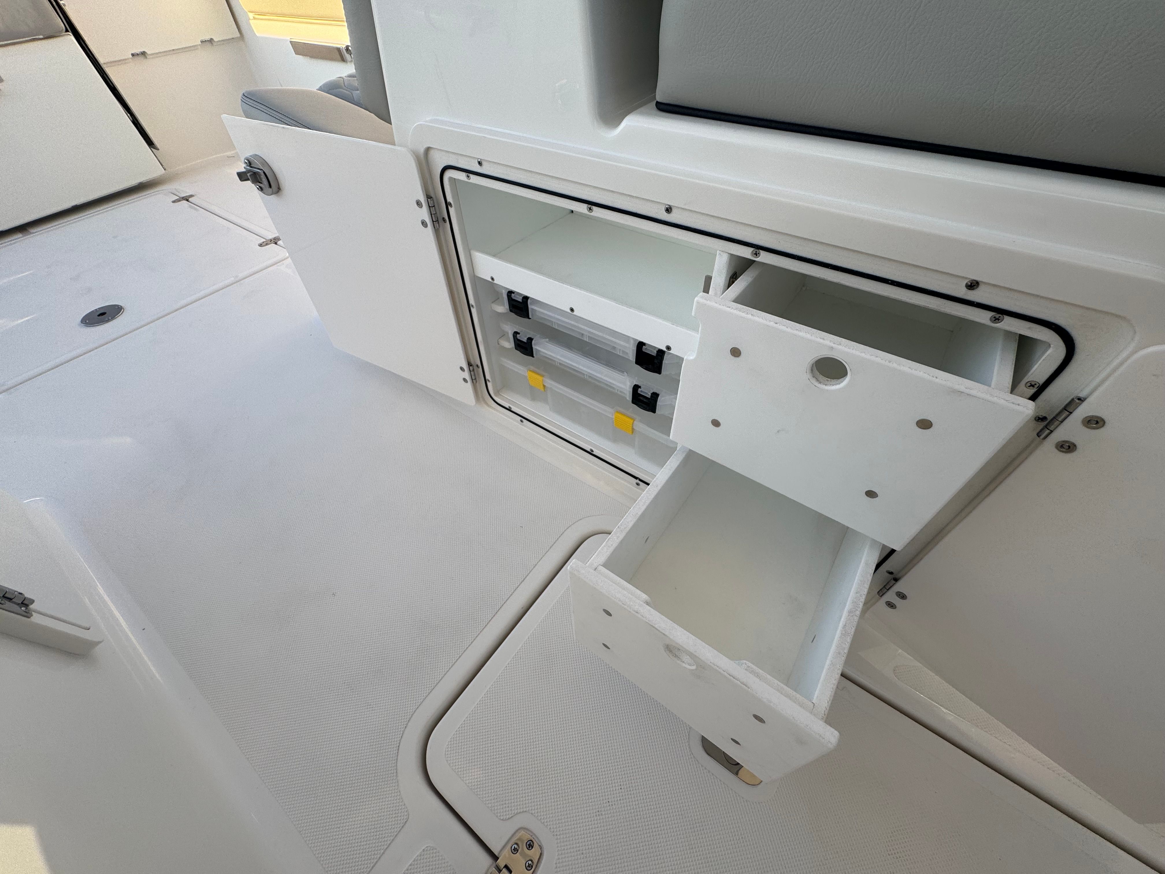 The Pursuit DC 266 excels in practicality, offering thoughtful storage solutions and user-friendly features. The dual console design allows for organized storage of gear, personal items, and safety equipment, keeping the deck clutter-free and accessible. Docking is simplified by the responsive twin-engine setup, while the anchor windlass system with remote makes anchoring quick and effortless. Fuel efficiency is optimized by Pursuit’s advanced hull design, allowing you to spend more time enjoying the water and less time refueling.The removable ski tow and stowable sunshade add flexibility, adapting to your needs whether you’re hosting a party, fishing, or engaging in water sports. The hardtop-mounted rod holders keep fishing rods secure and ready for action, while the Garmin electronics package streamlines navigation and communication. Every aspect of the DC 266 is crafted to make ownership easy, enjoyable, and stress-free.