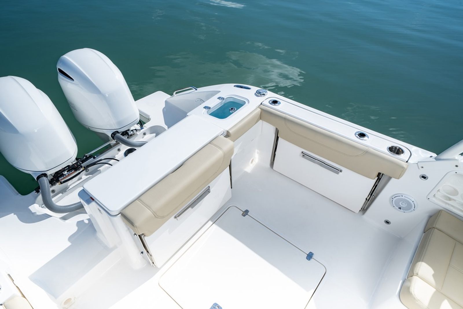 - Twin Yamaha Digital F200 (Pearlescent White) with Digital Electronic Steering (DES)) and Helm Master EX Digital Electronic Control (DEC) (does not include joystick control), Multifunction Display Interface