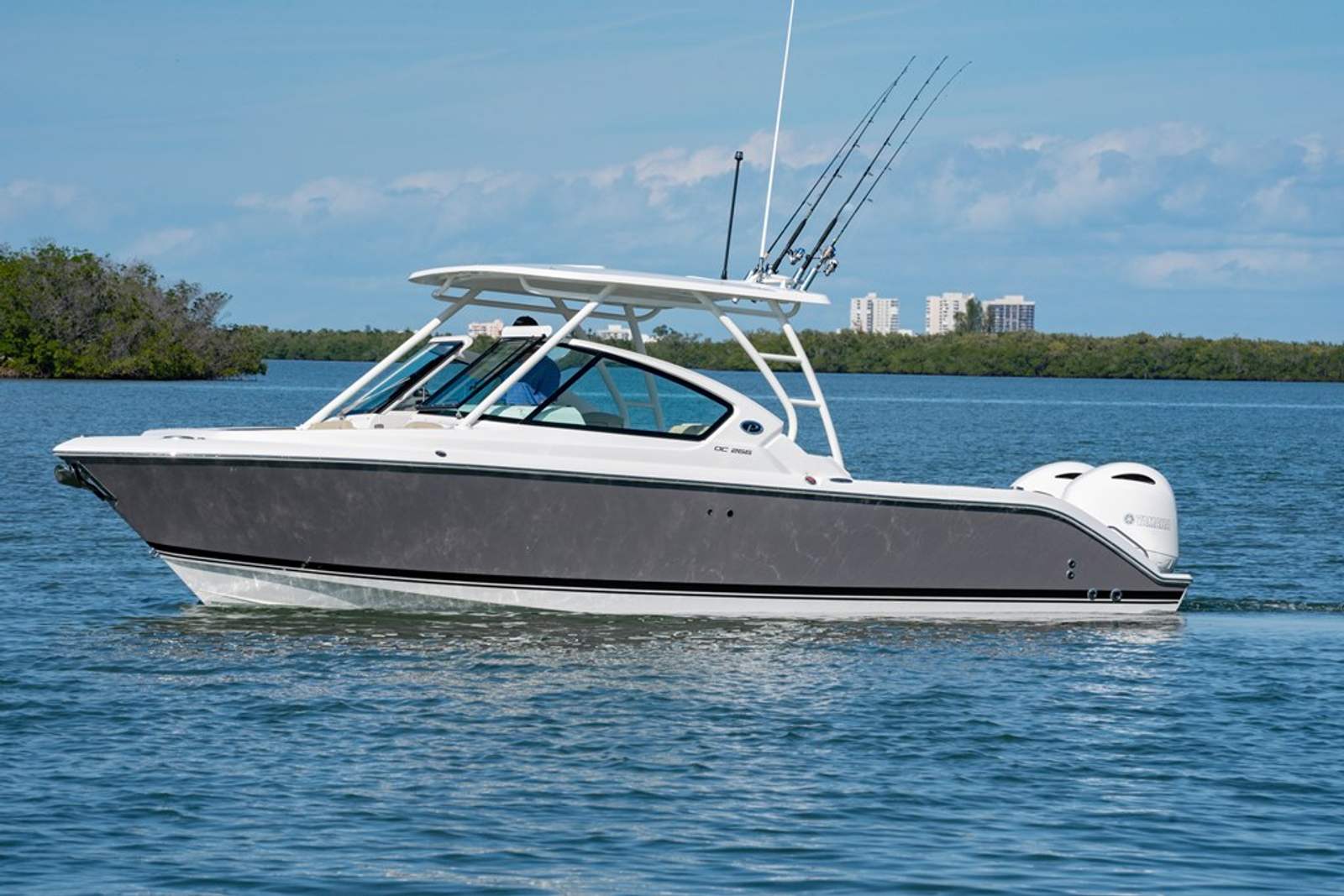 This dual console boat for sale is as practical as it is luxurious. The ample storage options ensure you have plenty of space for gear, water toys, and personal items, keeping the deck clutter-free and organized. The efficient twin Yamaha engines offer impressive fuel economy for their class, so you can spend more time on the water and less time at the fuel dock. Docking and maneuvering are a breeze thanks to the advanced joystick control and electronic steering, making the DC 266 an excellent choice for boaters of all experience levels.The stowable sunshades and versatile seating configurations allow you to quickly adapt the boat to your needs, whether you’re seeking shade, sun, or extra space for guests. The hardtop-mounted rod holders keep your fishing gear secure and ready for action, while the LED accent lighting adds a touch of elegance and safety during evening outings.