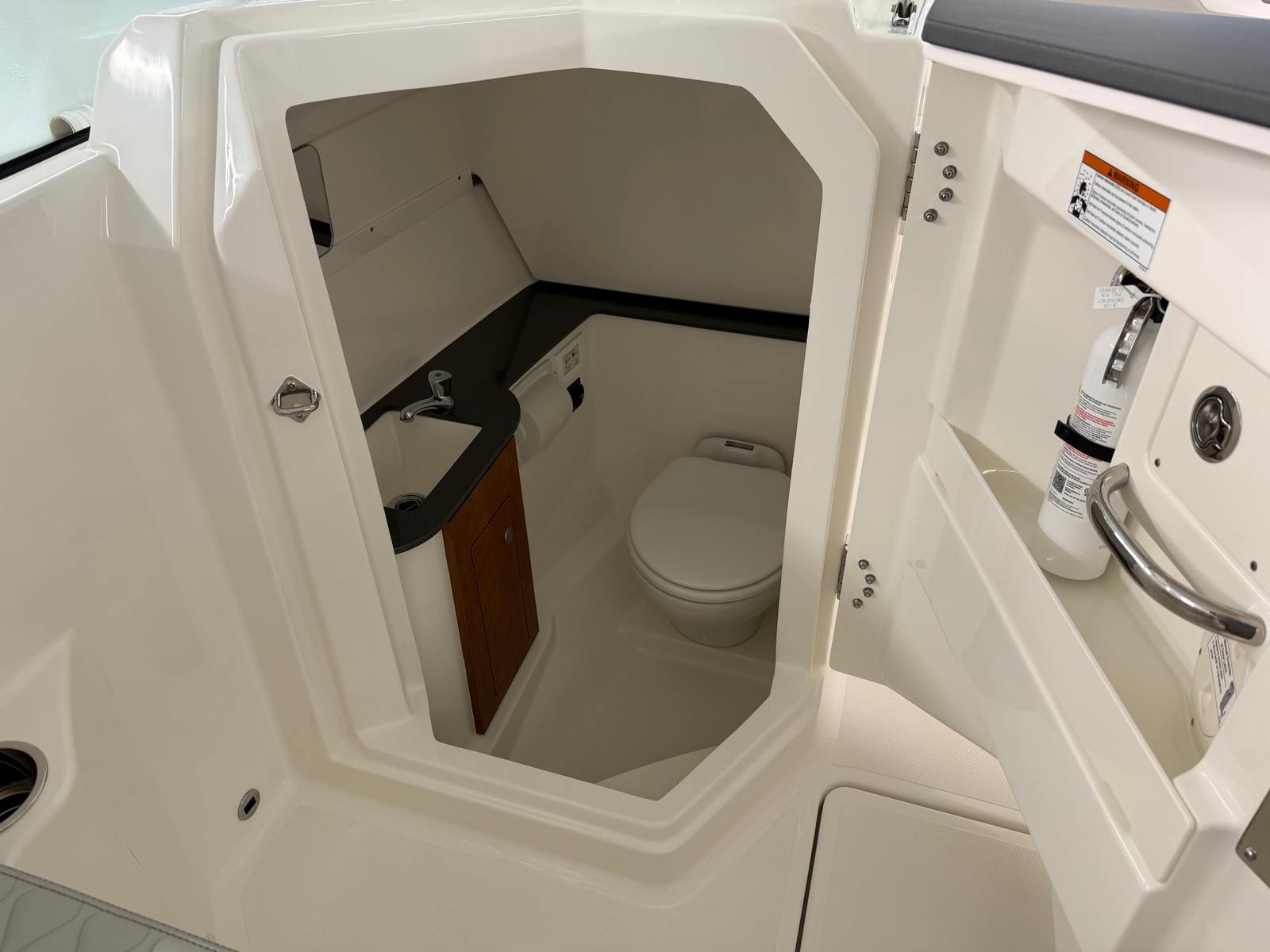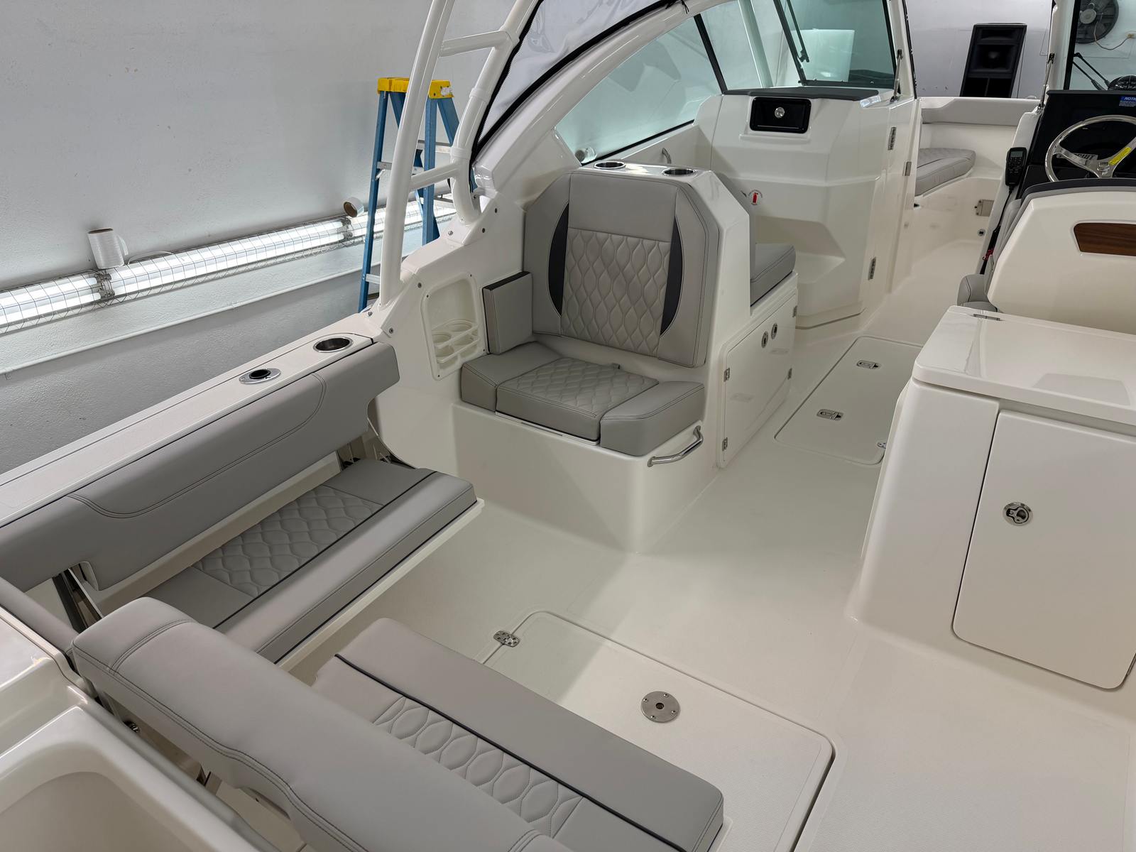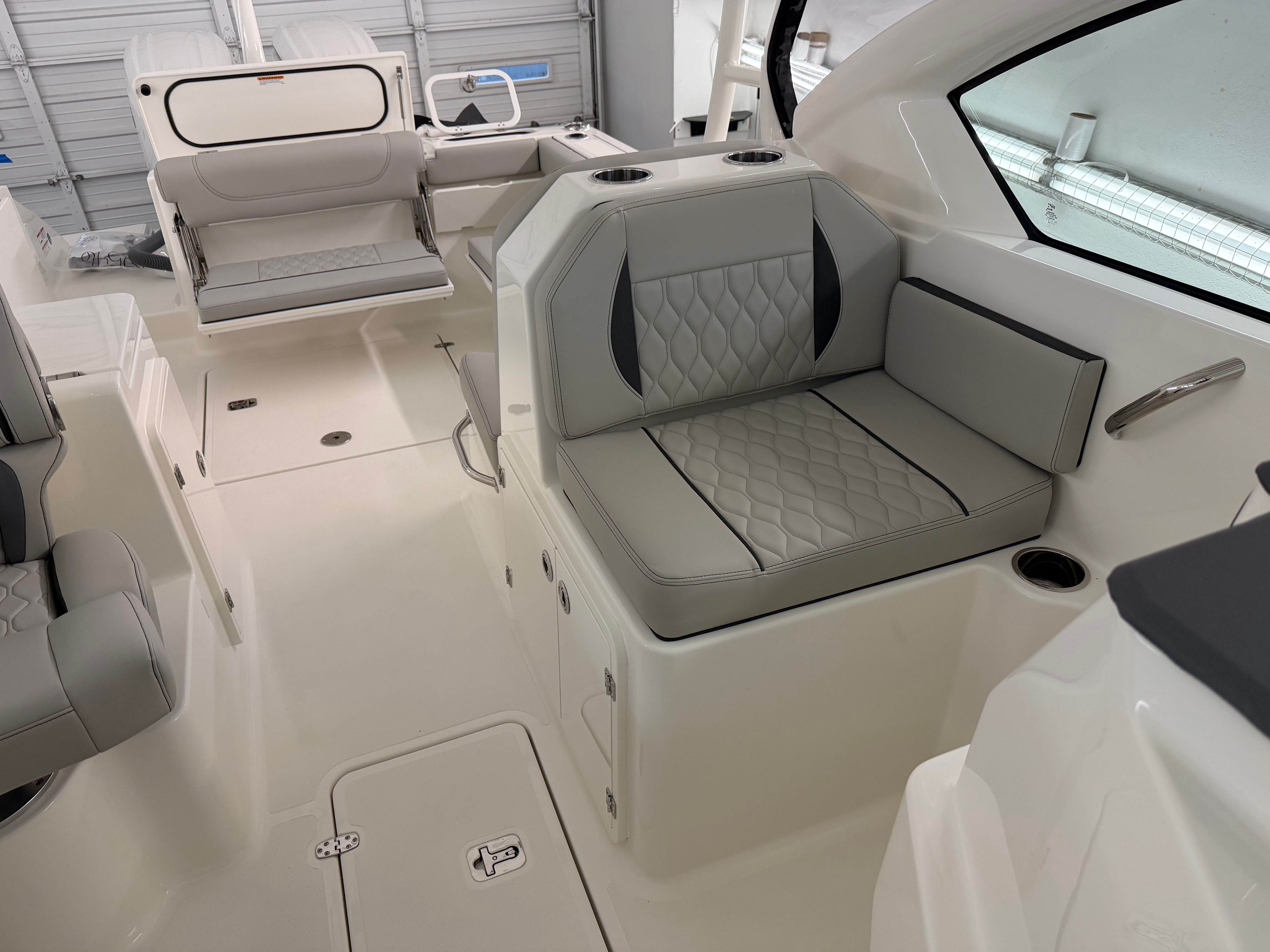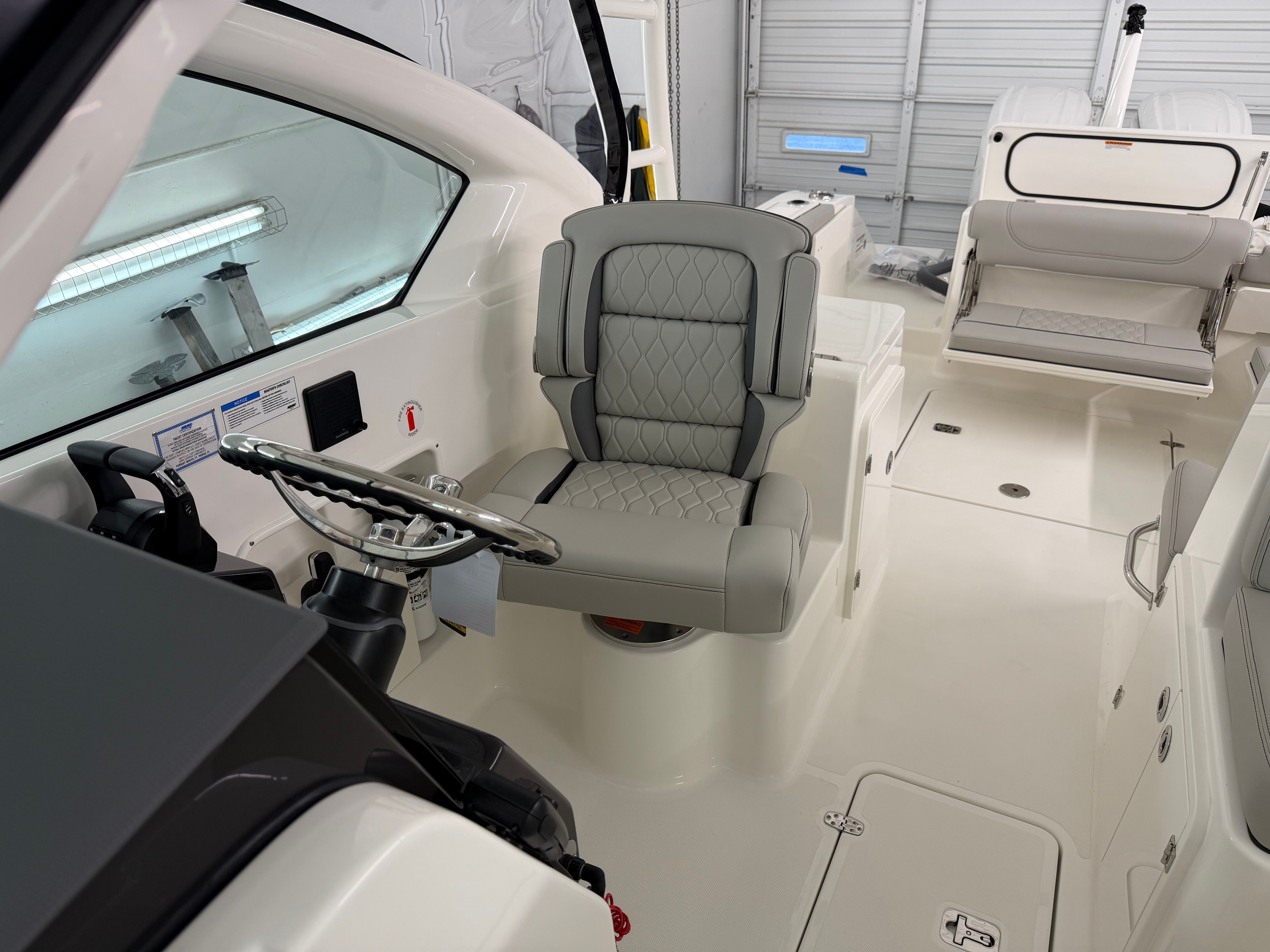 The 2026 Pursuit DC 266 dual console boat is a testament to Pursuit’s commitment to quality and innovation. Measuring an impressive 27.33 feet in length, this vessel offers ample space for relaxation, entertainment, and adventure. The fresh white hull, accented by a bold black bootstripe, exudes modern elegance, while the carbon helm adds a touch of sophistication to the captain’s domain. Every detail of the DC 266 is crafted to provide a seamless blend of style and functionality, making it an ideal choice for boaters who appreciate both aesthetics and performance.