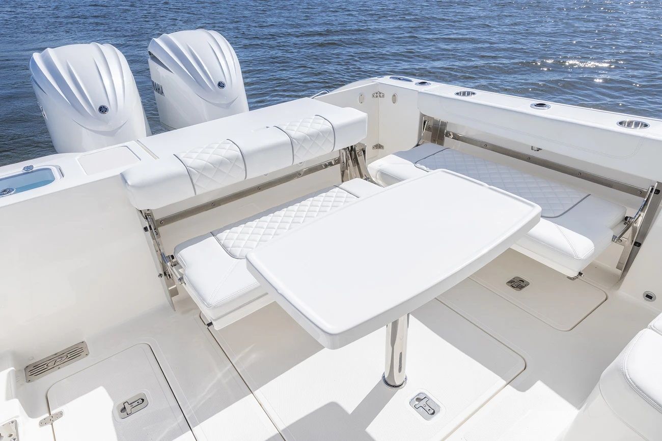 The Pursuit DC 306 is designed with practicality in mind, making ownership easy and enjoyable. The bow thruster simplifies docking, allowing you to maneuver confidently in tight spaces or busy marinas. Dockside power and a battery charger keep your systems running smoothly, so you’re always ready for spontaneous adventures.Ample storage throughout the boat ensures you have plenty of space for gear, water toys, and provisions, keeping the deck clutter-free and organized. The fold-down seat at the port gunwale provides additional seating when needed and tucks away to maximize deck space for fishing or other activities. The efficient Yamaha engines not only deliver impressive performance but also help keep operating costs in check, making this Dual Console boat for sale a smart choice for discerning boaters.