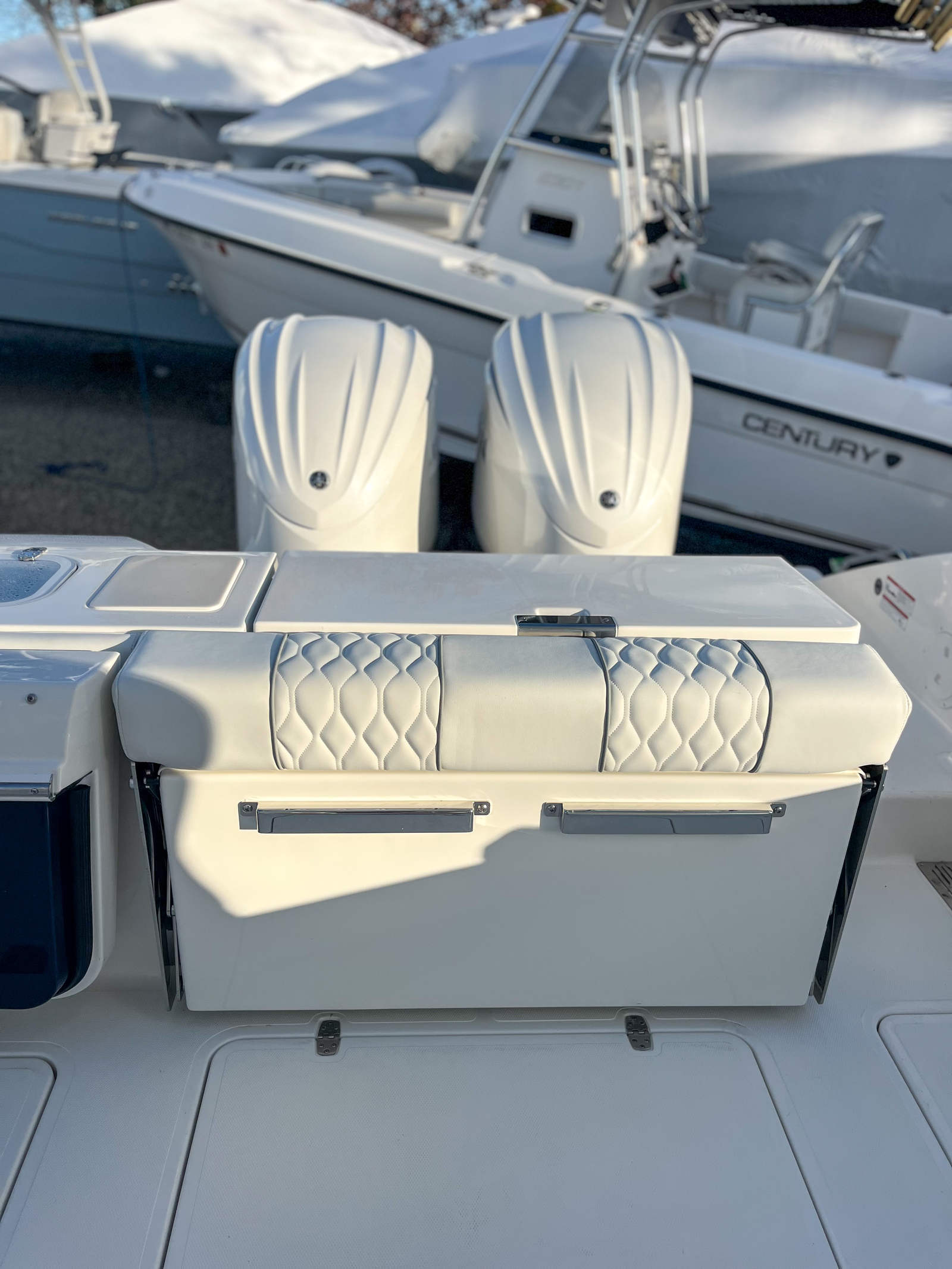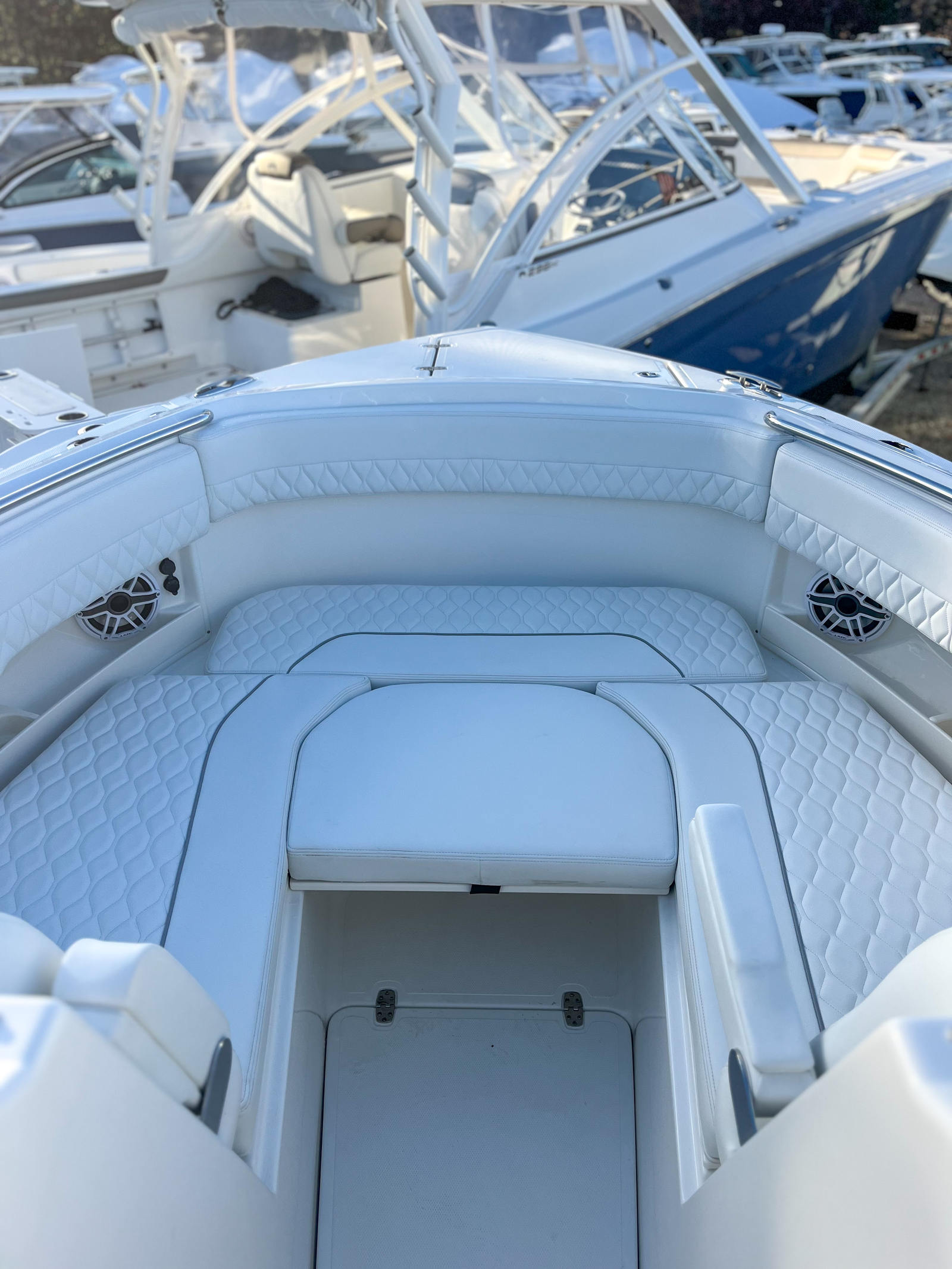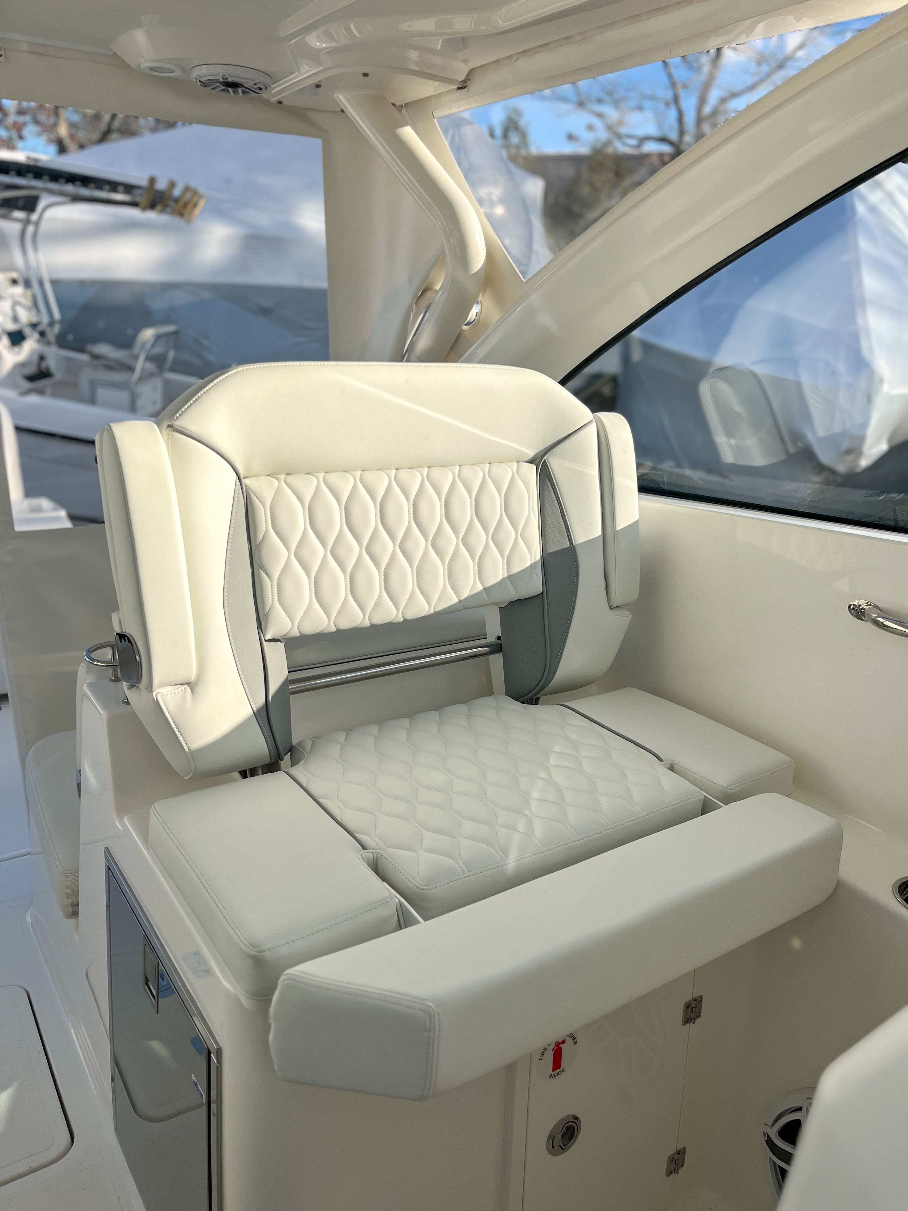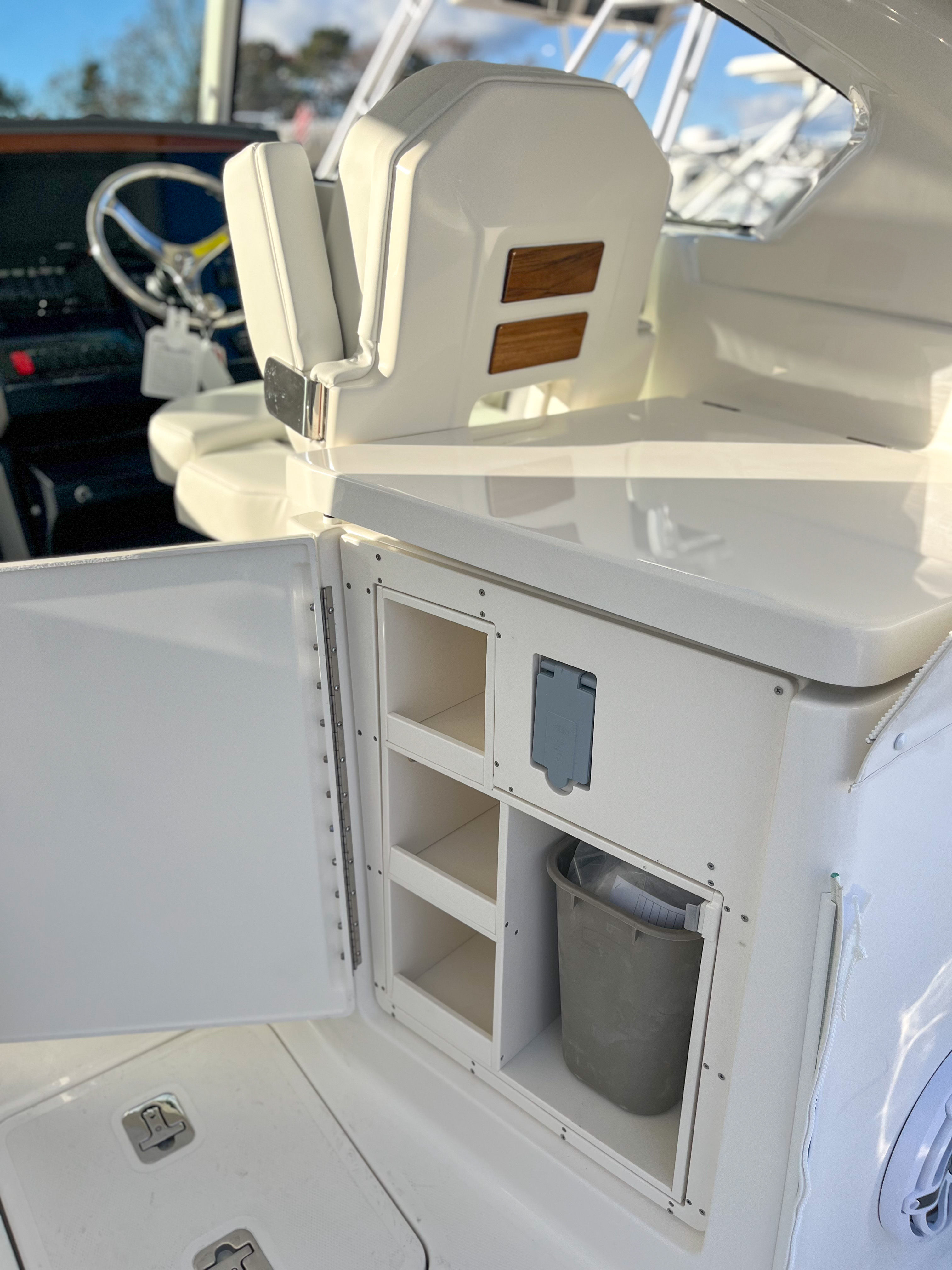 The Pursuit DC 306 is loaded with special features designed to enhance your time on the water. The Multifunction Display Interface keeps you connected and informed, while the manual engine flushing system ensures easy maintenance and longevity for your Yamaha engines. The 120V/60Hz 30 Amp dockside power with cord provides reliable shore power for all your onboard systems, making overnight stays and extended trips more comfortable.For those who appreciate convenience and luxury, the DC 306 includes a 12v 2.3 cubic foot stainless steel refrigerator/freezer, replacing the standard tackle storage and offering plenty of space for refreshments and snacks. The bow Mediterranean-style sunshade is stowable, providing flexible protection from the sun when you need it most. Two bow rod holders cater to anglers, while the fiberglass cockpit table with dedicated storage creates the perfect setting for meals, games, or socializing with friends and family.