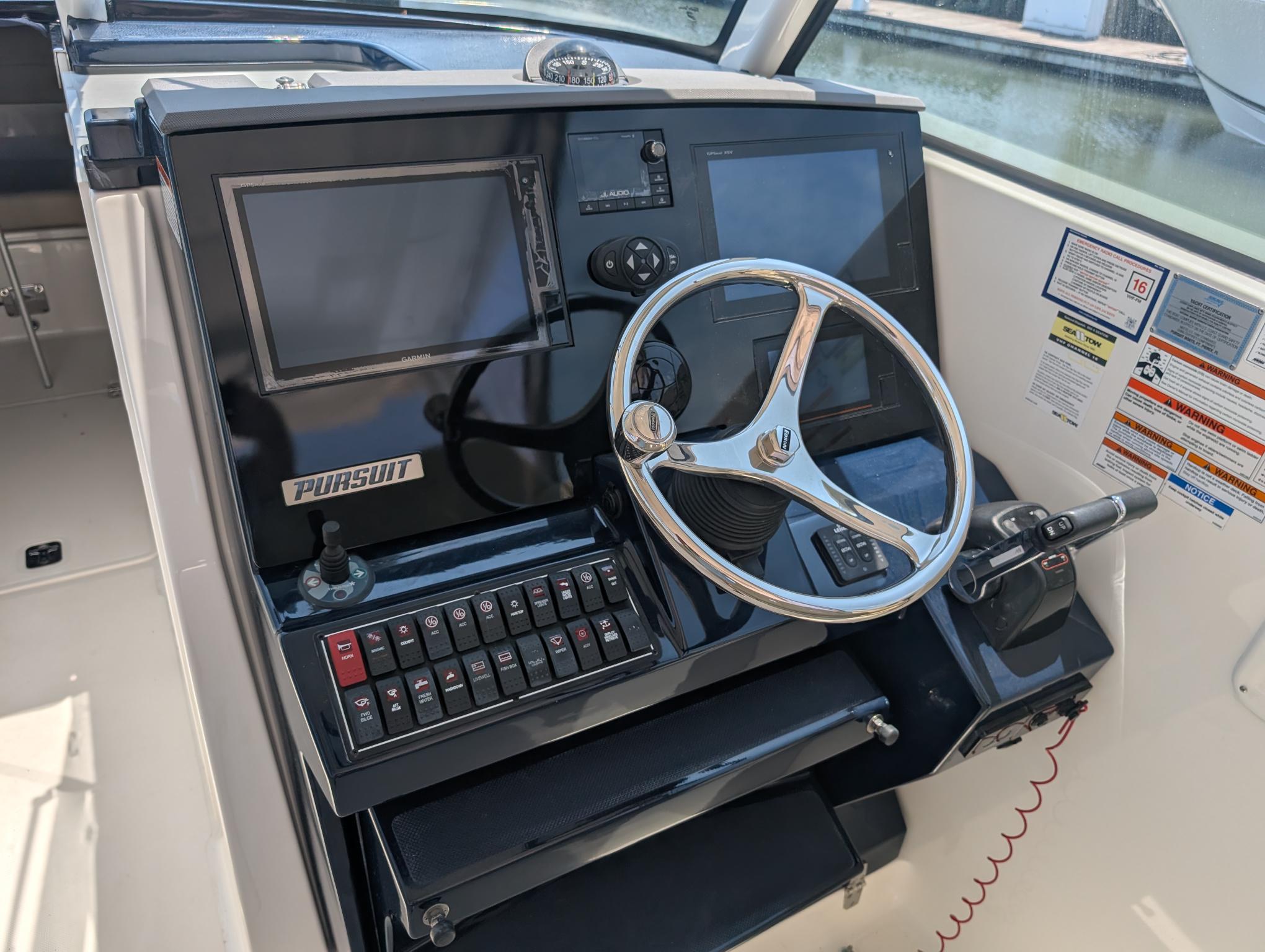 The Pursuit DC 325 is packed with features that enhance both functionality and enjoyment. Its Dual Console layout offers versatile seating and ample protection from the elements, making it ideal for all-weather boating. The spacious cockpit and bow seating areas provide plenty of room for guests to relax, socialize, or soak up the sun. Thoughtful storage solutions throughout the boat ensure that all your gear, from fishing tackle to water toys, is easily accessible and securely stowed.The helm is designed for intuitive operation, with clear instrumentation and ergonomic controls that put everything you need at your fingertips. The Pursuit DC 325 is also equipped with advanced navigation and safety systems, giving you peace of mind whether you are exploring new waters or returning to your favorite spots. The high-quality materials and finishes used throughout the boat reflect Pursuit’s commitment to craftsmanship and durability, ensuring that your investment will continue to deliver value and enjoyment for years to come.