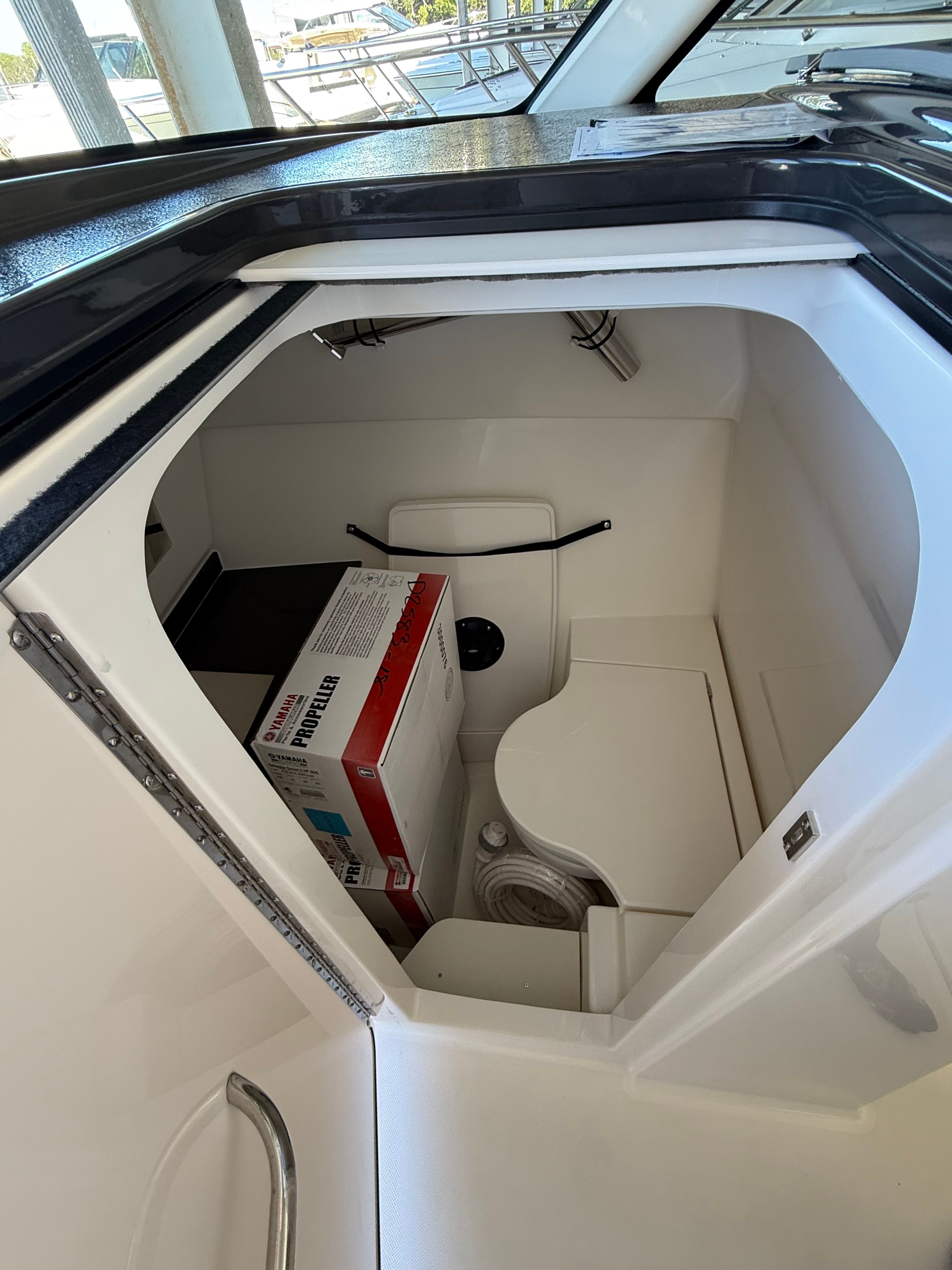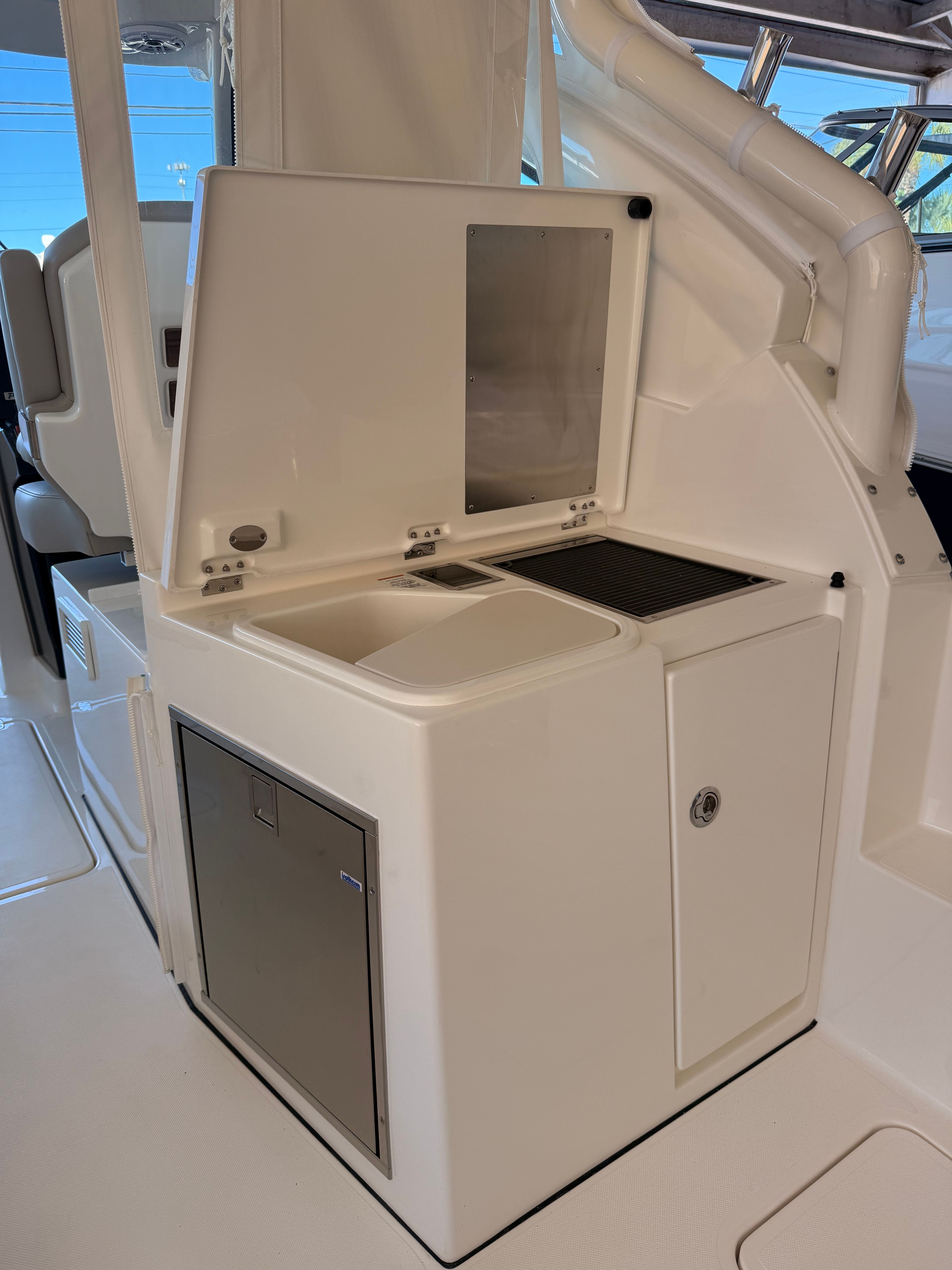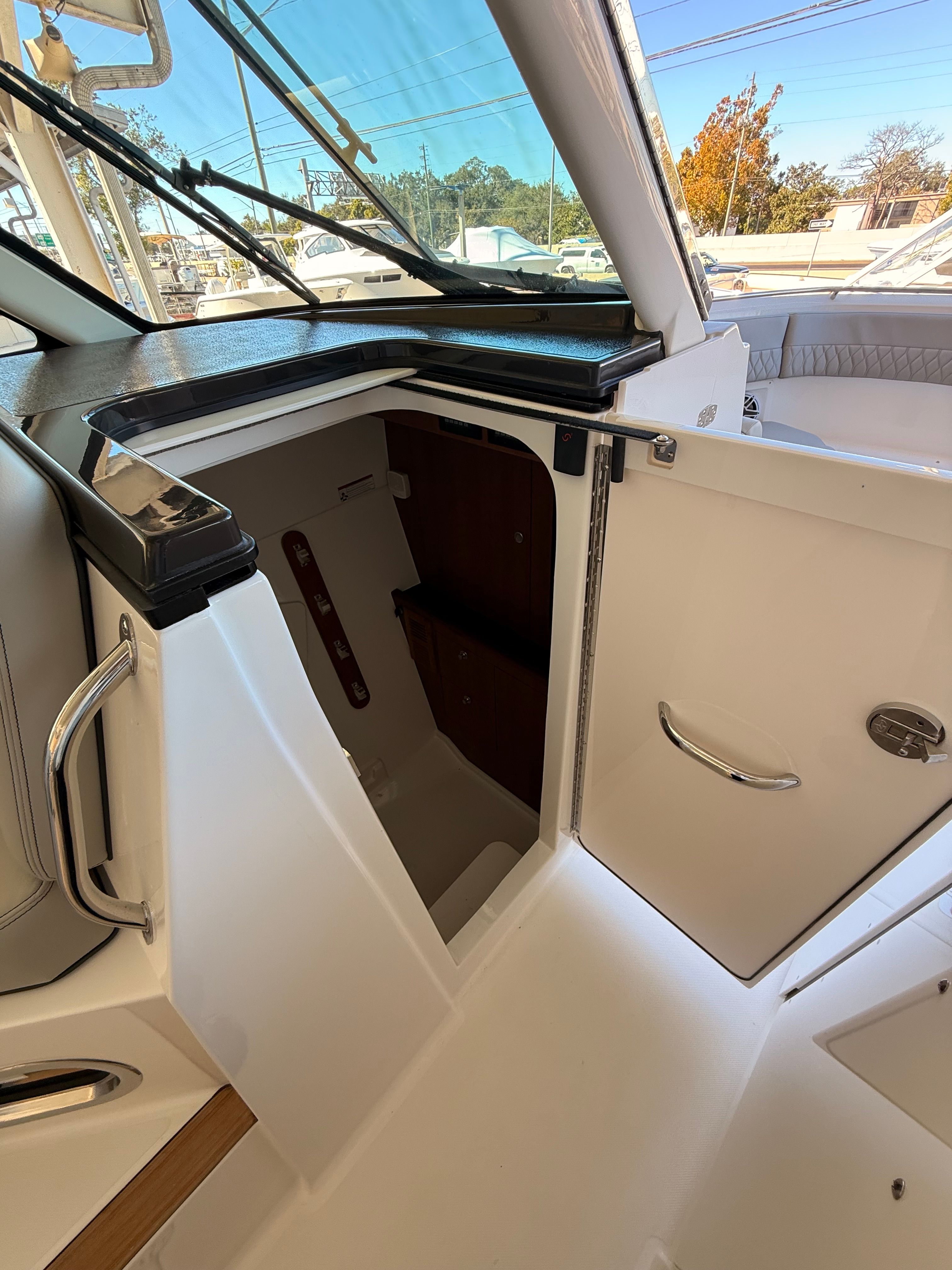 The Pursuit DC 326 is loaded with premium features designed to elevate your time on the water. The 110V/60Hz cockpit grill with drip pan lets you prepare delicious meals right on deck, making it easy to entertain family and friends. The 120V/60Hz generator (5.0kW Fischer Panda Genset) with a 16-gallon diesel tank ensures you have reliable power for all your onboard systems, no matter how long your adventure lasts. For ultimate comfort, the air conditioning package with reverse cycle provides climate control in both the cabin/head (6,000 BTU) and cockpit (12,000 BTU), keeping you cool on hot summer days or warm during cooler evenings. The bridge deck teak table with storage adds a touch of elegance and practicality, offering a perfect spot for dining or socializing.