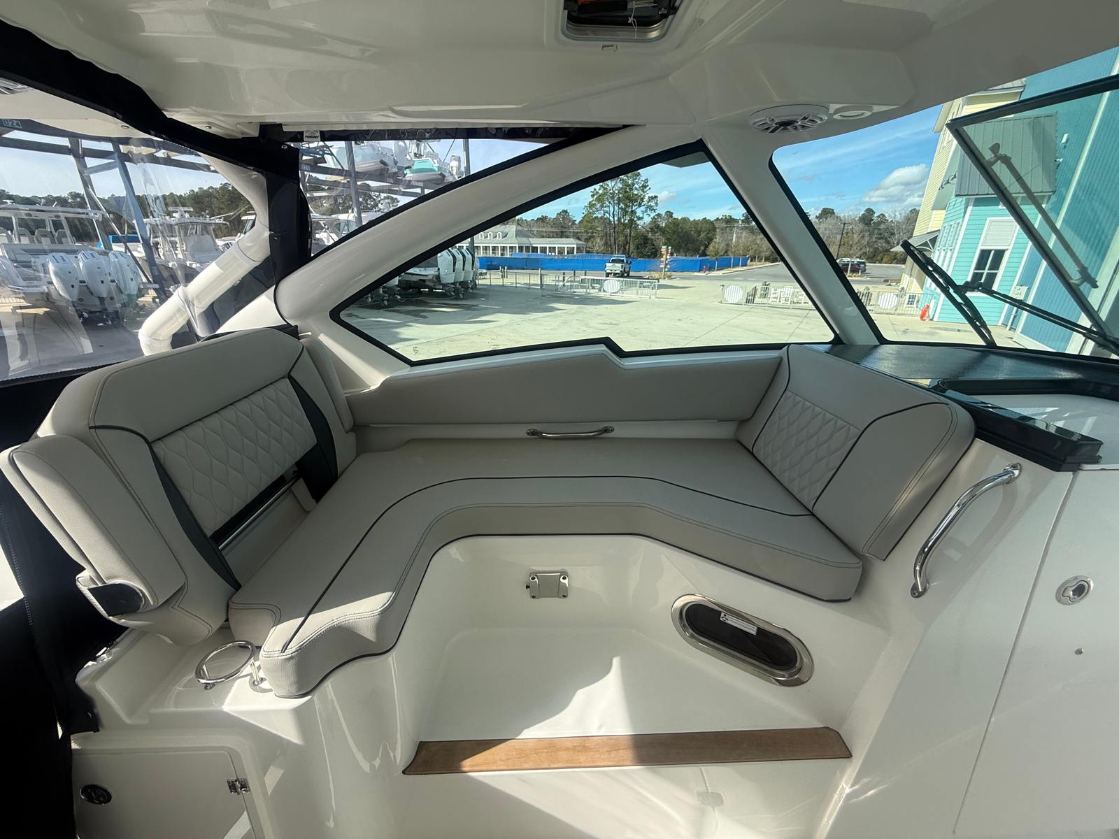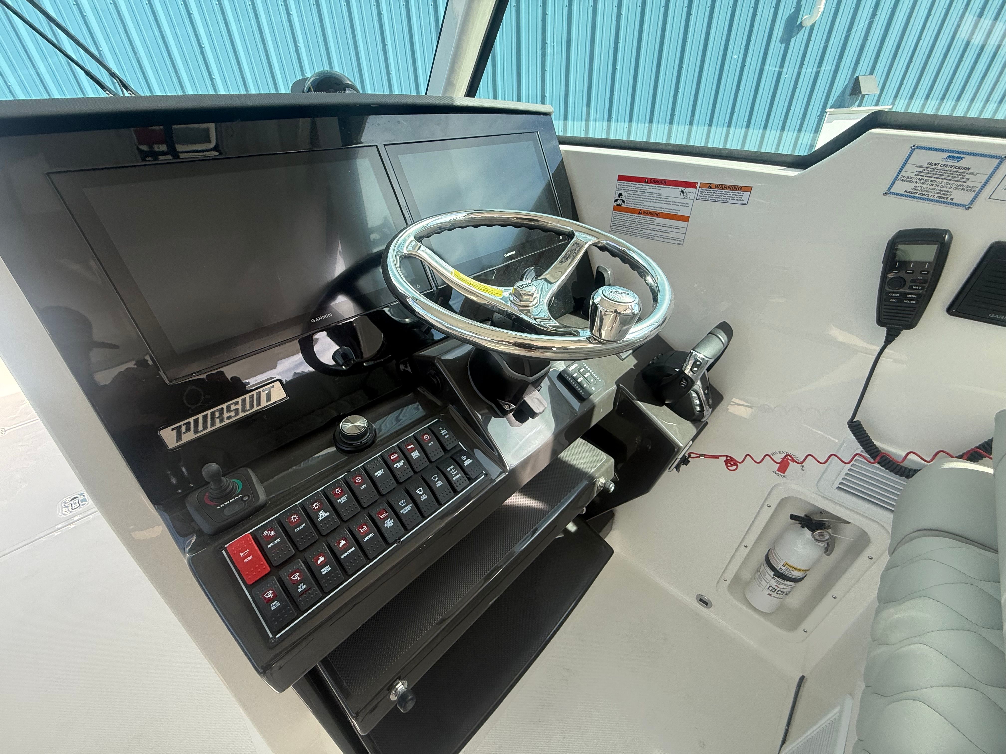 The Pursuit DC 326 is loaded with premium features designed to enhance your time on the water. The hull side in fresh white and the black bootstripe create a striking visual appeal, while the black canvas provides both style and protection. The carbon-finished helm is ergonomically designed for optimal control and visibility, ensuring a comfortable and commanding position at the wheel. The Sea Salt and Tranquil Sea upholstery not only looks stunning but also offers plush seating for you and your guests.For those who love to entertain, the 110V/60Hz cockpit grill with a drip pan is perfect for preparing delicious meals right on board. The onboard generator ensures you have reliable power for all your electrical needs, while the 12V, 1.7 cu. ft. cooler with a chill plate under the aft-facing seat keeps your beverages and snacks perfectly chilled throughout the day. The air conditioning package provides a cool and comfortable environment, even on the hottest summer days, making every outing a pleasure.