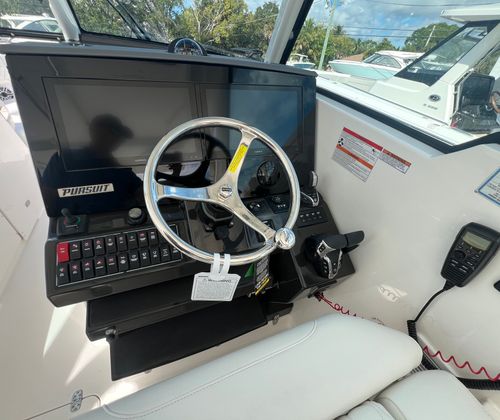 The Pursuit DC 326 comes loaded with premium features that set it apart from other boats in its class. The helm features a sophisticated Carbon color scheme, adding a touch of modern elegance to your command center. For those who love to entertain, the 110V/60Hz cockpit grill with a drip pan allows you to prepare delicious meals right on board, while the 120V/60Hz generator (5.0kW Fischer Panda Genset) with a 16-gallon diesel tank ensures you have reliable power for all your onboard systems.A 12V, 1.7 cu. ft. cooler with a chill plate under the aft-facing seat keeps your beverages and snacks perfectly chilled, enhancing your relaxation and enjoyment. The air conditioning package with reverse cycle offers 6,000 BTU for the cabin and head, and 12,000 BTU for the cockpit (requires a drop curtain), ensuring comfort in any weather. The bridge deck teak table with storage provides a stylish and functional space for dining or socializing, while the custom retractable Makefast sunshade with one-touch operation offers instant protection from the sun.Music lovers will appreciate the premium stereo upgrade, delivering crystal-clear sound throughout the boat. For added safety and convenience, the ACR RCL-100 LED spotlight with remote control at the helm ensures excellent visibility during nighttime navigation.