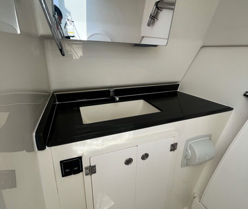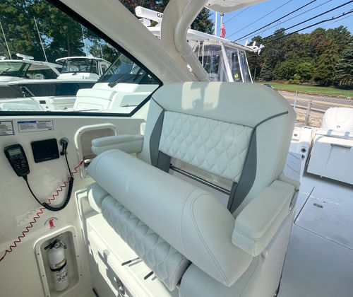 This Pursuit boat for sale is loaded with premium features that enhance both functionality and enjoyment. The Multifunction Display Interface puts navigation and system controls at your fingertips, while the Flag Blue hull and Platinum bootstripe add a touch of elegance to its exterior profile. The helm, also finished in Flag Blue, is ergonomically designed for maximum comfort and visibility. Inside, the Tranquil Sea interior and upgraded white/gray upholstery create a luxurious atmosphere, perfect for relaxing after a day on the water. The Bridge Deck Teak Table with storage offers a convenient space for dining or socializing, while the custom-tuned 8-channel DSP amp and premium M6 Sport speakers with full-spectrum backlighting deliver an immersive audio experience. The Sirius receiver, complete with a three-month subscription, ensures you have access to your favorite music and entertainment while cruising. For added safety and convenience, the ACR RCL-100 LED spotlight with remote control at the helm provides powerful illumination for nighttime navigation. The underwater LED lighting (three Quattro Spectrum units) enhances the boat’s visual appeal and creates a vibrant ambiance for evening gatherings.