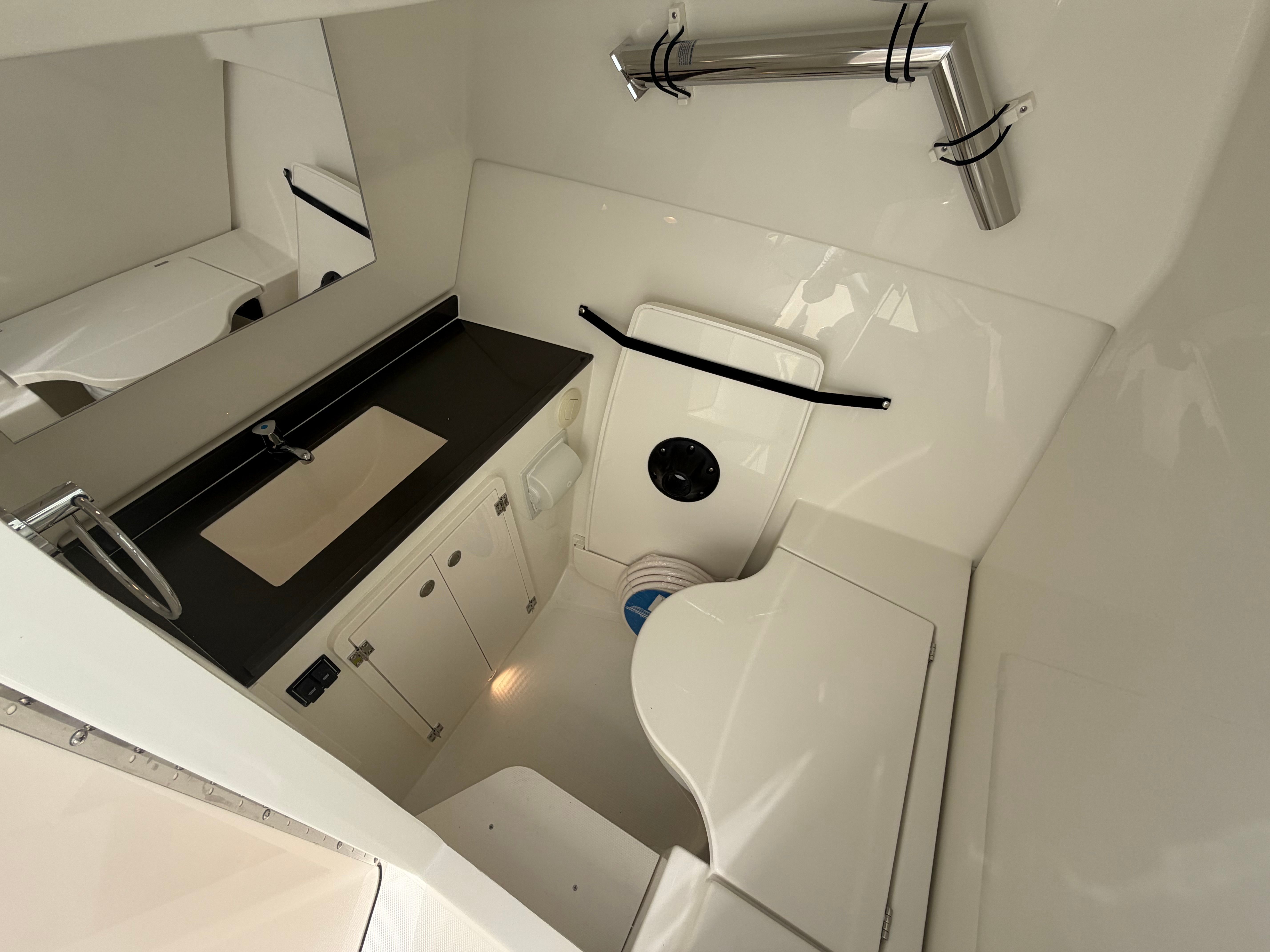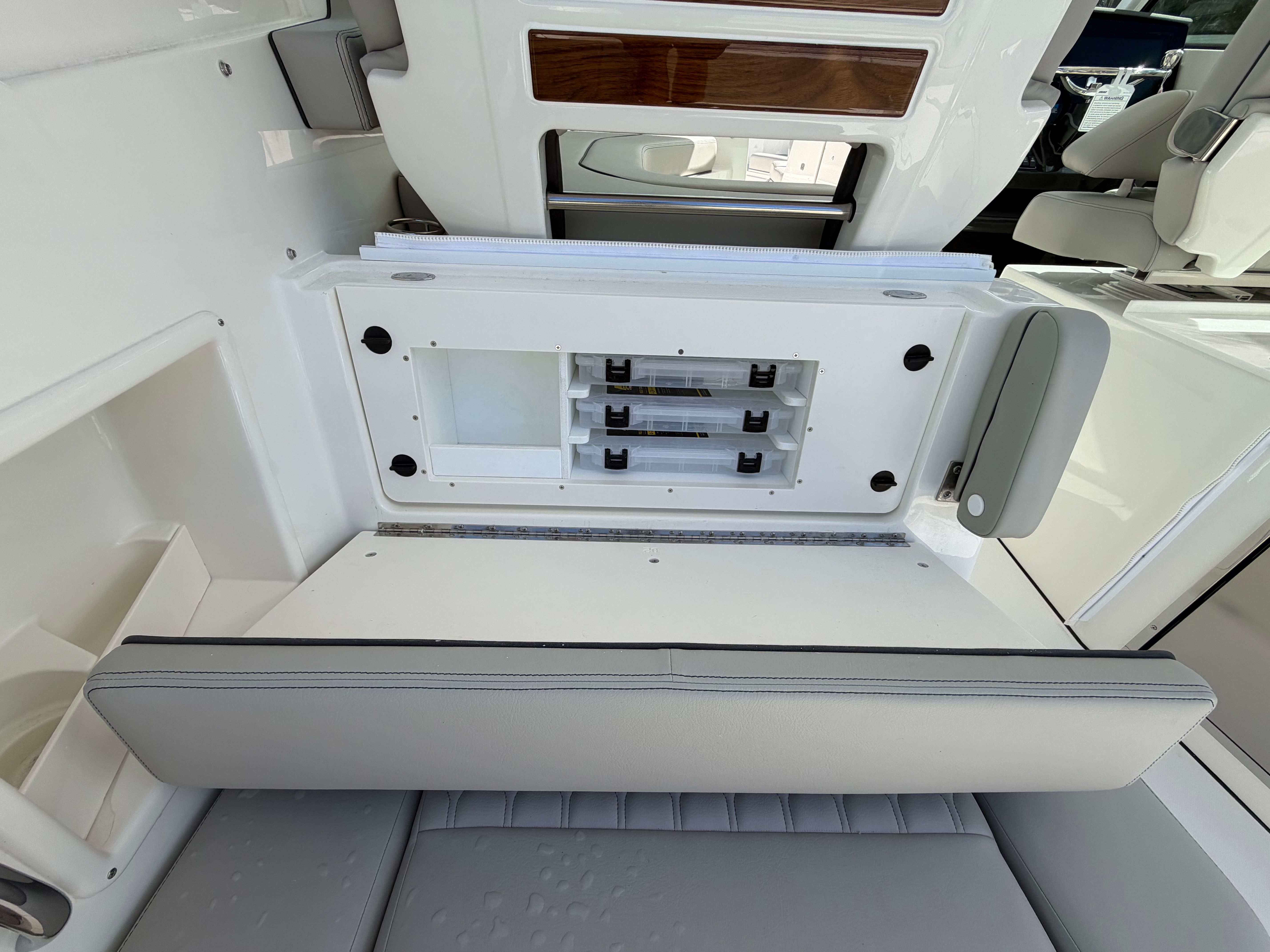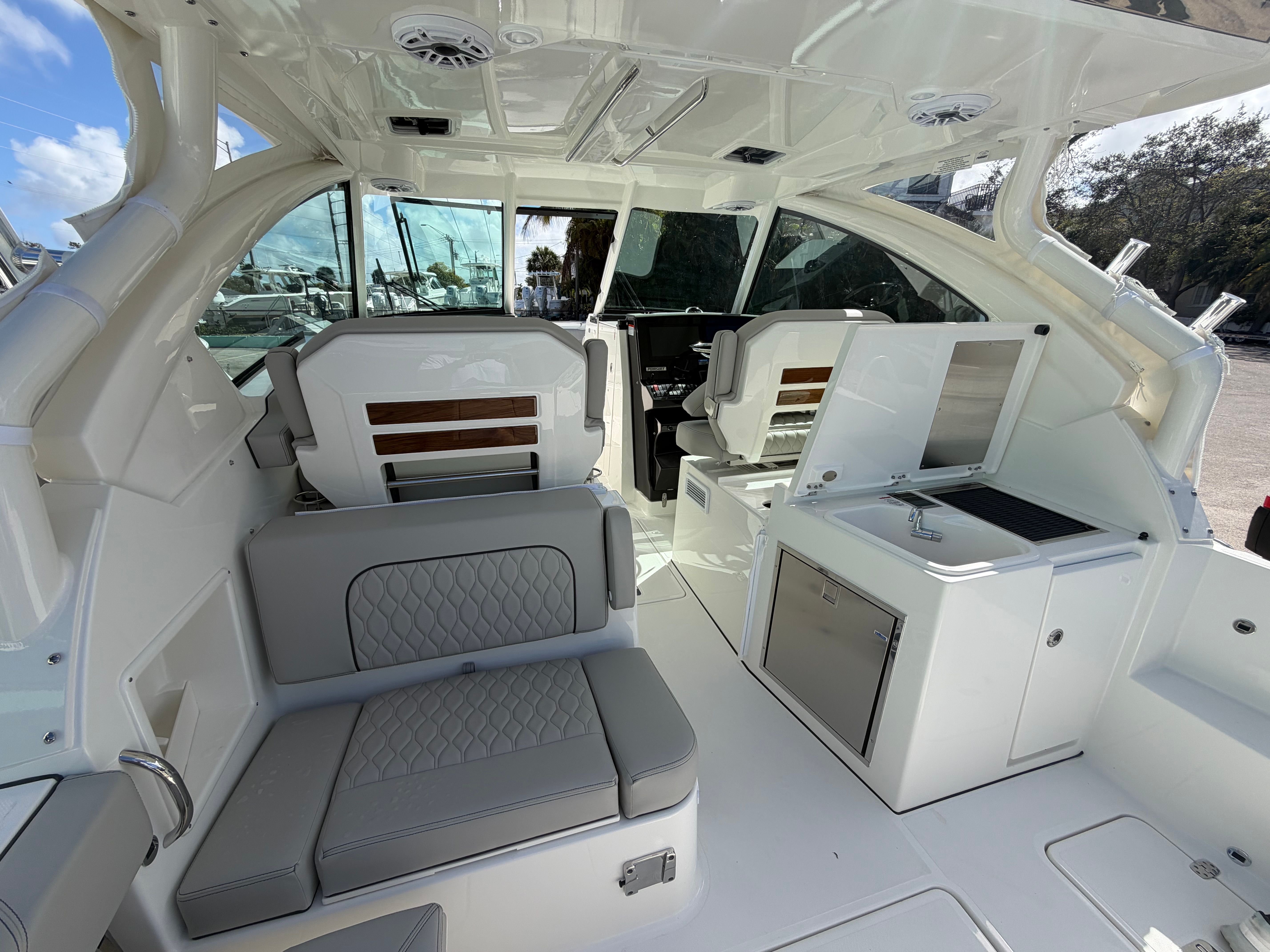 The Pursuit DC 326 is loaded with premium features designed to elevate your boating experience. The helm and footrest are finished in a stylish Carbon color, complementing the overall aesthetic and providing a comfortable command center for the captain. The diesel genset ensures reliable onboard power, while the Cabin Bridgedeck A/C Package keeps the interior cool and comfortable, even on the hottest days. Entertain guests with the cockpit grill, perfect for preparing delicious meals while enjoying the open air. The hardtop-mounted LED sportlight at the helm control enhances visibility during evening cruises, adding both safety and style to your outings.