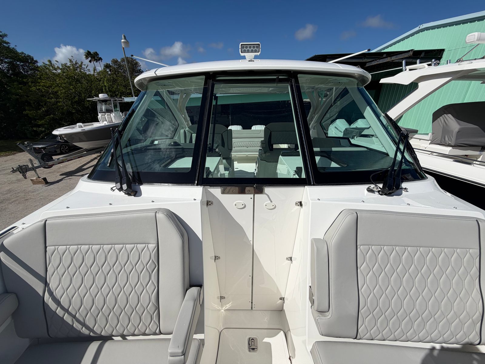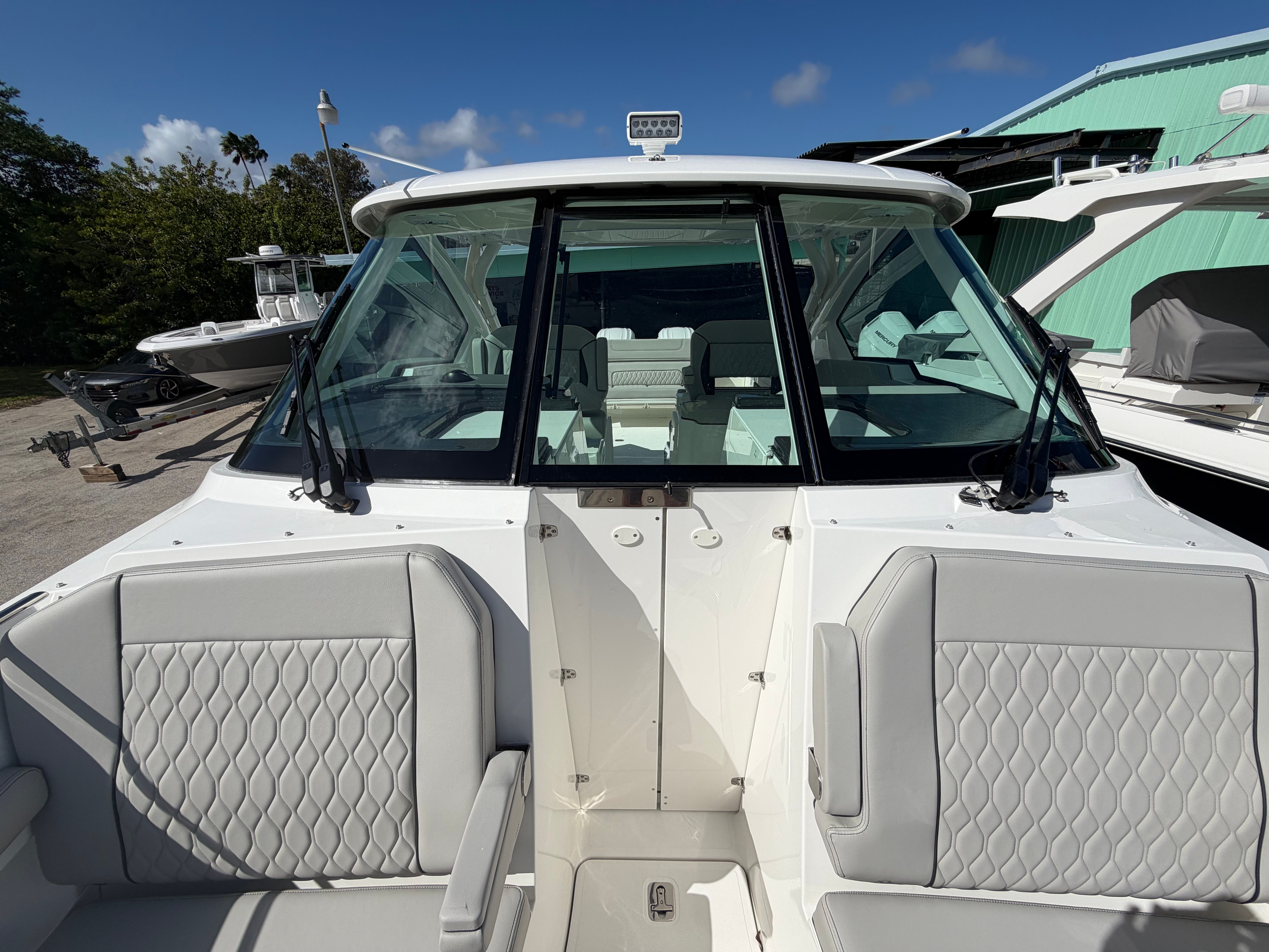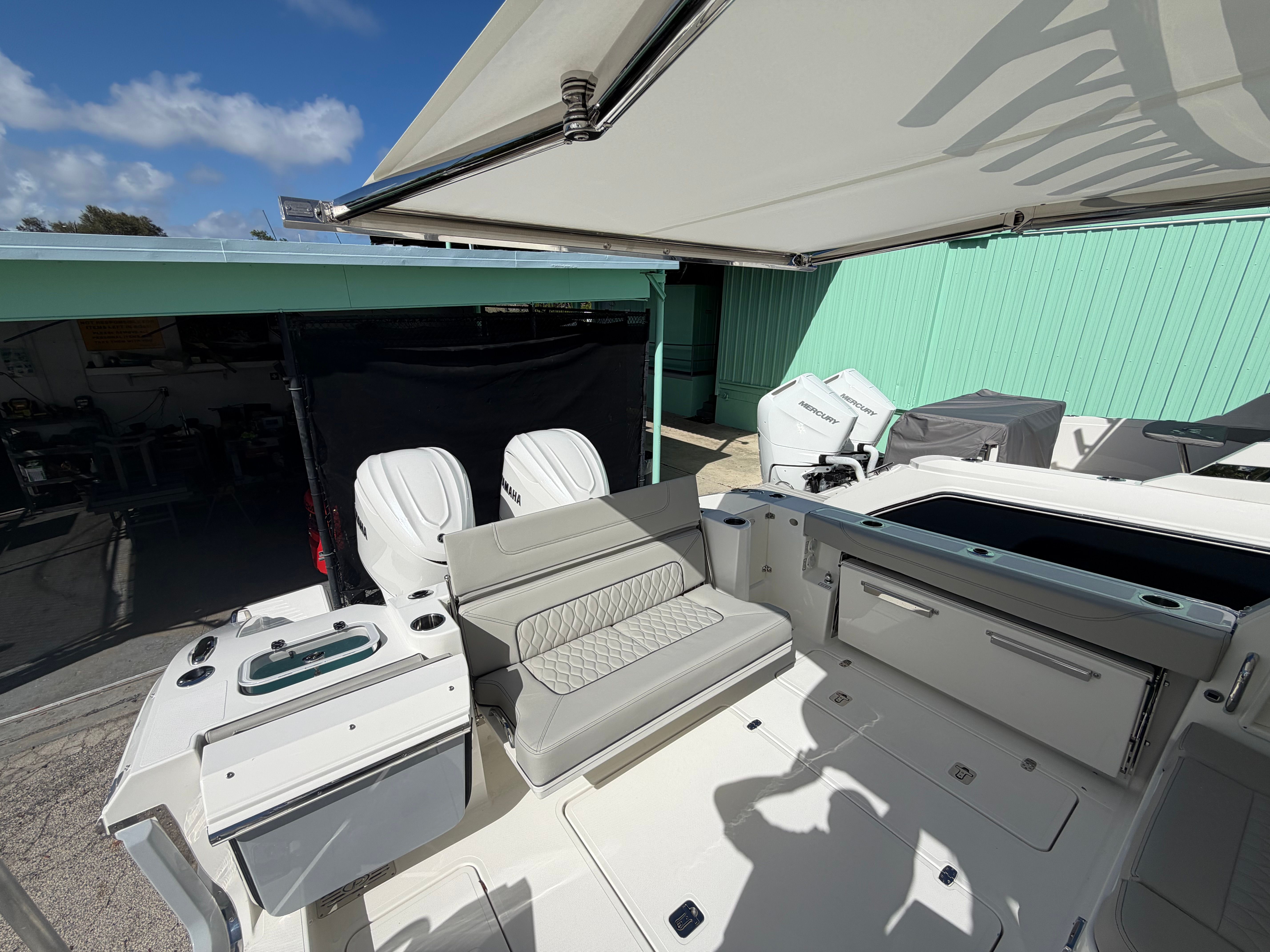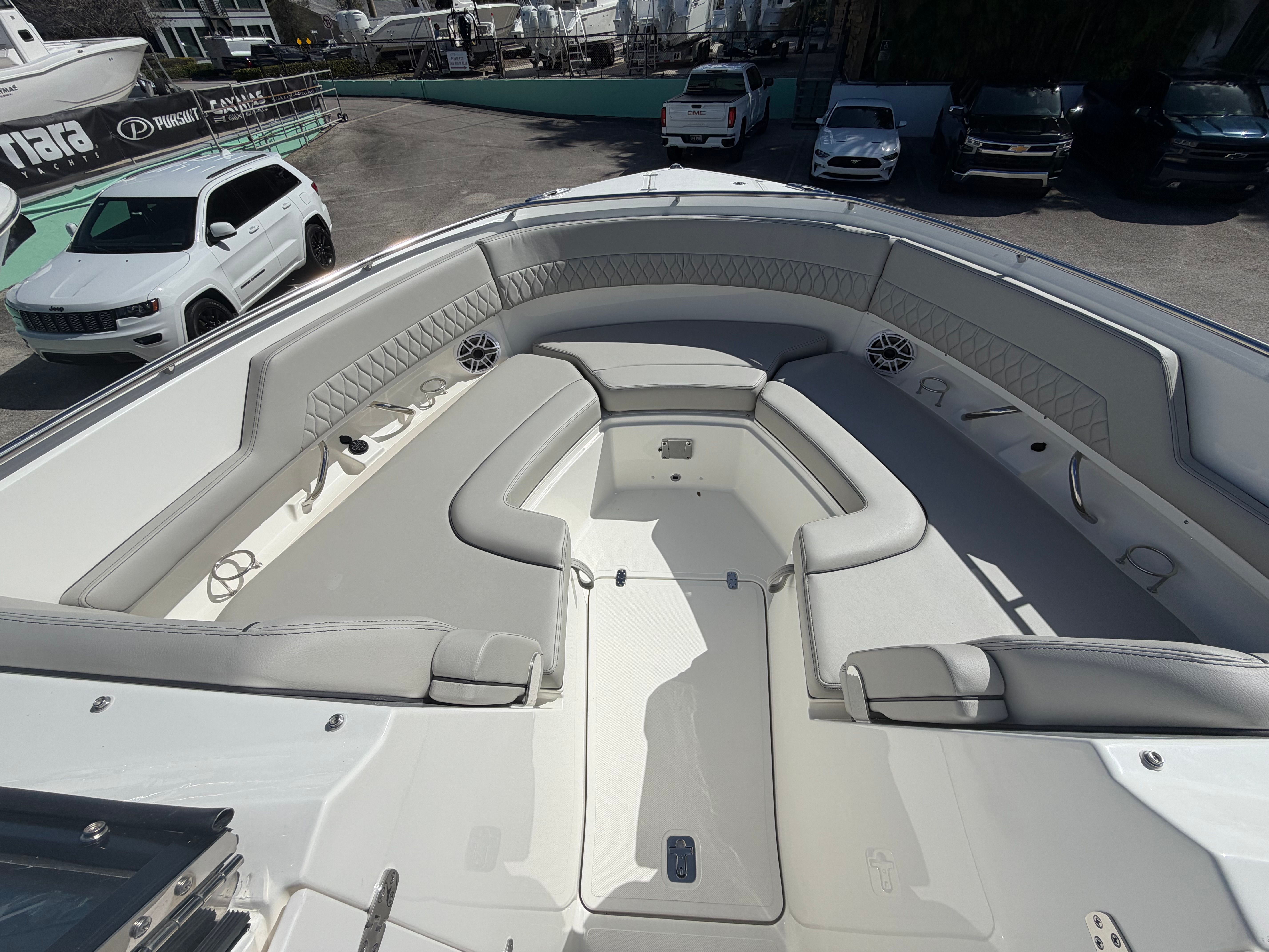 The Pursuit DC 326 is as practical as it is luxurious. The dual console configuration provides excellent storage options for gear, water toys, and personal belongings, keeping the deck clutter-free and organized. The advanced Helm Master system simplifies docking, making it easy for boaters of all experience levels to handle the vessel with precision. The efficient diesel genset and air conditioning package ensure comfort and convenience during extended trips, while the cockpit grill adds a touch of culinary delight to your adventures. The hardtop-mounted LED sportlight enhances safety during nighttime operations, giving you peace of mind wherever your journey takes you.