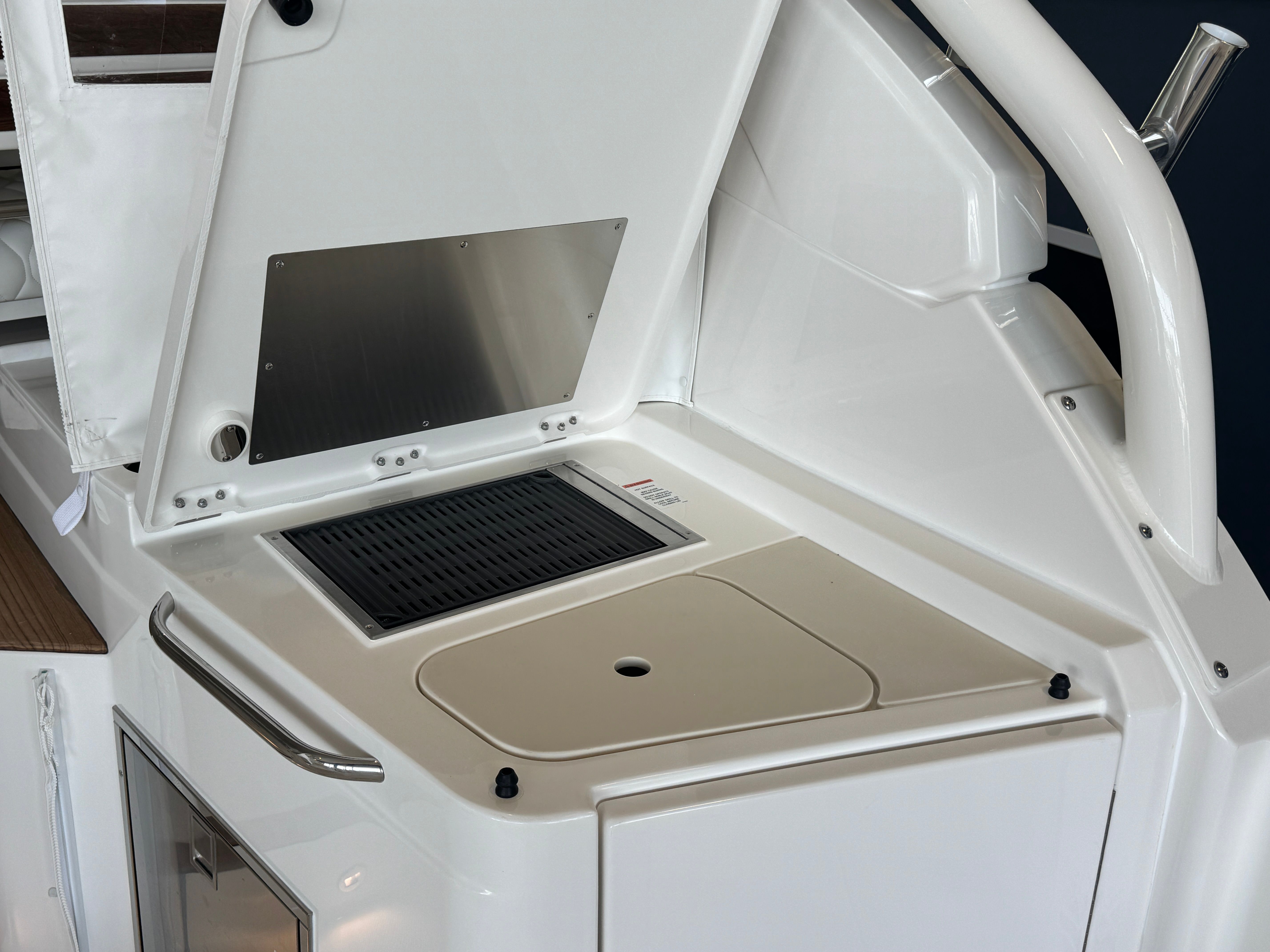 The 2026 Pursuit 365 DC is loaded with premium features designed to enhance your boating lifestyle. Enjoy the convenience of a 12v, 2.3 cu. ft. cooler with a chill plate located under the aft-facing seat, perfect for keeping refreshments cold during long days on the water. The 240v/60Hz cockpit air conditioning system with 16,000 BTU ensures you and your guests remain cool and comfortable, even on the hottest summer days. Navigation and control are elevated with a second Garmin widescreen 16" display, providing advanced technology at your fingertips for safer and more enjoyable voyages.For those who appreciate both style and function, the boat features a white aft curtain Stamoid and a matching bow tonneau cover, offering protection from the elements while maintaining a crisp, elegant appearance. The bridgedeck teak table with dedicated storage adds a touch of luxury and provides a perfect setting for onboard dining or socializing. The cadet gray instrument cover protects your helm from the sun and weather, ensuring your controls remain in pristine condition. A custom retractable Makefast sunshade with one-touch operation allows you to easily create shade or bask in the sun as you please. The forward poly table offers additional space for entertaining or relaxing at the bow.