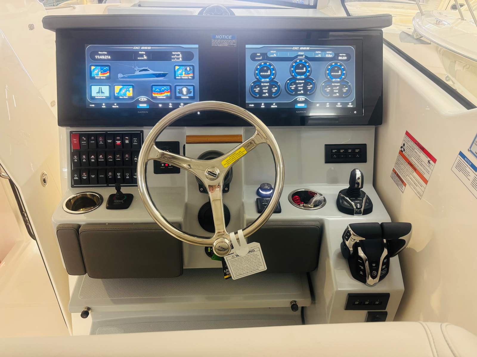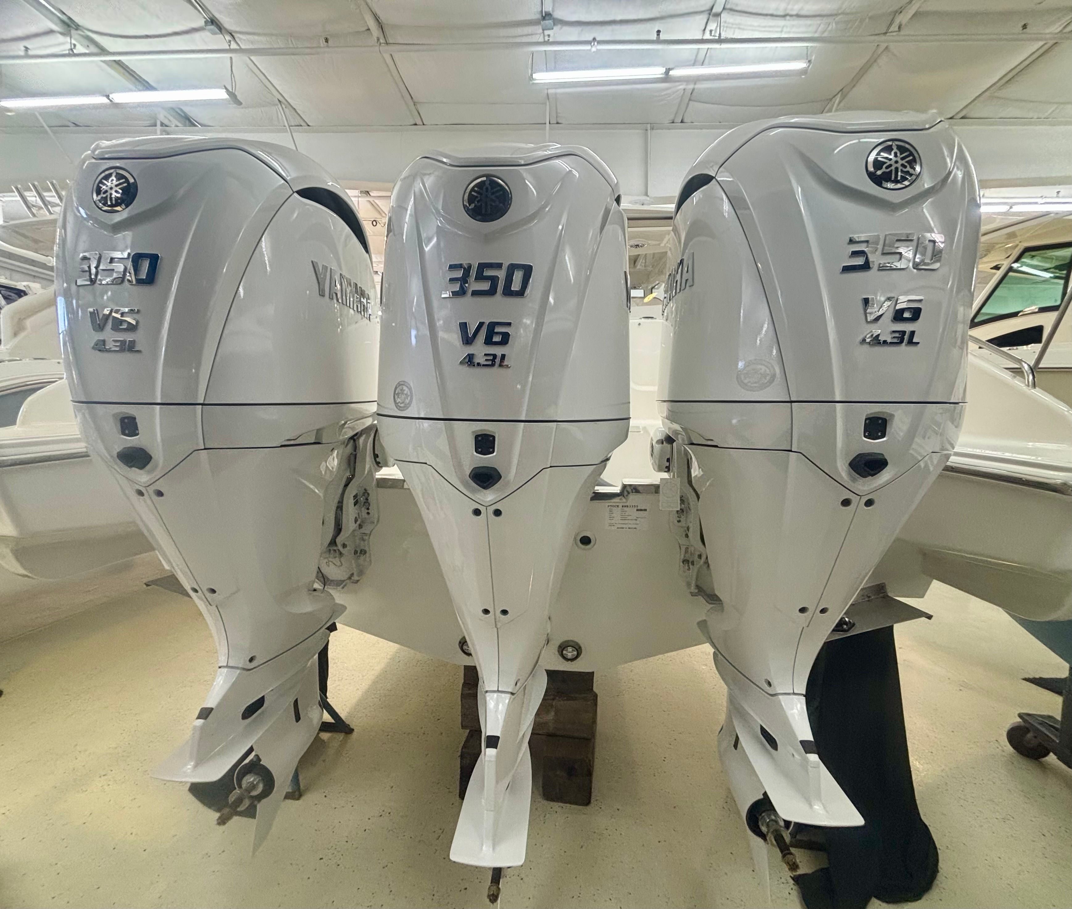 - Triple Yamaha F350 V6 Offshore (Pearlescent White) w/Integrated Digital Electric Steering (DES) and Helm Master EX Digital Electronic Control (DEC), and Yamaha Joystick Contol with Full Maneuverability (Set Point and Autopilot), Multifunction Display Interface and Manual Engine Flushing System