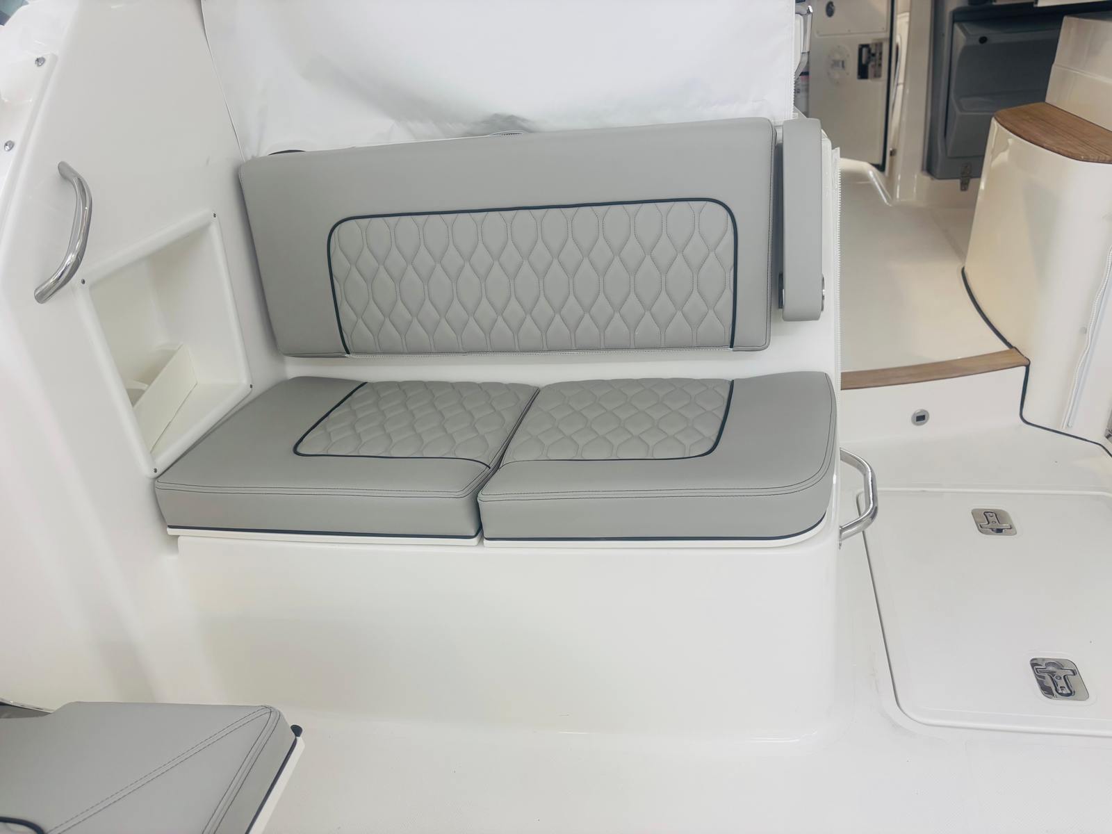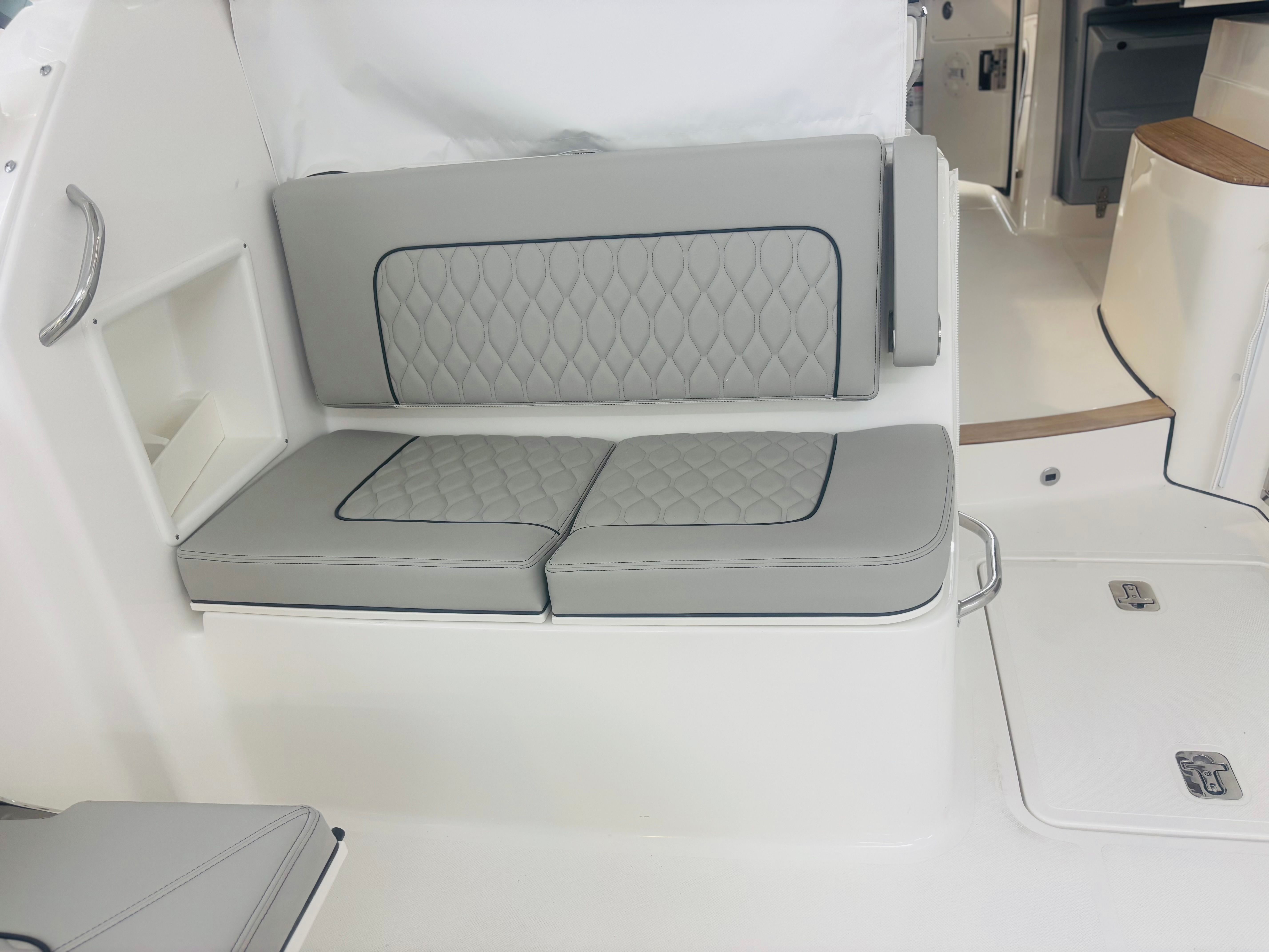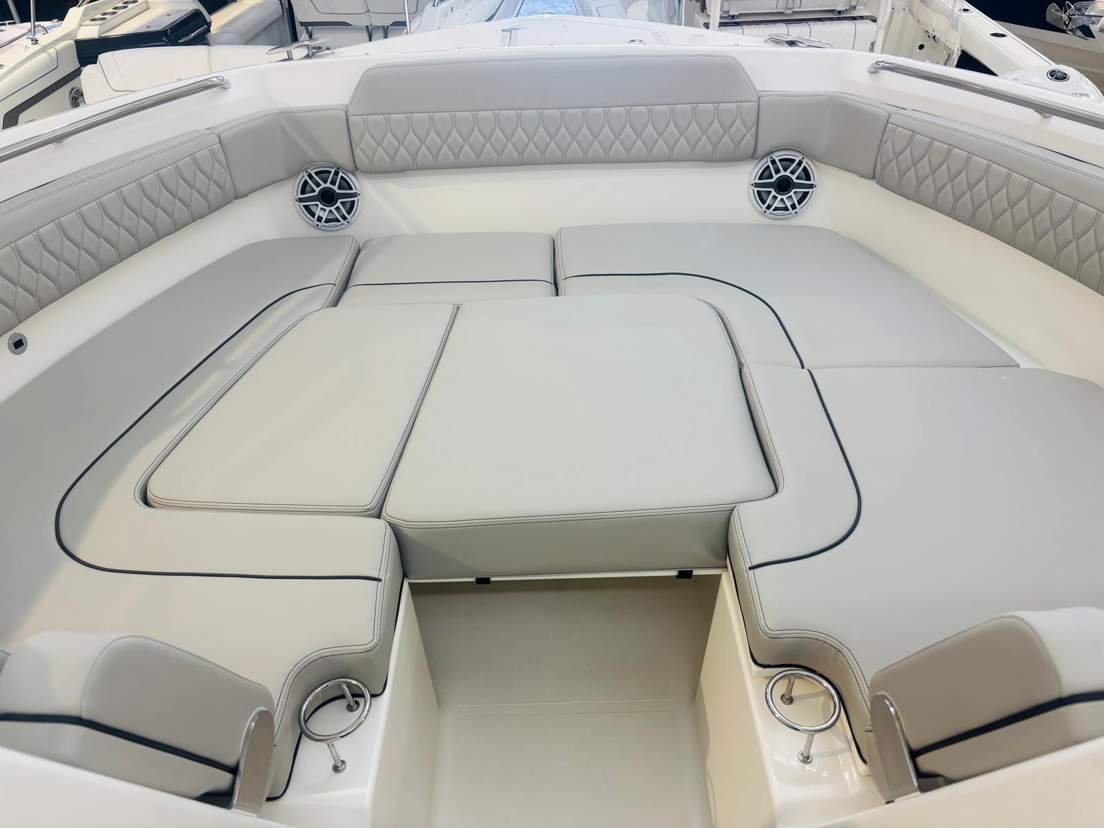 The Pursuit DC 365 is as practical as it is luxurious. The manual engine flushing system streamlines maintenance, helping to extend the life of your engines. The cooler with a chill plate keeps food and beverages fresh, perfect for long days on the water. The stowable sunshades and retractable Makefast sunshade offer flexible protection from the elements, while the teak table and ample seating make it easy to host gatherings or enjoy meals al fresco.Docking and maneuvering are simplified with the Yamaha joystick control and Set Point system, making it easy to handle the boat in marinas or tight spaces. The underwater lights not only enhance the boat’s appearance but also improve visibility and safety during nighttime outings. The spotlight with remote control adds another layer of convenience, ensuring you can navigate confidently after dark.