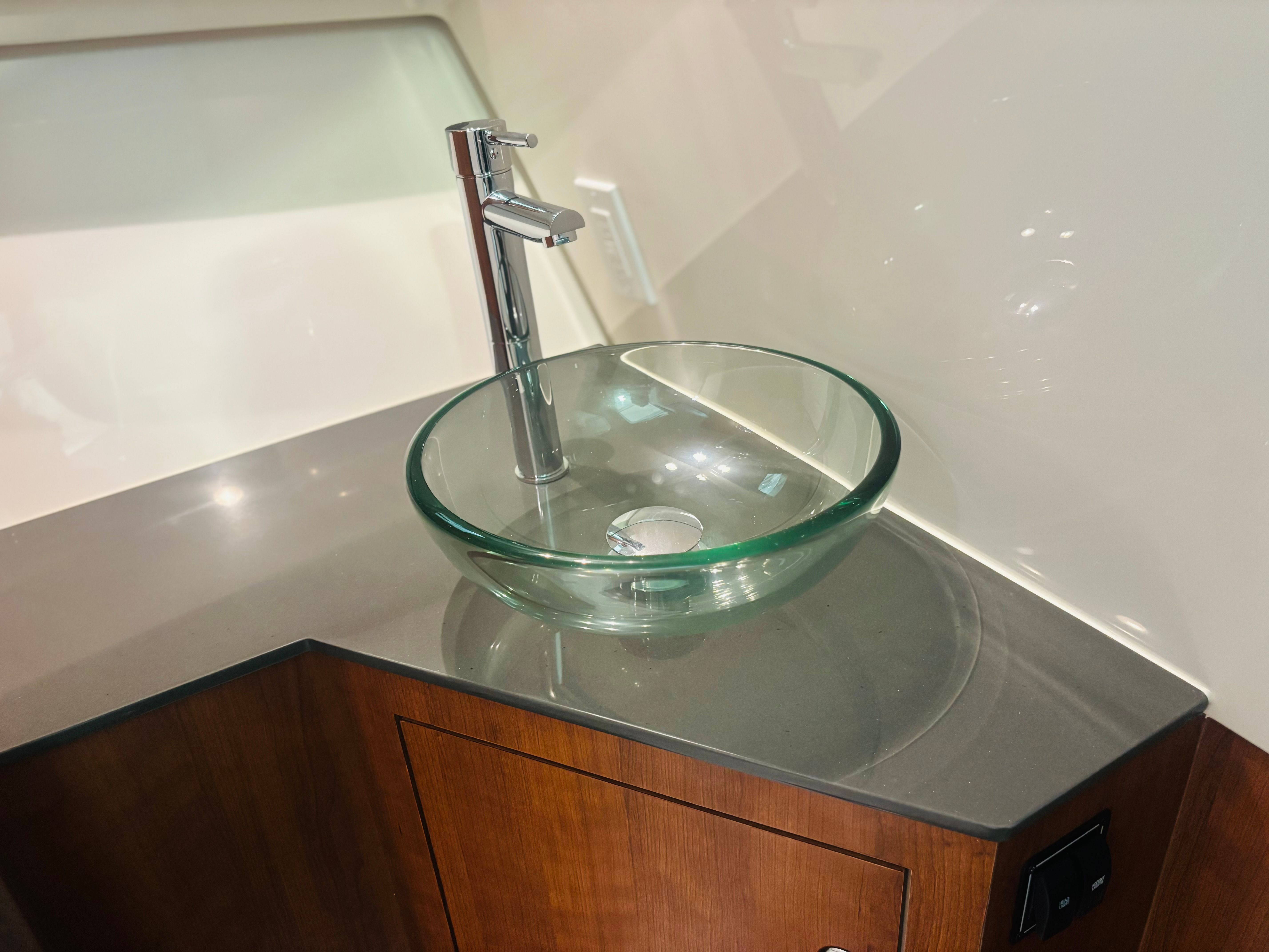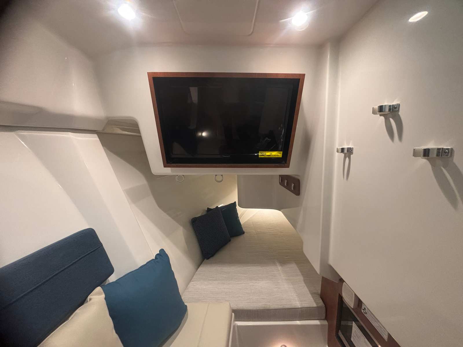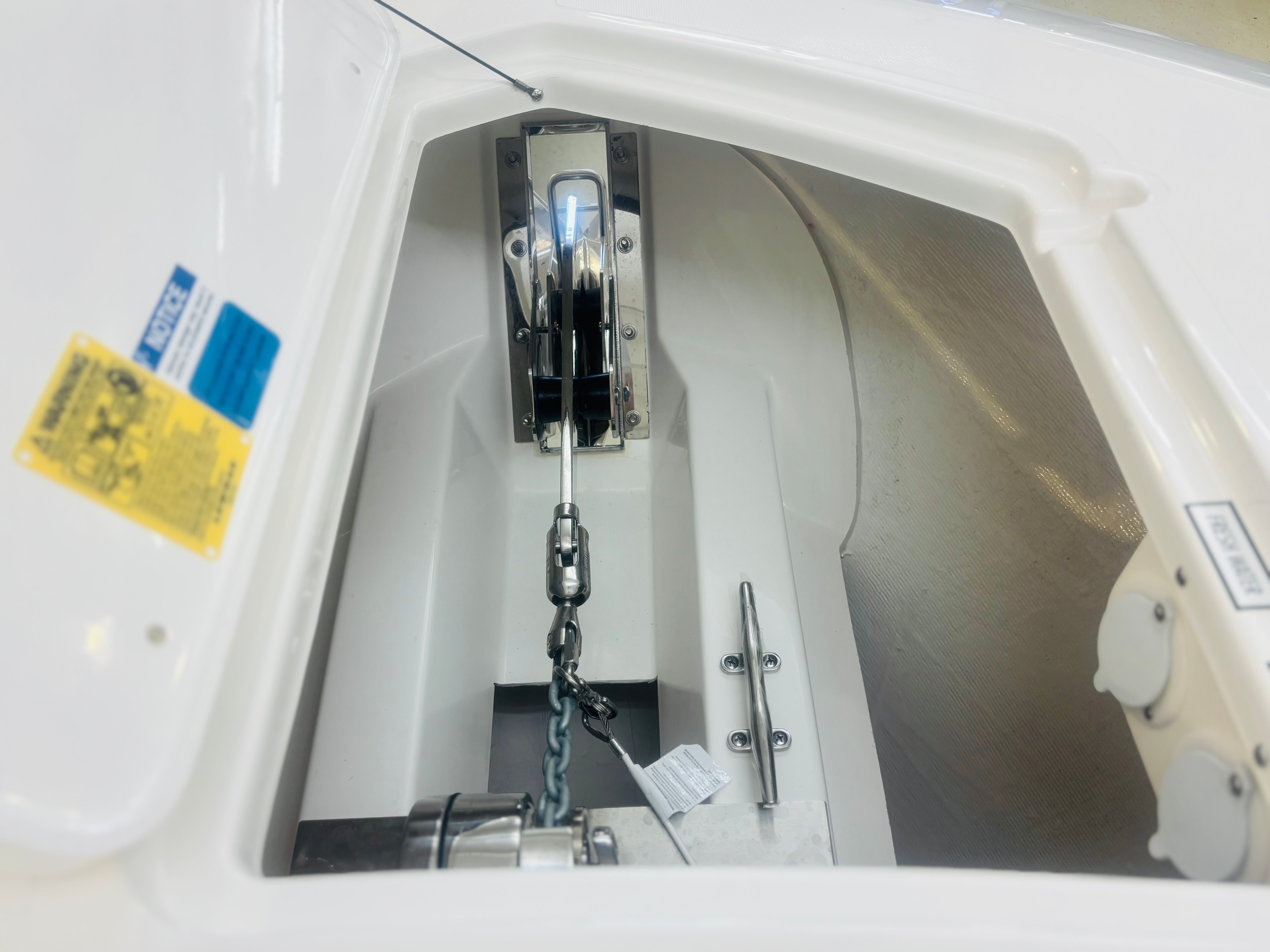 The Pursuit DC 365 is as practical as it is luxurious. The manual engine flushing system streamlines maintenance, helping to extend the life of your engines. The cooler with a chill plate keeps food and beverages fresh, perfect for long days on the water. The stowable sunshades and retractable Makefast sunshade offer flexible protection from the elements, while the teak table and ample seating make it easy to host gatherings or enjoy meals al fresco.Docking and maneuvering are simplified with the Yamaha joystick control and Set Point system, making it easy to handle the boat in marinas or tight spaces. The underwater lights not only enhance the boat’s appearance but also improve visibility and safety during nighttime outings. The spotlight with remote control adds another layer of convenience, ensuring you can navigate confidently after dark.