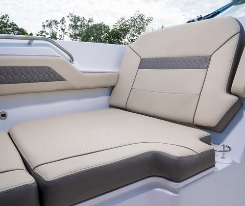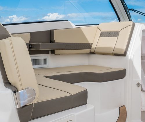 The Pursuit DC 365 is loaded with premium features designed to enhance every aspect of your time on the water. The helm and footrest, finished in Carbon, offer both style and ergonomic comfort, while the hardtop-mounted LED spotlight provides superior visibility during nighttime excursions. The cockpit is equipped with air conditioning, ensuring you stay cool and comfortable even on the hottest days. All Color Spectrum underwater lights create a stunning visual effect, illuminating the water beneath your boat and setting the perfect mood for evening cruises.For those who appreciate high-quality sound, the upgraded amp and speakers with zone control and Sirius capability deliver an immersive audio experience, allowing you to enjoy your favorite music throughout the boat. The Tranquil Sea Interior Package adds a touch of elegance and relaxation, making every moment onboard feel like a luxury getaway.