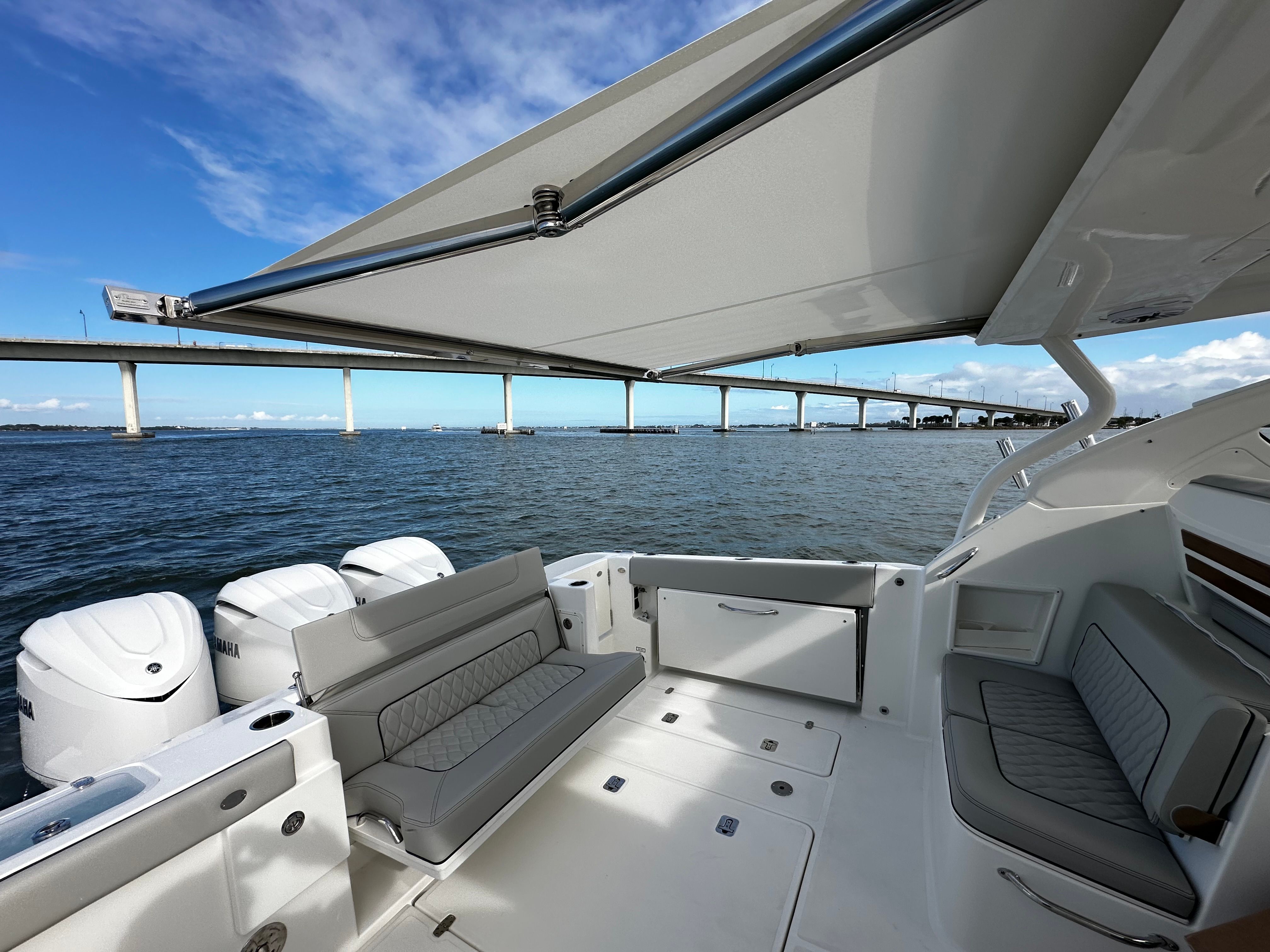 The Pursuit DC 365 is designed with practicality in mind, making ownership easy and enjoyable. The spacious layout provides plenty of room for storing gear, water toys, and essentials, so you’re always prepared for a day on the water. The dual console configuration makes docking and maneuvering straightforward, whether you’re at a busy marina or a secluded cove. The efficient triple Yamaha engines offer reliable performance and fuel economy, allowing you to spend more time exploring and less time refueling.The hardtop-mounted LED spotlight enhances safety and convenience during nighttime operations, while the cockpit air conditioning keeps everyone cool and comfortable. The upgraded audio system ensures that entertainment is always at your fingertips, and the underwater lights make evening outings truly special. Every detail of the DC 365 is designed to make your boating experience as enjoyable and hassle-free as possible.