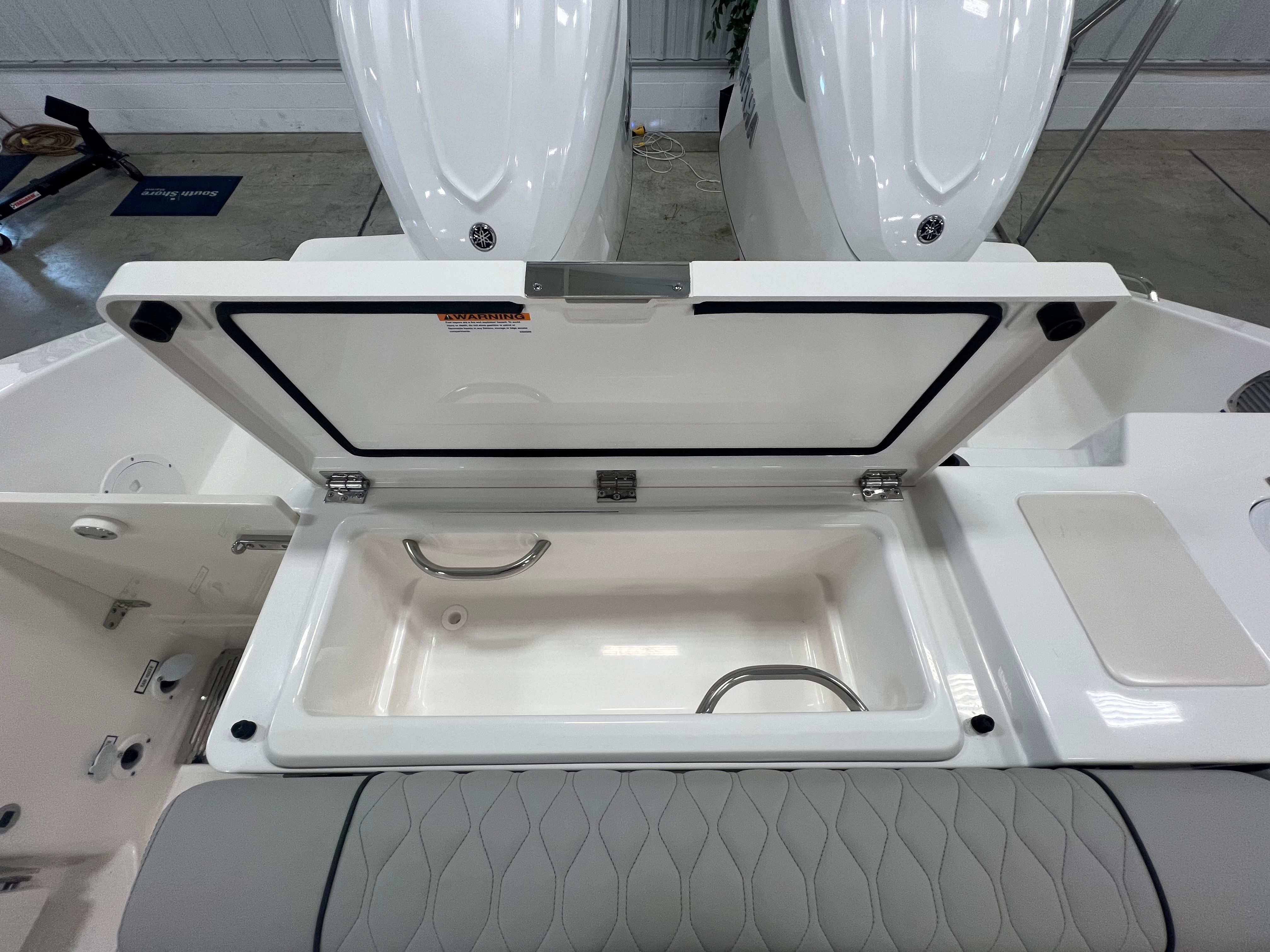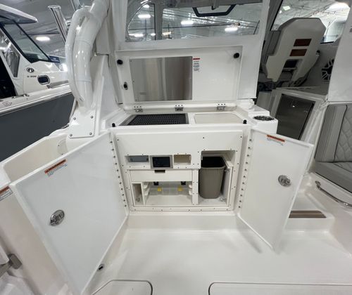 Practicality is at the heart of the Pursuit 325 OS. The dedicated storage solutions for tables and seating ensure that the deck remains clutter-free, making it easy to transition from cruising to entertaining. The folding gunwale seat provides additional seating when needed and can be stowed away to maximize deck space. The integrated electronics and navigation enhancements, such as the GMS 10 Expander for Garmin options, offer peace of mind and convenience for longer journeys or unfamiliar waters.Docking and maneuvering are made simple thanks to the boat's agile design and responsive controls. The efficient twin-engine setup not only delivers impressive power but also contributes to fuel efficiency, allowing you to spend more time on the water and less time at the fuel dock. The Pursuit 325 OS is built for easy maintenance and long-lasting performance, ensuring that your investment continues to deliver value and enjoyment for years to come.