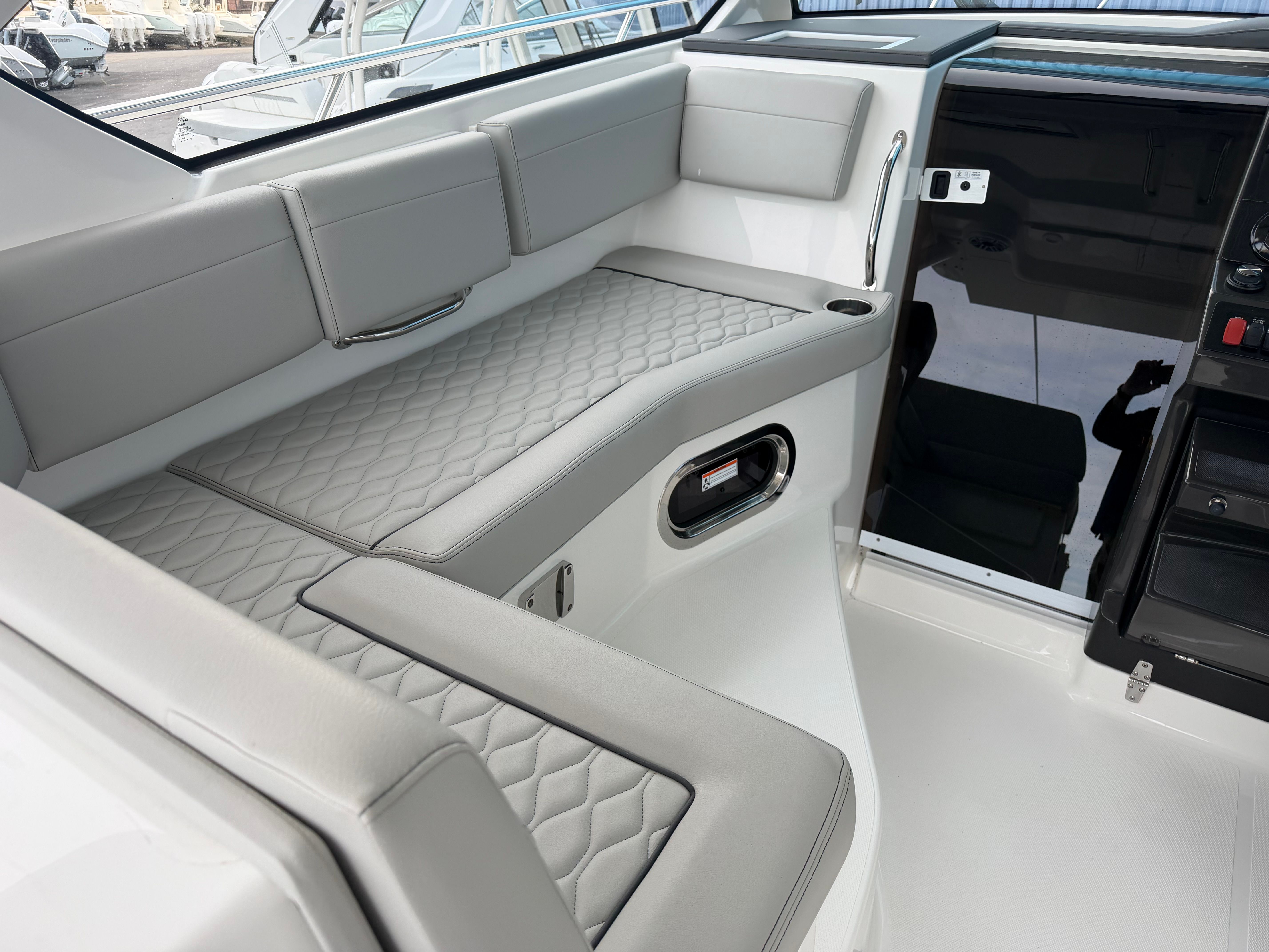 Step aboard the Pursuit OS 325 and discover a world of premium features designed to enhance every moment on the water. The Carbon hull color and Black bootstripe create a bold, contemporary aesthetic, while the Black canvas and Carbon helm/footrest add a touch of sophistication to the cockpit. The interior, finished in the elegant Tranquil Sea palette, provides a serene retreat from the elements.Enjoy alfresco dining or cocktails with friends around the bridgedeck teak table, which comes with dedicated storage for convenience and safety. Both the cabin and cockpit are equipped with air conditioning, ensuring comfort no matter the weather or season. These thoughtful touches make the OS 325 a true home away from home, whether you are anchored in a quiet cove or entertaining guests at the dock.