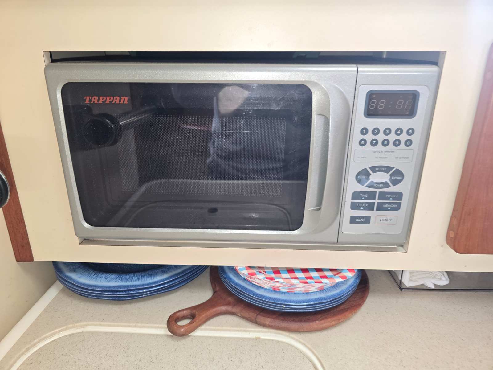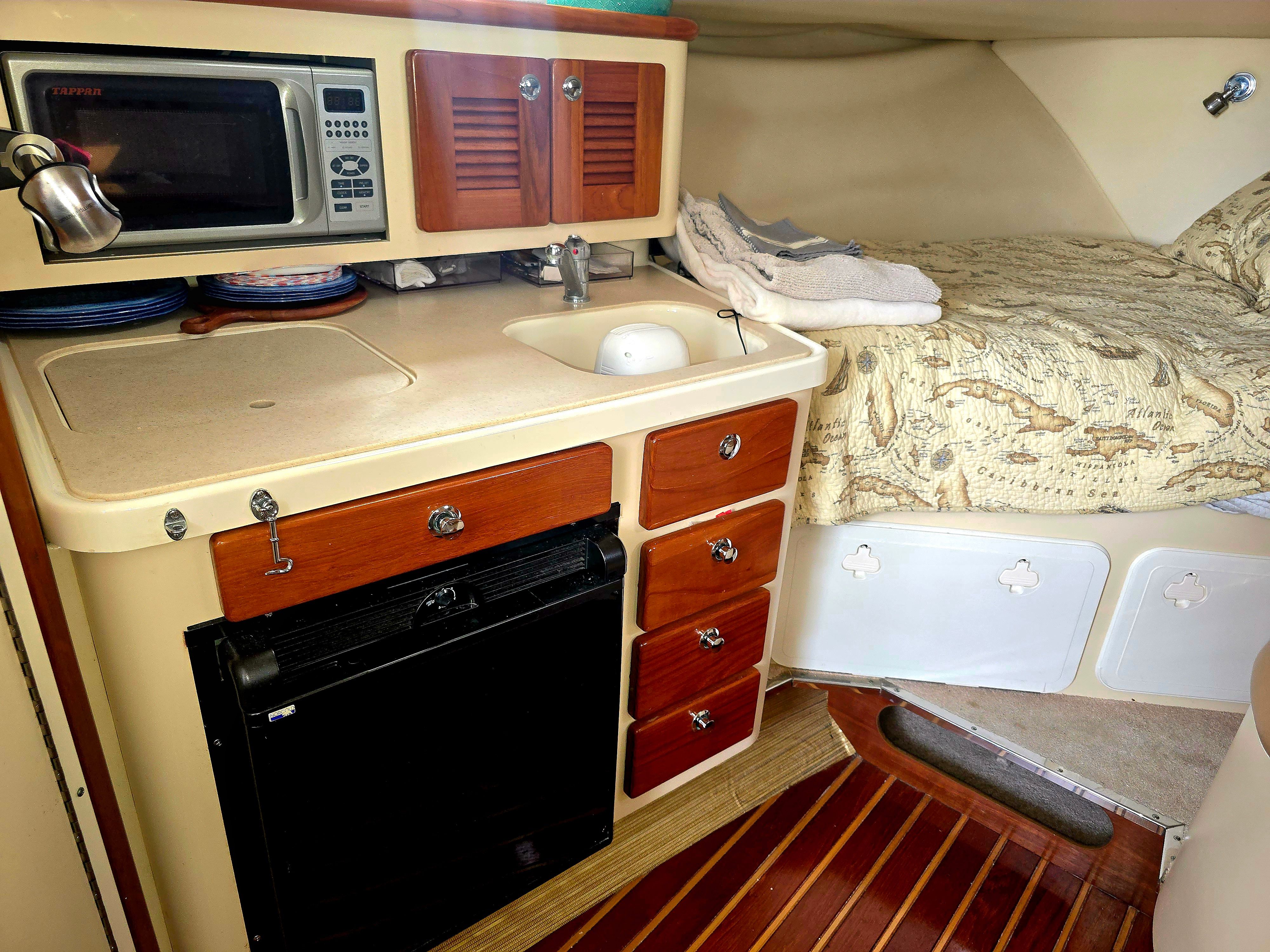 Cabin: Sleeps 2-4, featuring a V-berth, convertible dinette, galley with microwave and refrigerator, and a Vacu Flush head.